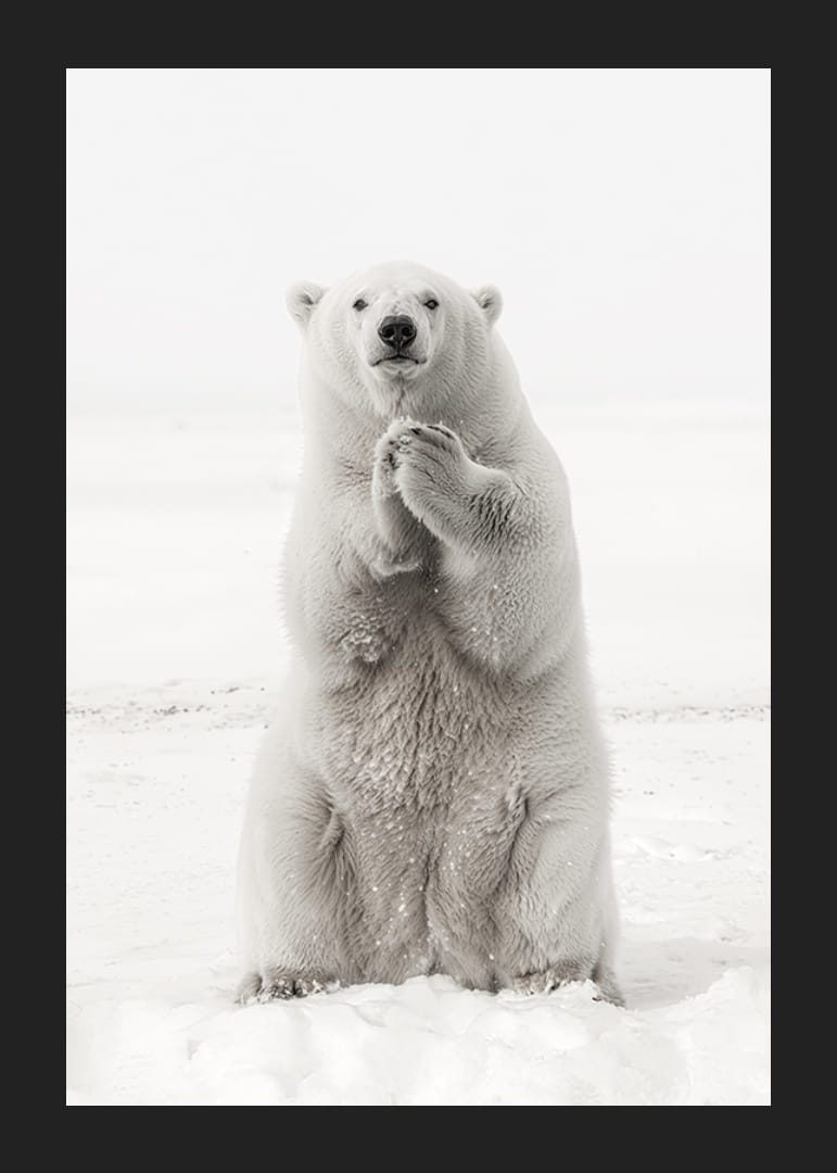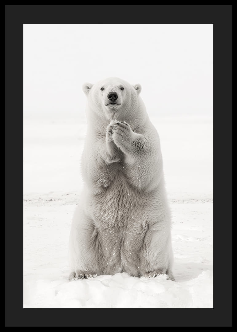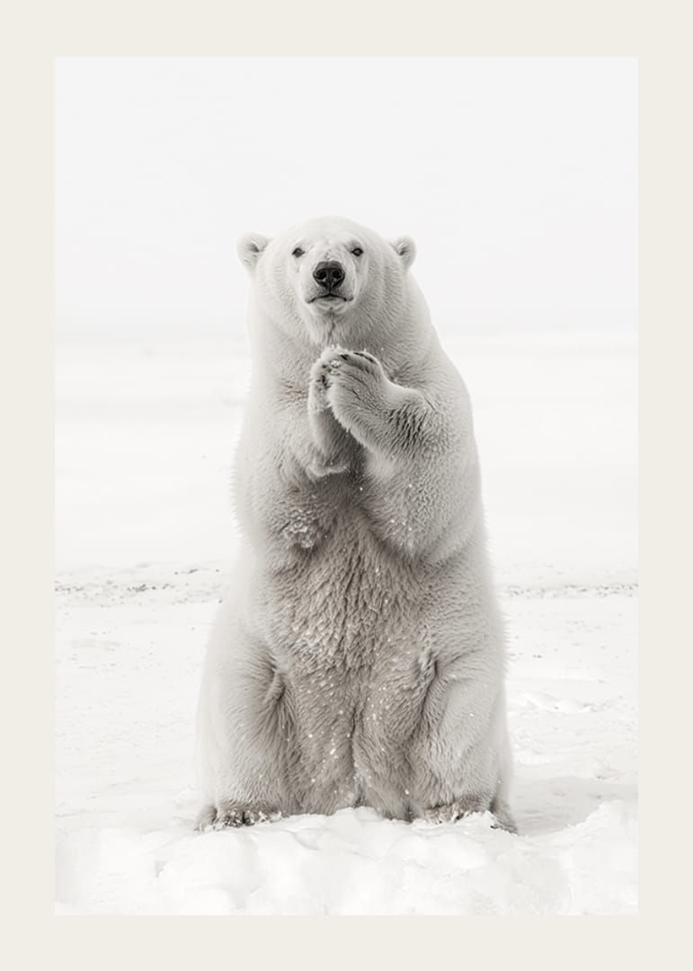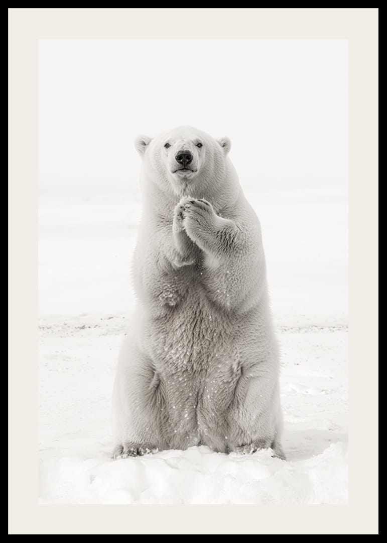 Upplev Arktis skönhet och kraft med denna imponerande poster. Bilden visar en majestätisk isbjörn som står upprätt i det snötäckta landskapet, en symbol för styrka och charm i en av världens mest avlägsna miljöer. Perfekt för dig som vill omge dig med den arktiska vildmarkens rofyllda närvaro. En hyllning till den nordliga vildmarkens väktare och naturens fantastiska överlevare.
