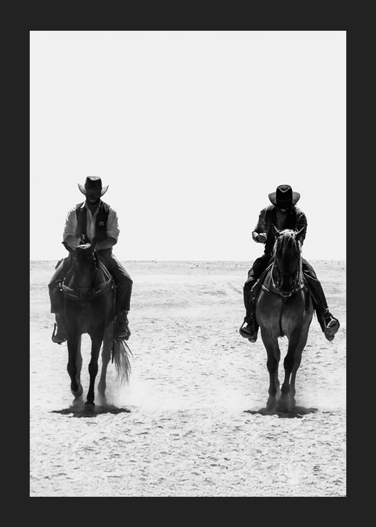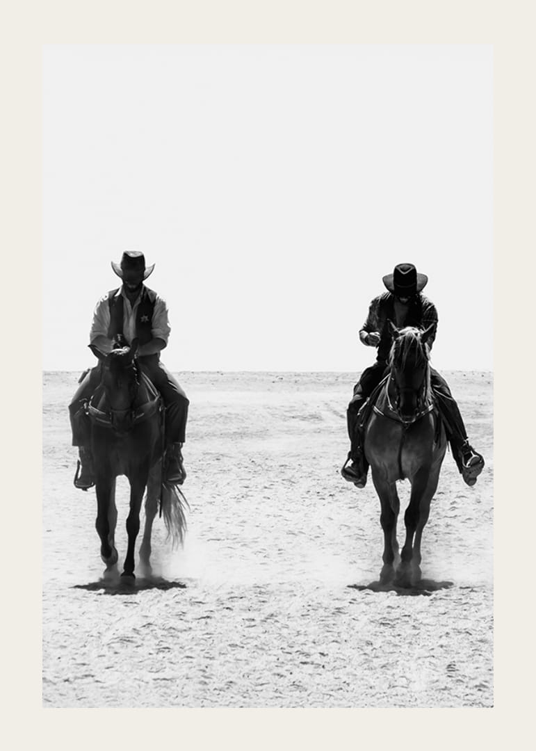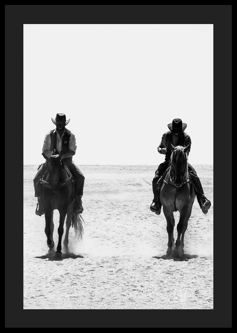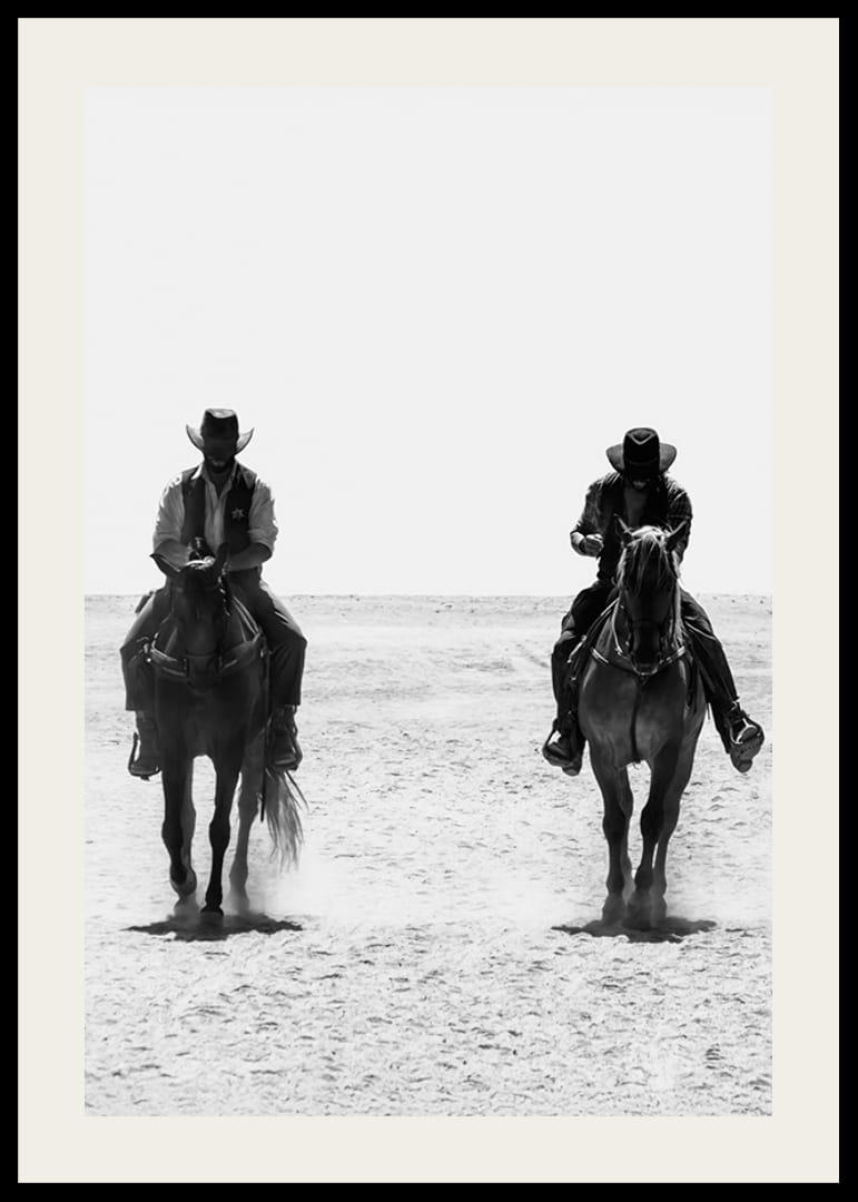 Fånga den klassiska vilda västern-känslan med denna stilrena poster i svartvitt. Två cowboys rider sida vid sida över ett dammigt landskap, deras silhuetter avtecknar sig mot horisonten och för tankarna till äventyr, ensamhet och obeveklig frihet. Perfekt för den som fascineras av westerns tidlösa charm och vill skapa en atmosfär av rå styrka och mystik i sitt hem.