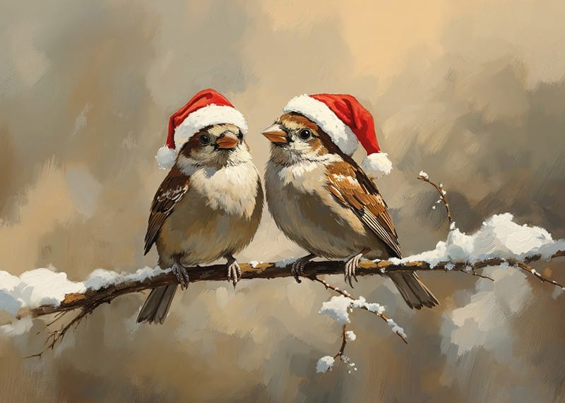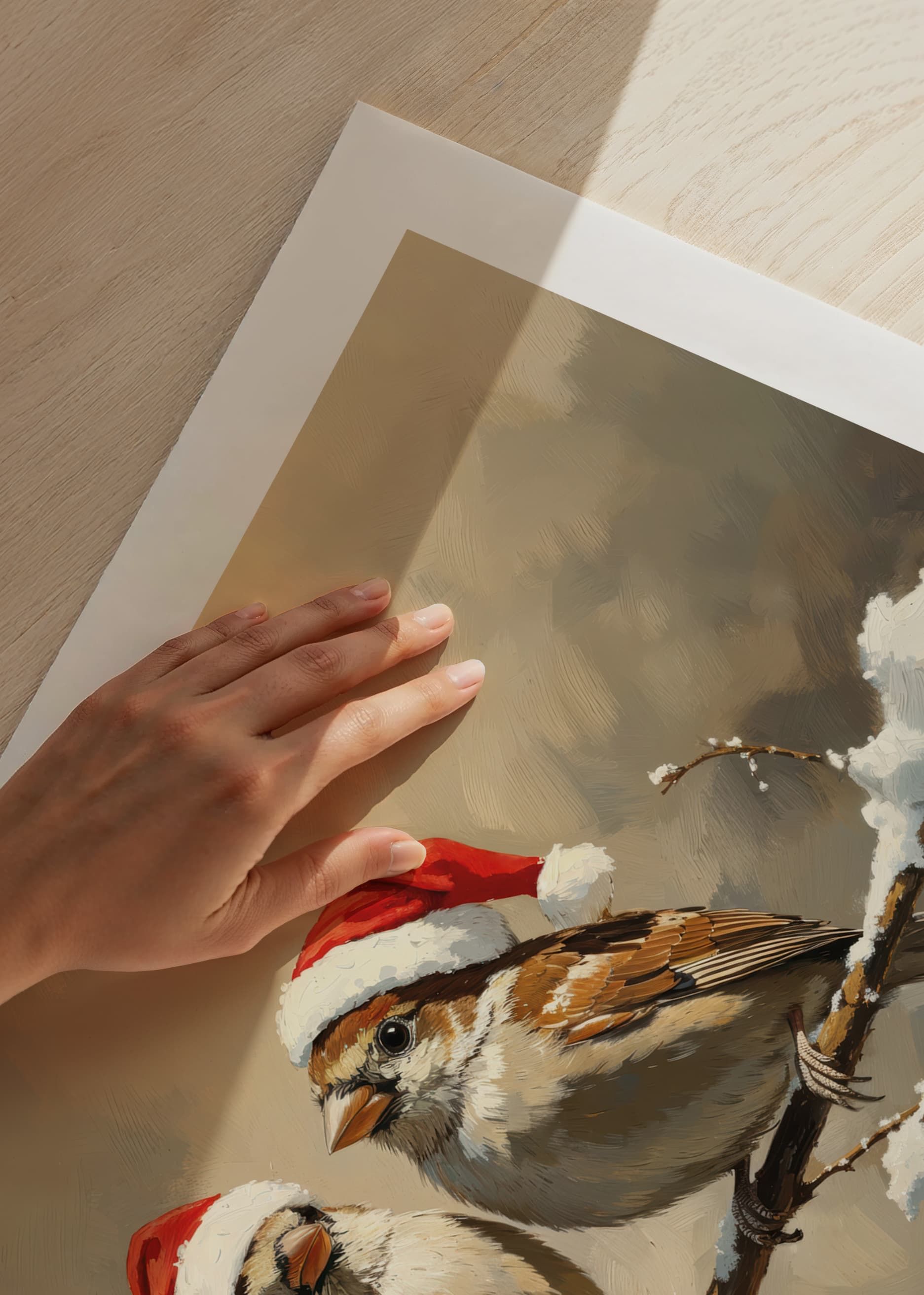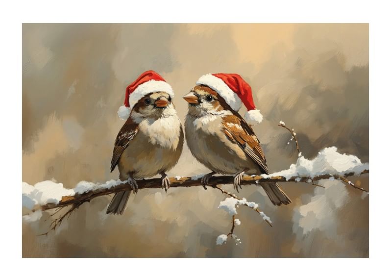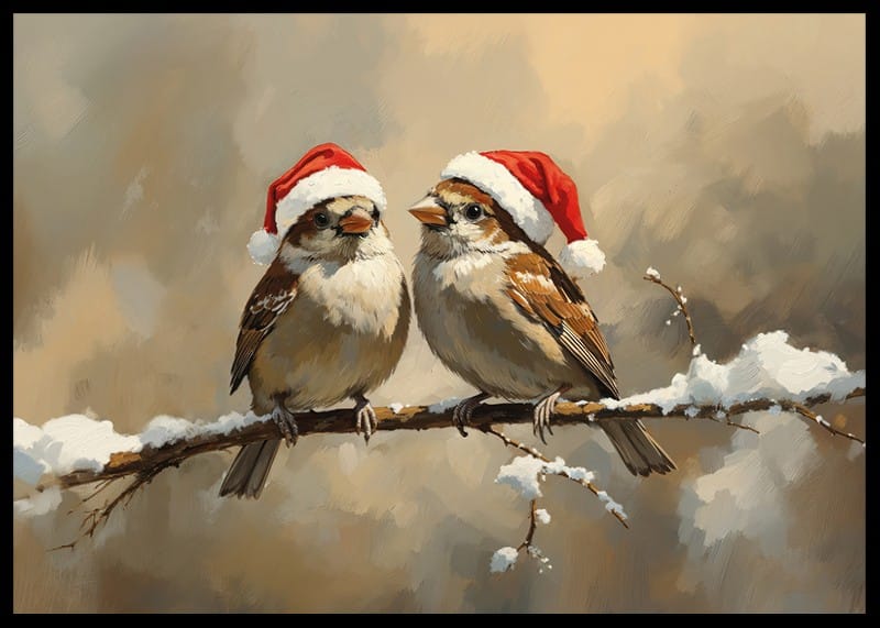 Denna poster sprider julglädje med två söta sparvar iförda tomteluvor, sittande på en snötäckt gren. Deras charmiga uttryck och festliga huvudbonader skapar en lekfull och hjärtlig stämning som är perfekt för att liva upp ditt hem i juletid. Låt dessa små julfåglar bjuda in till skratt och värme – en underbar dekoration för att fira högtiden med en glimt av naturens egen charm.