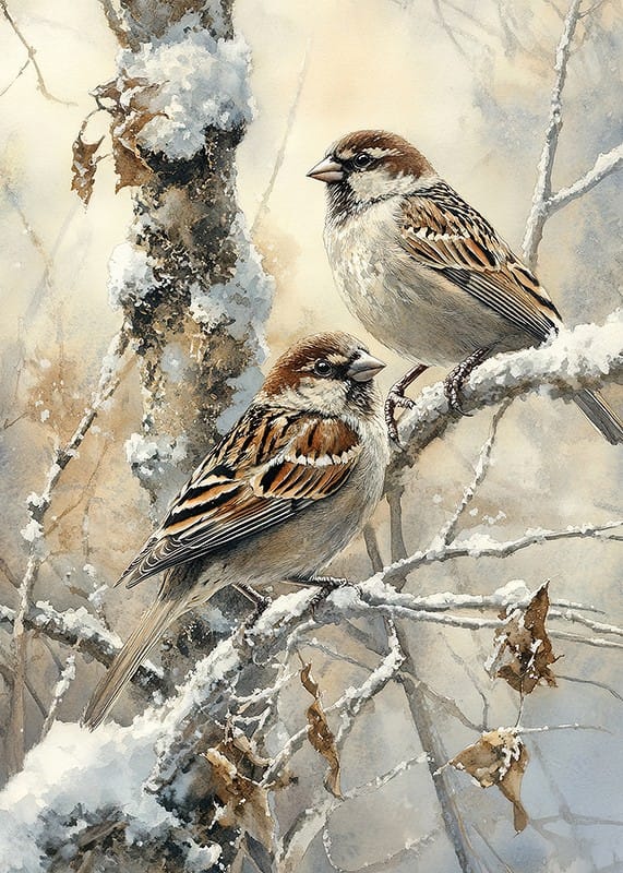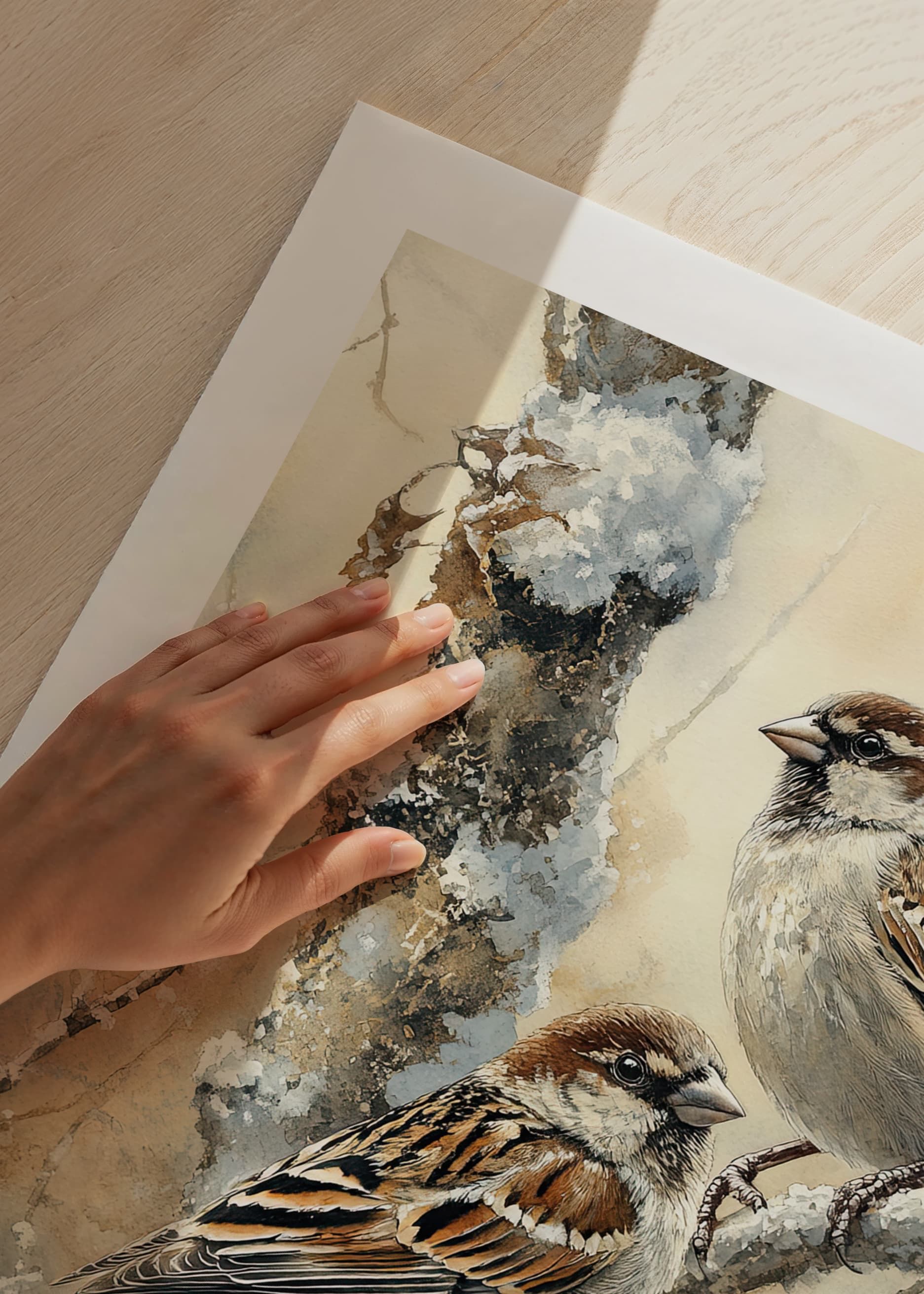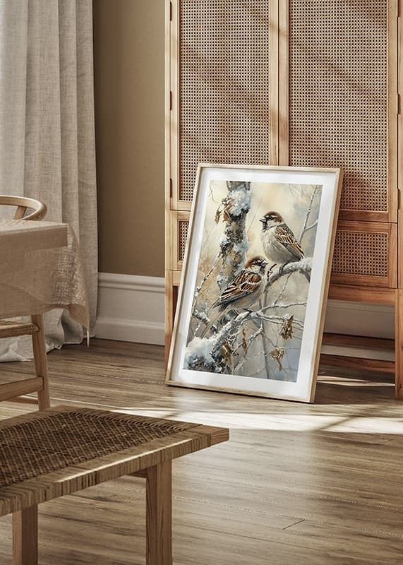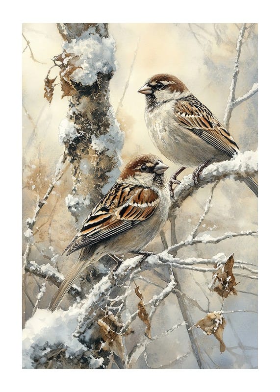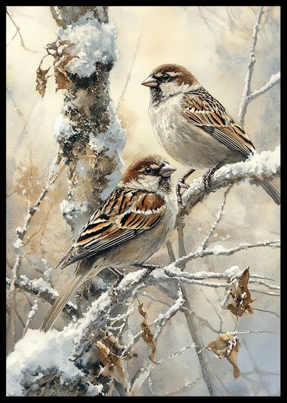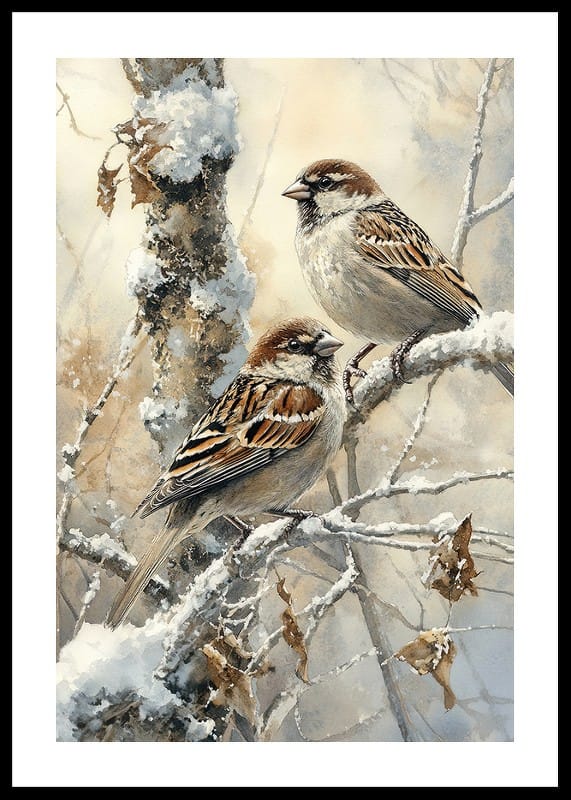 Denna poster fångar vinterns lugn med två sparvar som sitter på en snötäckt gren i ett frostigt landskap. Bilden utstrålar naturens enkla skönhet och stillhet, perfekt för att skapa en rofylld atmosfär i hemmet. Låt denna bild bli en påminnelse om vinterns fridfulla charm och fåglarnas trofasta närvaro, även under de kalla månaderna – en tidlös dekoration som förmedlar värme och harmoni.