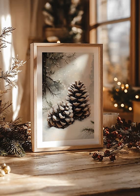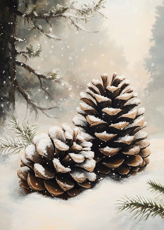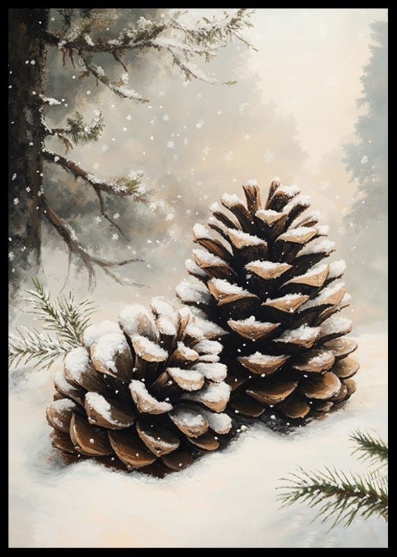 Denna poster fångar skogens stillhet med två stora kottar täckta av ett lager gnistrande snö, omgivna av mjuka grenar i ett frostigt landskap. Bilden utstrålar en enkel och naturlig skönhet som påminner om vinterns lugna charm och magi. Perfekt för att skapa en rogivande och jordnära atmosfär i hemmet – en hyllning till naturens små detaljer och vintertidens fridfulla stunder.