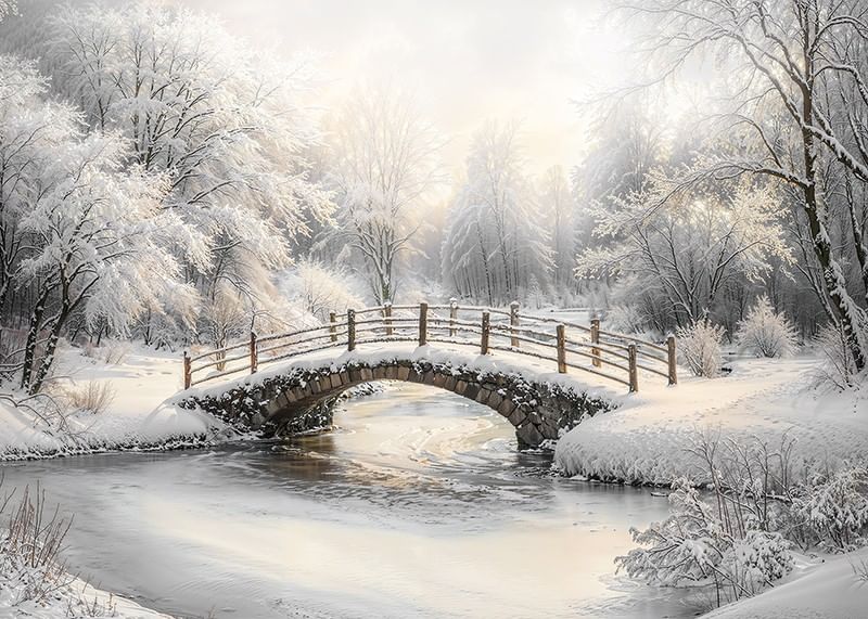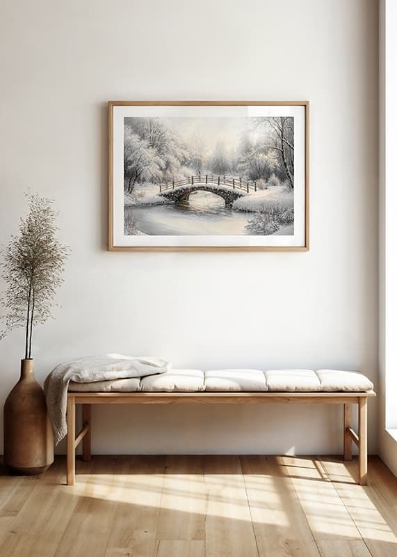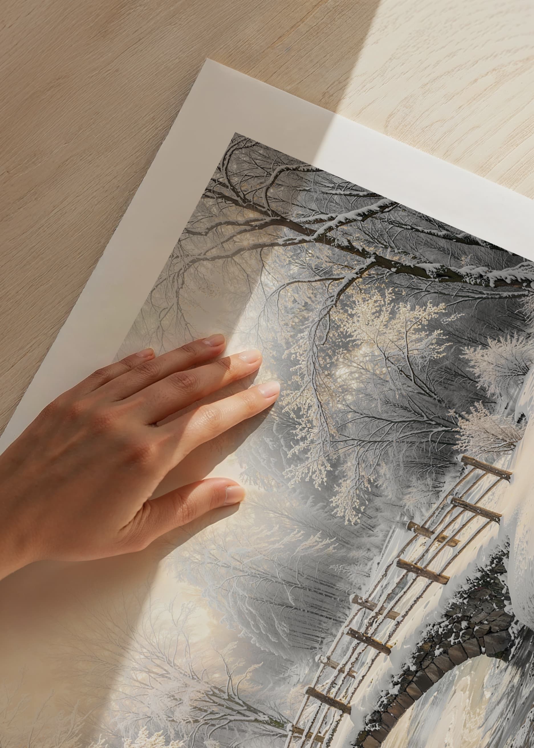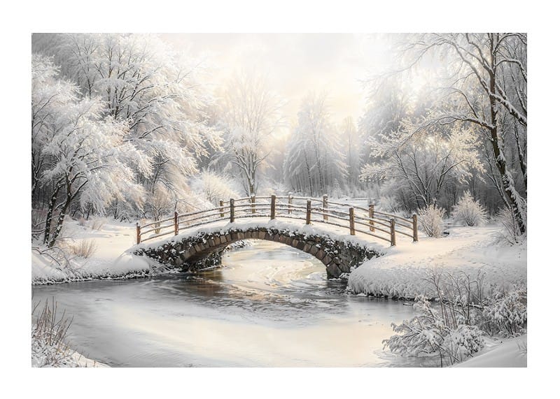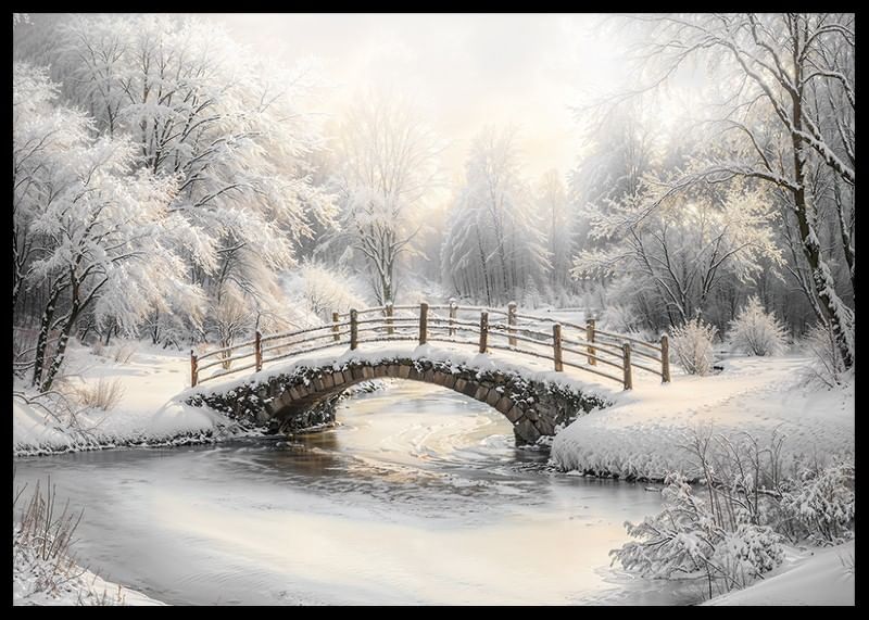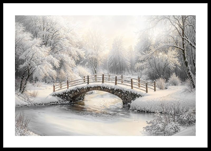 Denna poster fångar ett vinterlandskap som hämtat ur en saga, med en snötäckt stenbro över en frusen bäck omgiven av frostiga träd i mjukt vinterljus. Scenen utstrålar stillhet och magi, perfekt för att skapa en rofylld och drömlik atmosfär i hemmet. En bild som påminner om vinterpromenader i naturen, där skönheten i det enkla och tidlösa blir en påminnelse om vinterns förtrollande charm.