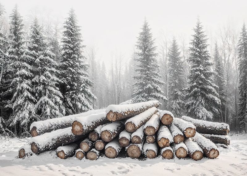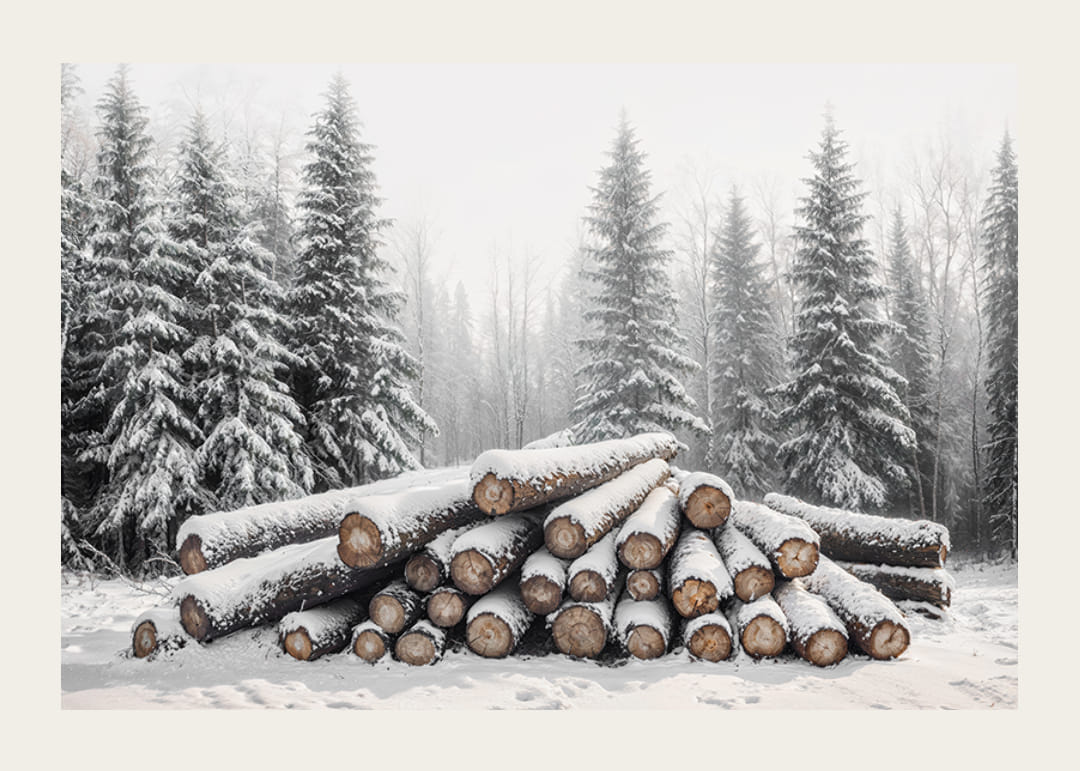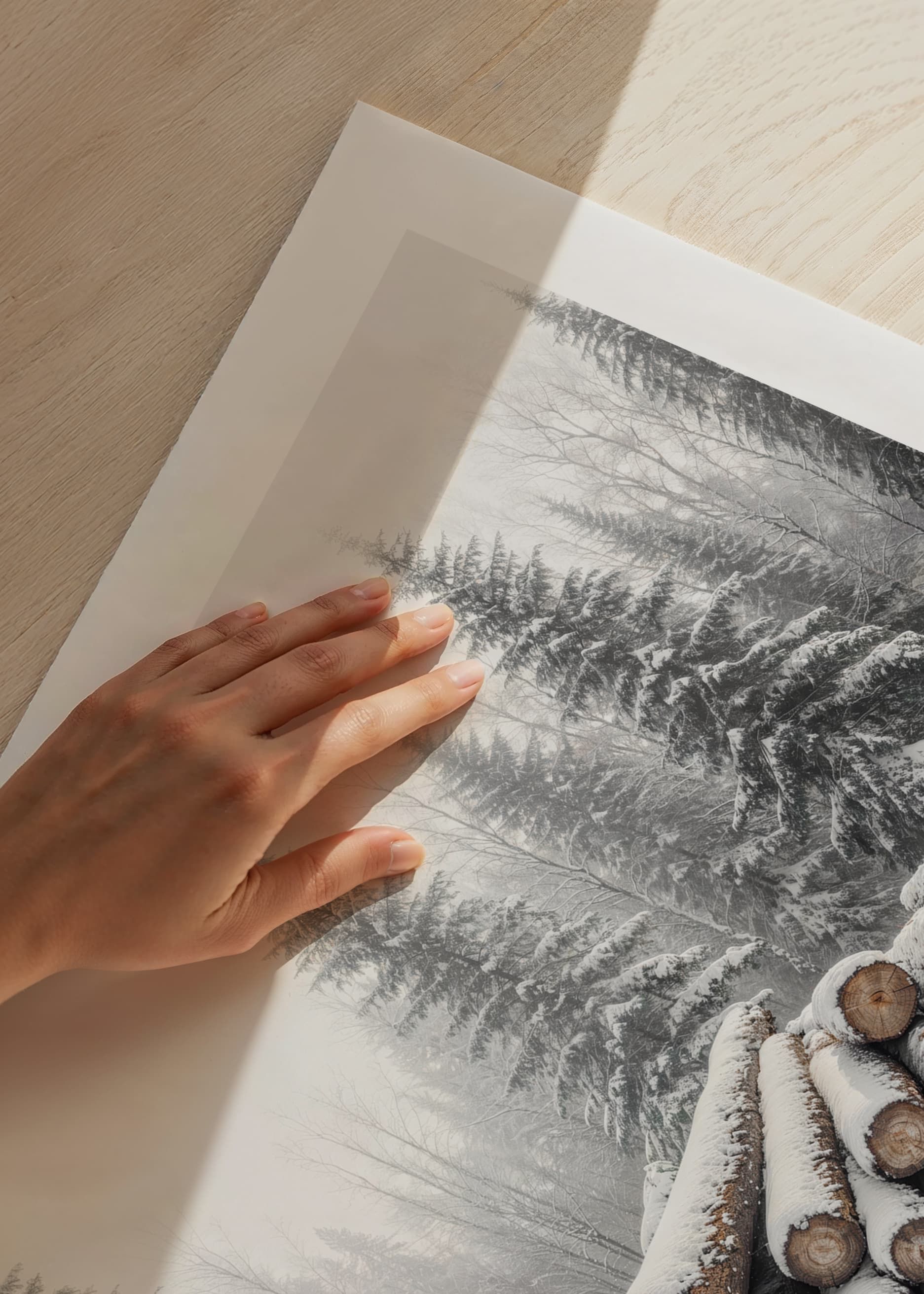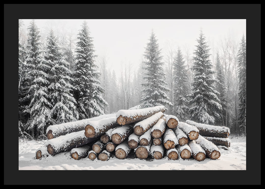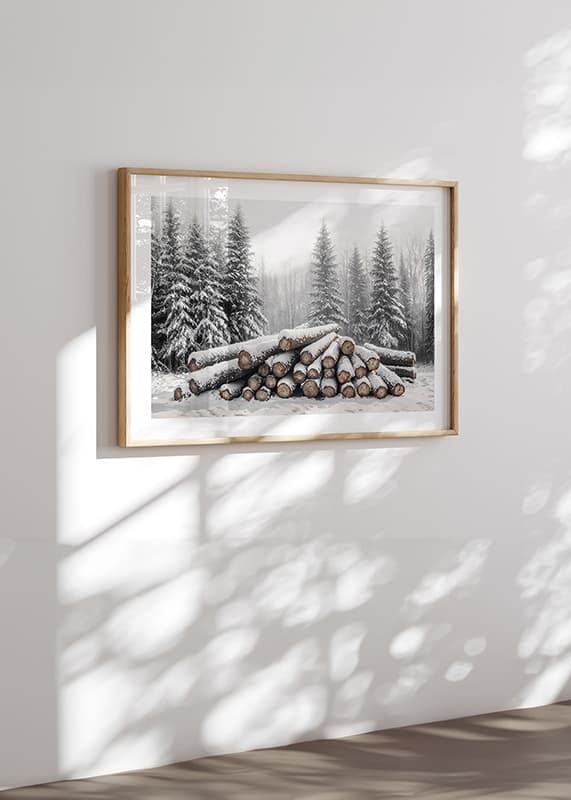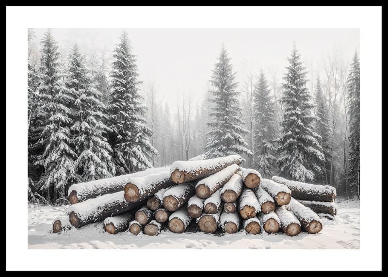 Denna poster fångar den stilla skönheten i vinterns skog, med en stapel snötäckta timmerstockar omgivna av frostklädda granar. Det är en bild av naturlig enkelhet och rå kraft som förmedlar känslan av tystnad och lugn i det nordiska vinterlandskapet. Perfekt för att skapa en rustik och harmonisk atmosfär i hemmet, denna bild påminner om naturens tidlösa charm och vinterns magi.