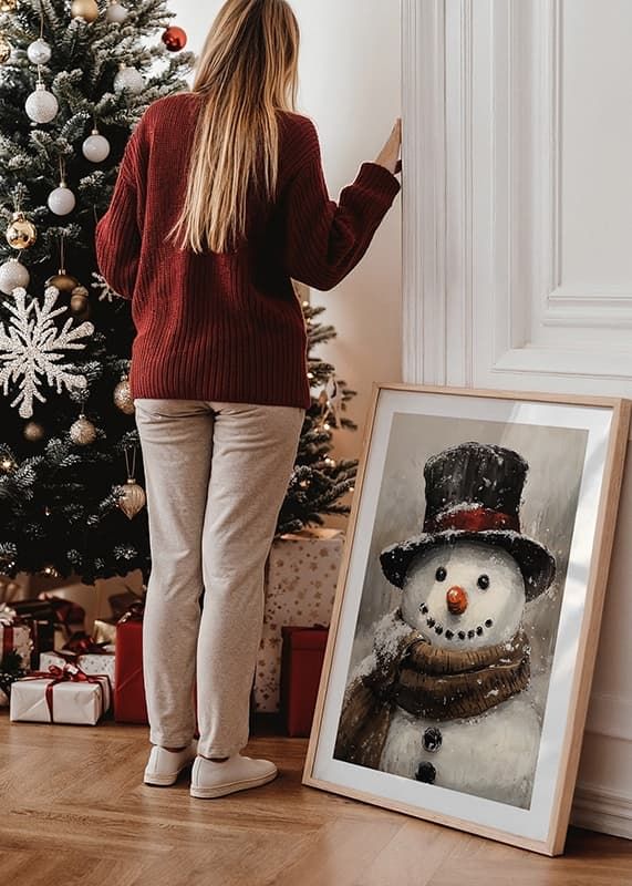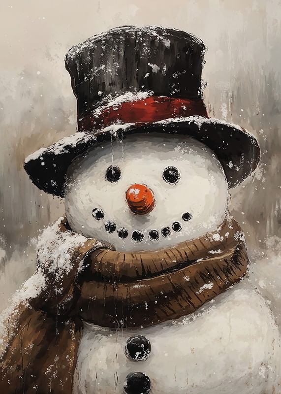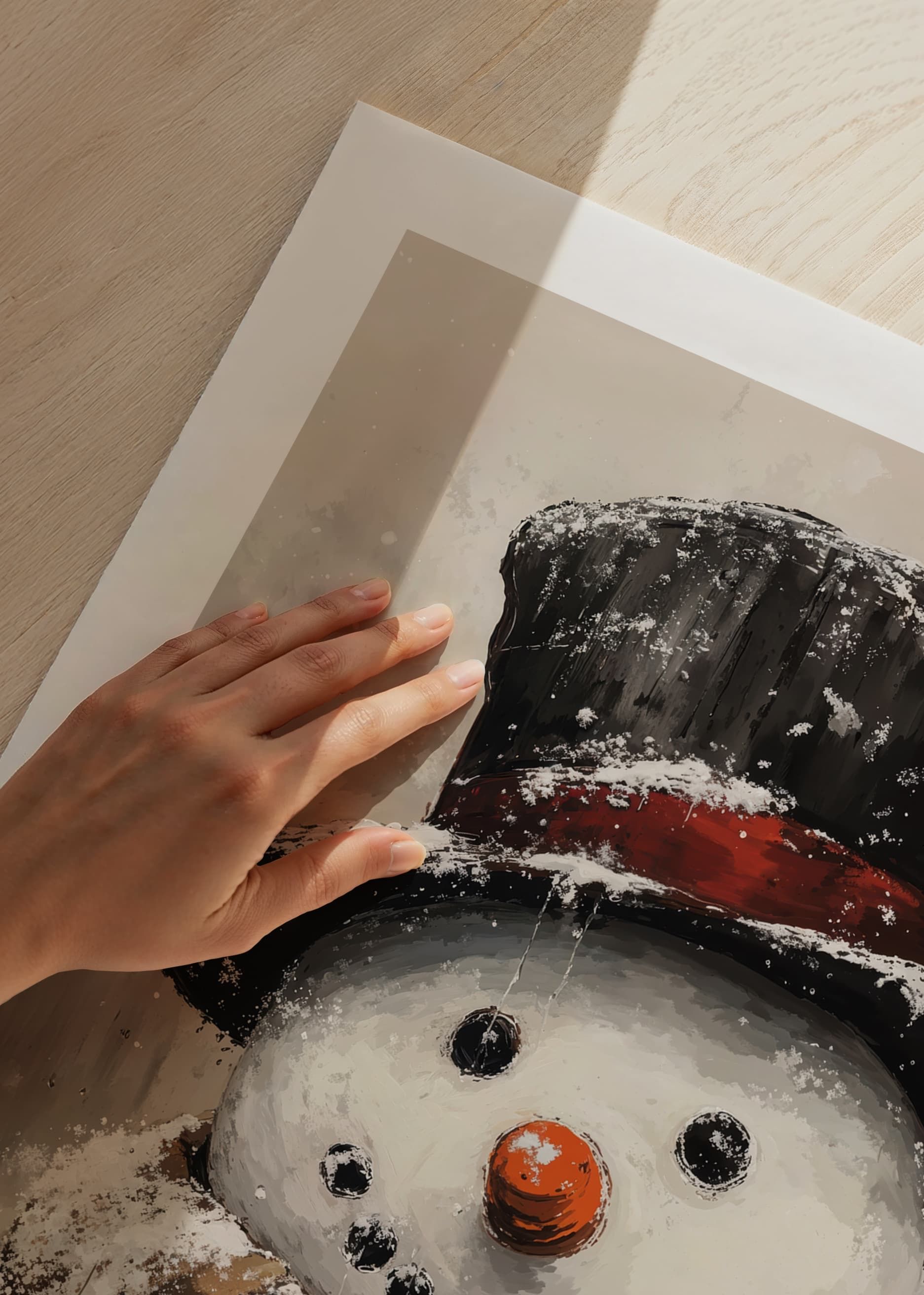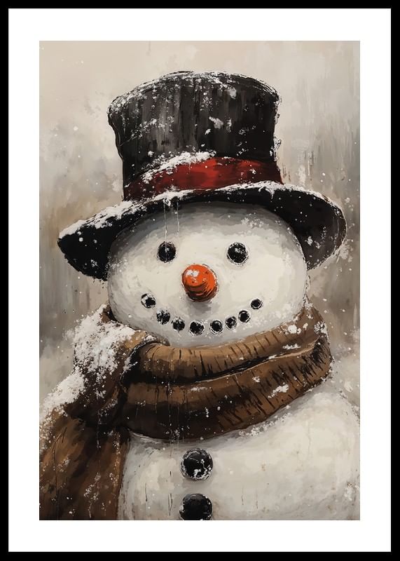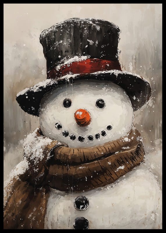 Denna poster fångar vinterns glädje med en klassisk snögubbe iklädd hög hatt och varm halsduk, dekorerad med snö och ett vänligt leende. Den charmiga snögubben sprider julstämning och nostalgi, perfekt för att skapa en mysig atmosfär i hemmet under vintern. Låt denna bild påminna om barndomens vinterlekar och de magiska ögonblick som hör julen till – en tidlös dekoration för både stora och små.