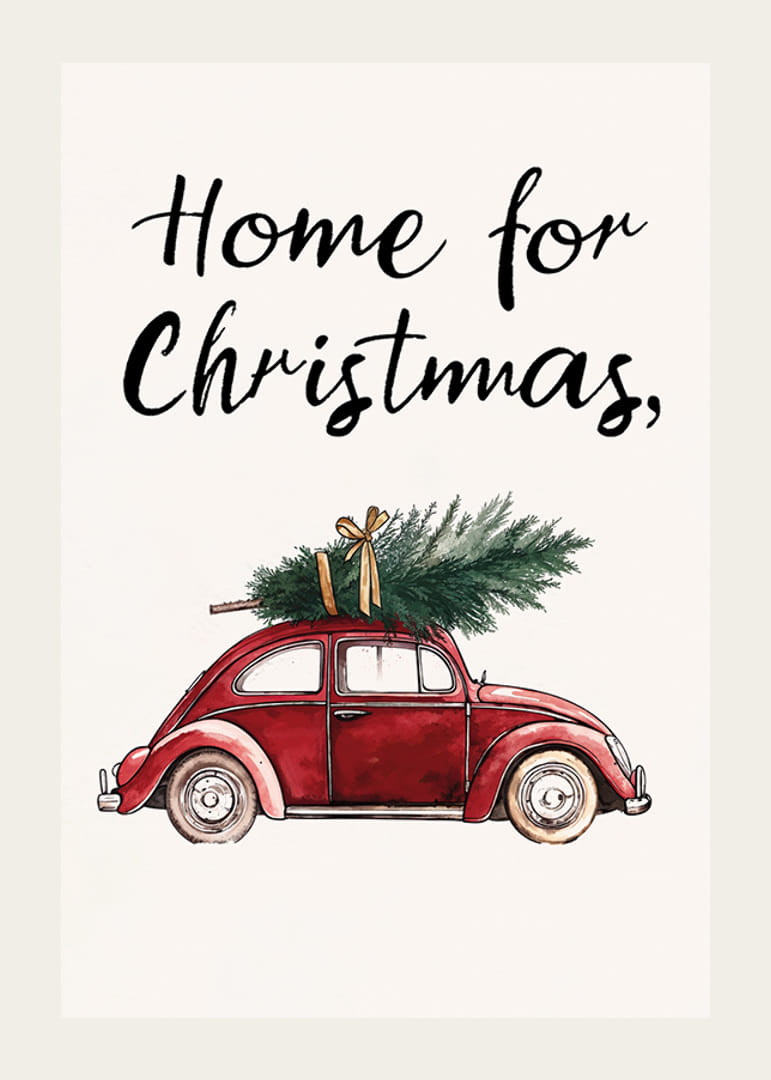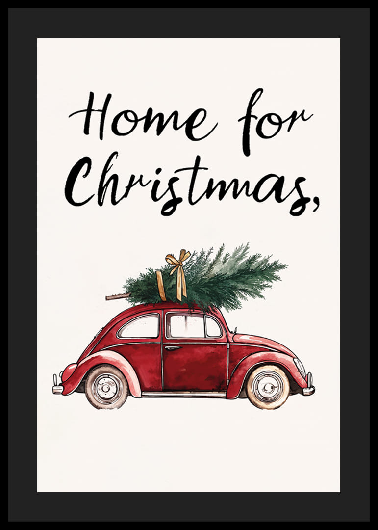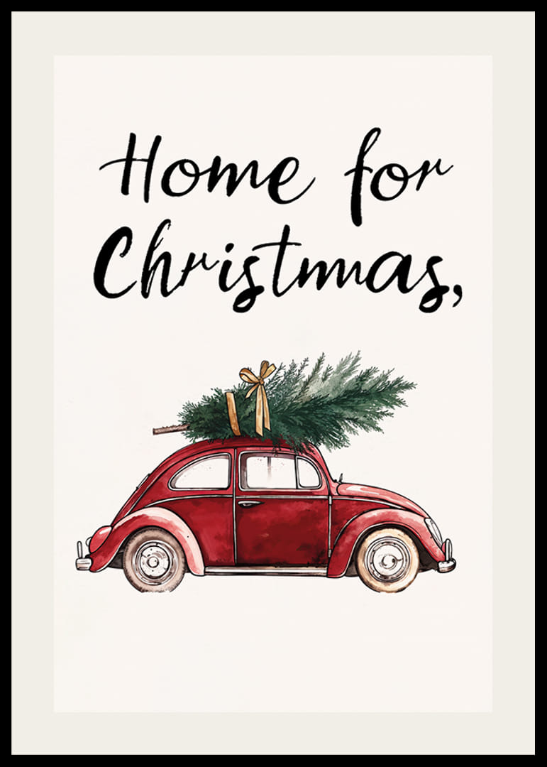 Denna charmiga poster fångar essensen av julen med en röd vintagebil som transporterar en grön julgran hemåt, tillsammans med texten "Home for Christmas." Med en stilren och nostalgisk design sprider den känslan av hemkomst och familj, perfekt för att skapa julstämning i alla rum. Den här postern blir en påminnelse om julens glädje och de varma minnen som följer med traditionerna varje år.