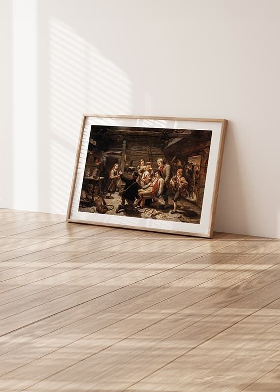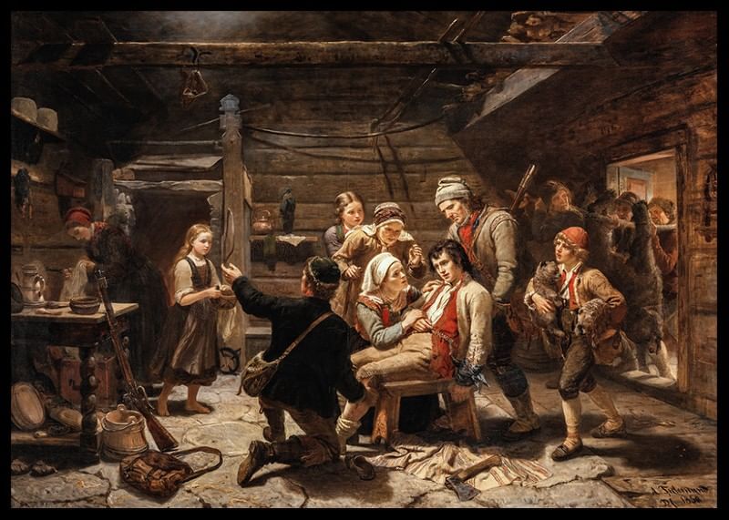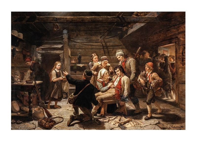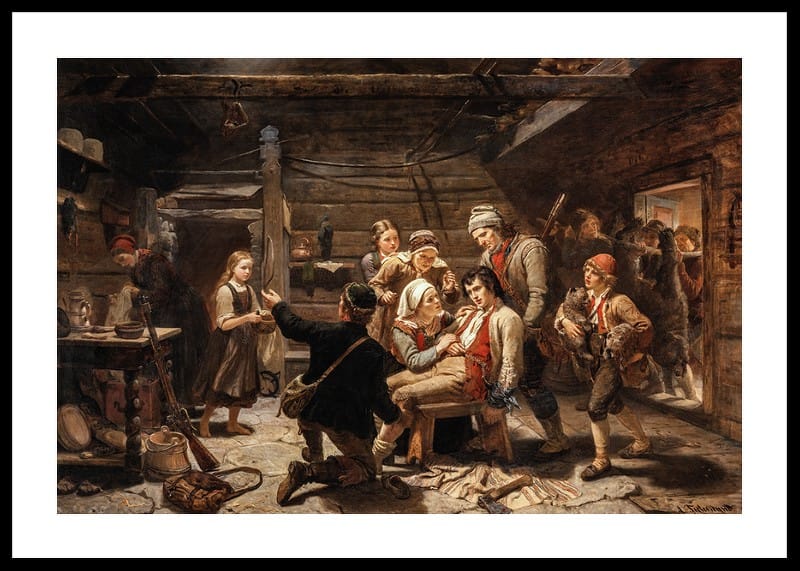 Poster från kategorin historisk konst med målningen "Bjørnejegerens hemkomst" av den norska konstnären Adolph Tidemand från år 1858.