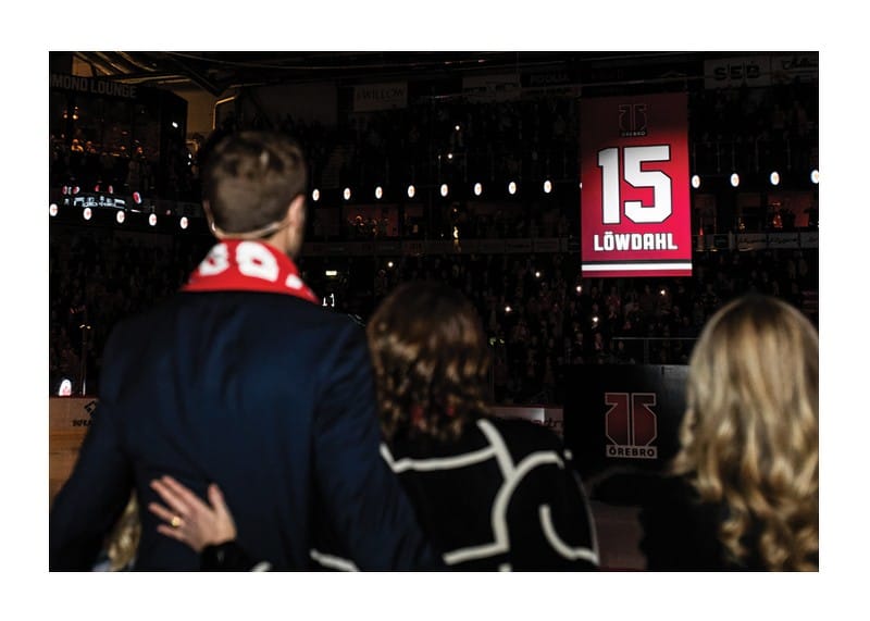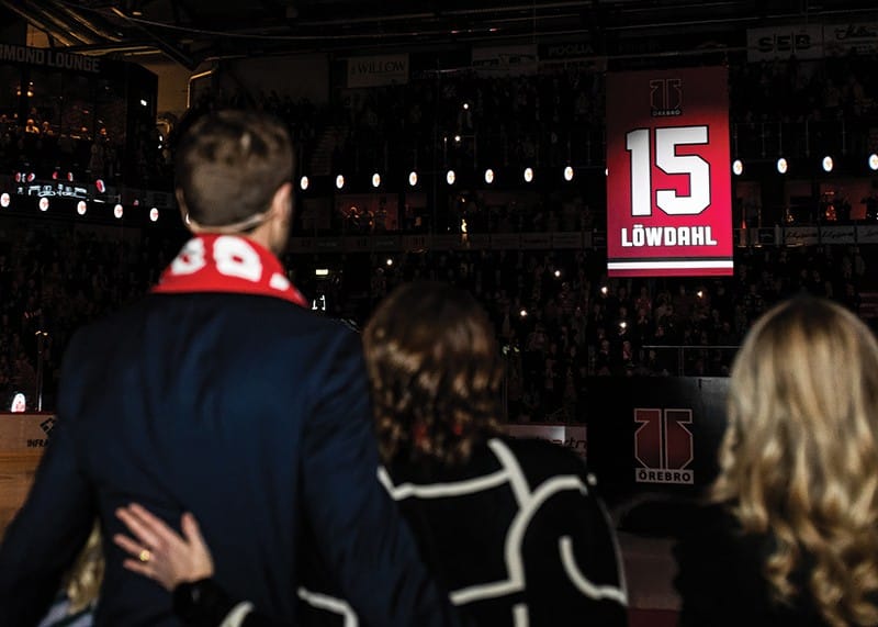 Tidigare örebrospelaren Henrik Löwdahl får sin tröja hissad inför ishockeymatchen i SHL mellan Örebro och Rögle den 19 november 2022 i Örebro.