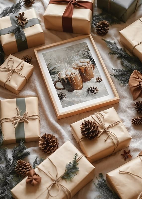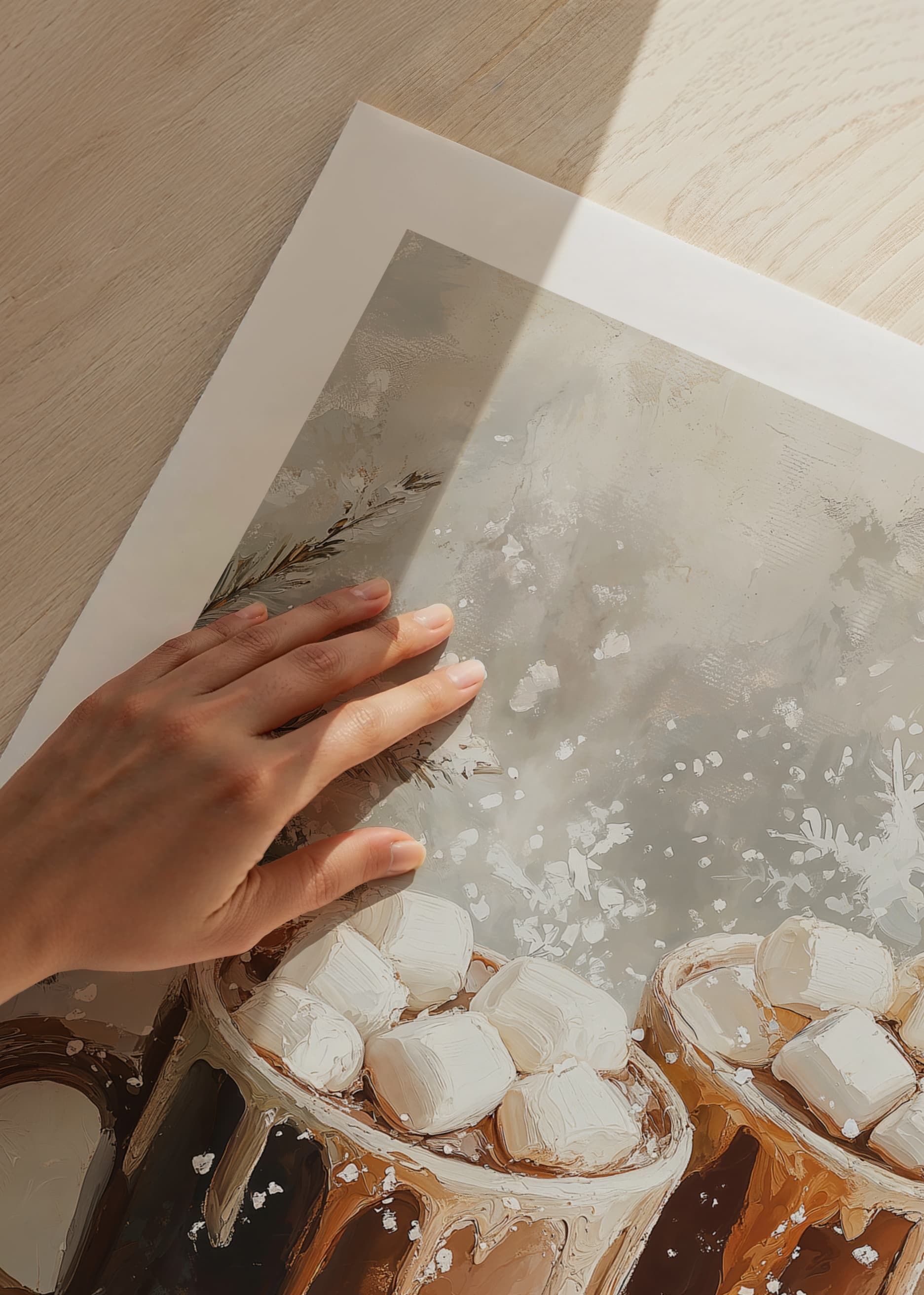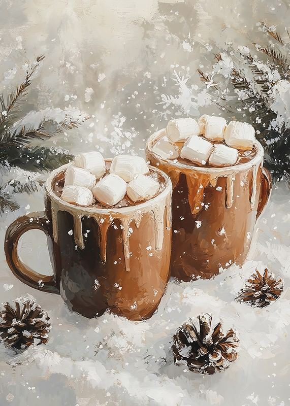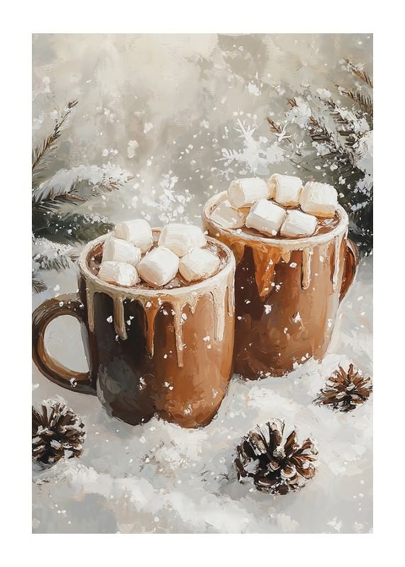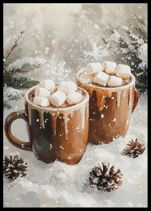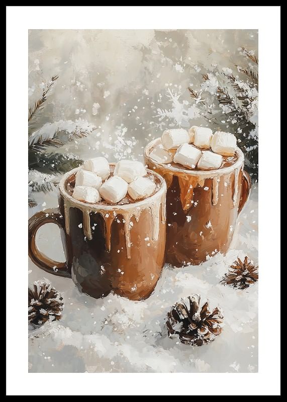 Värm upp vinterkänslan i ditt hem med denna inbjudande poster! Bilden visar två ångande koppar varm choklad, toppade med fluffiga marshmallows, omgivna av snöklädda grenar och kottar. Denna poster fångar den perfekta vinterstämningen med sin mjuka, frostiga atmosfär och är idealisk för att skapa en mysig och hemtrevlig känsla. Perfekt för alla som älskar vinterns enkla njutningar och varm choklad!