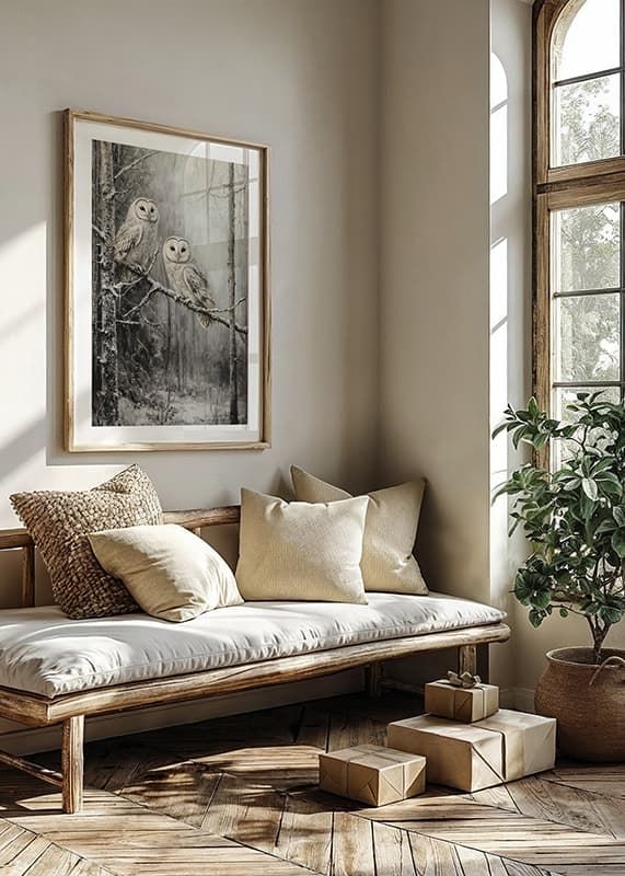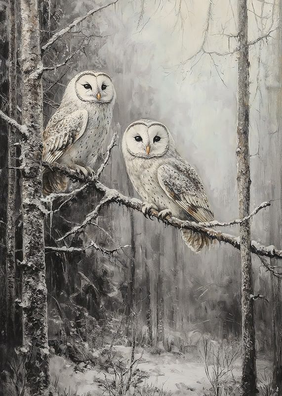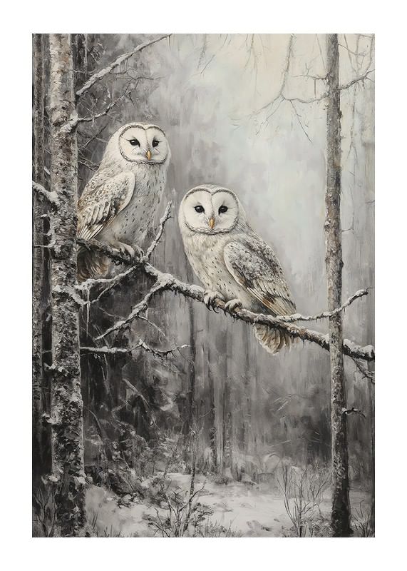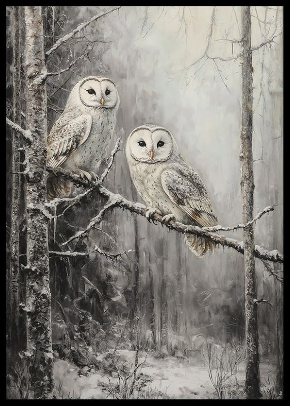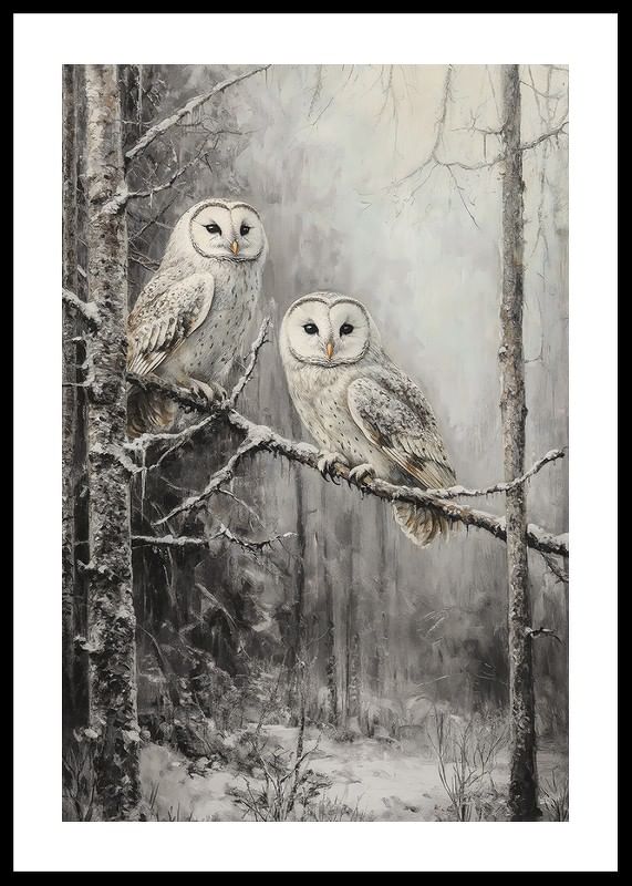 Fånga skogens mystik med denna vackra poster! Två ugglor sitter tätt tillsammans på en snötäckt gren, omgivna av en tyst och frostig vintervärld. Deras klara blickar och fjädrarnas detaljerade mönster framhäver naturens skönhet och stillhet. Perfekt för att skapa en känsla av lugn och förundran i hemmet, denna poster är ett måste för naturälskare och de som uppskattar vinterns magiska stämning.