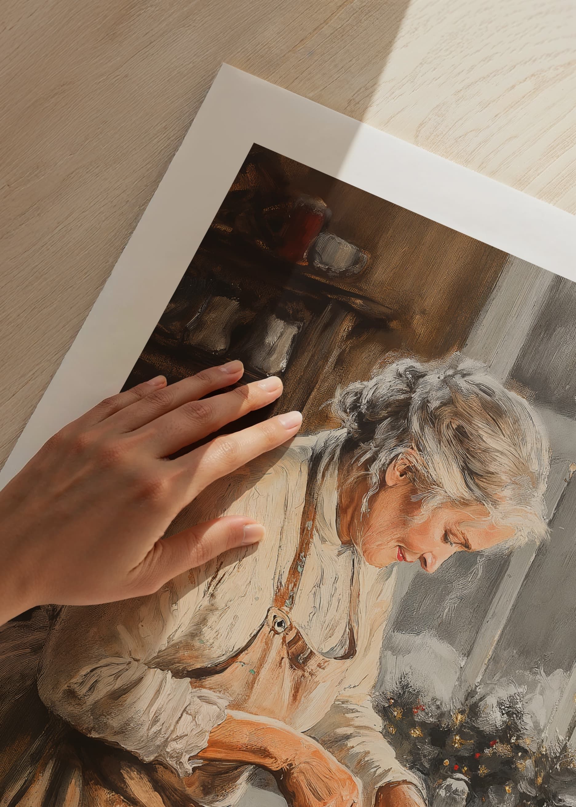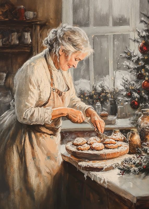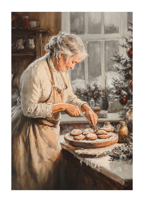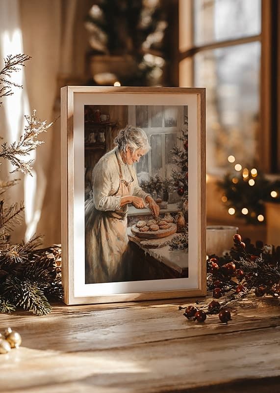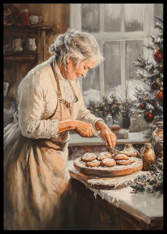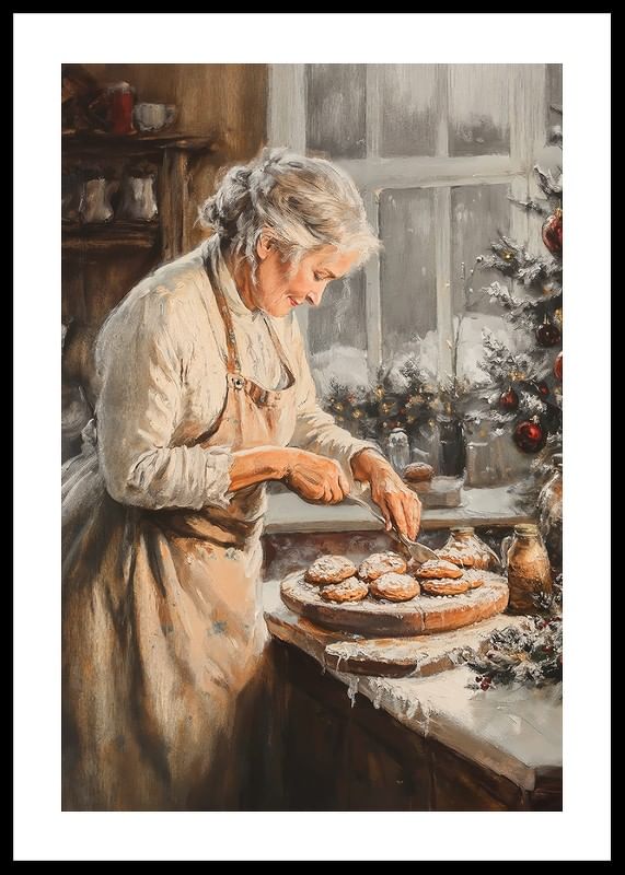 Fånga julens nostalgi med denna underbara poster! Bilden visar en kärleksfull mormor i ett mysigt kök, upptagen med att baka julens godsaker. Omgiven av doften av nybakat och en vackert dekorerad gran i bakgrunden, förmedlar scenen en varm och hemtrevlig atmosfär. Perfekt för att sprida julkänsla och påminna om traditioner och familjegemenskap under årets mysigaste tid.