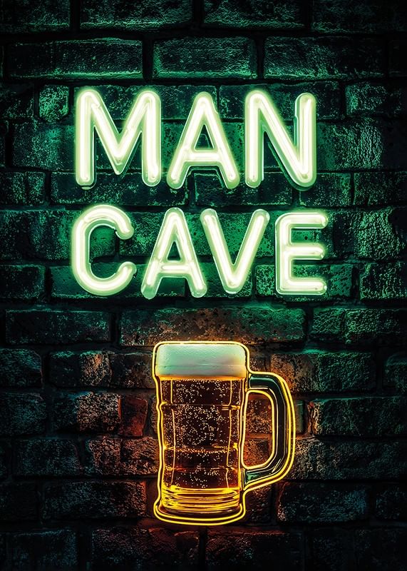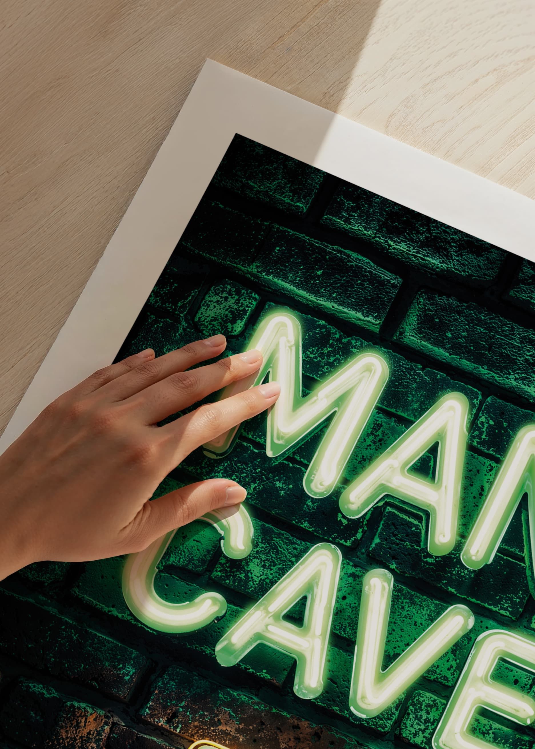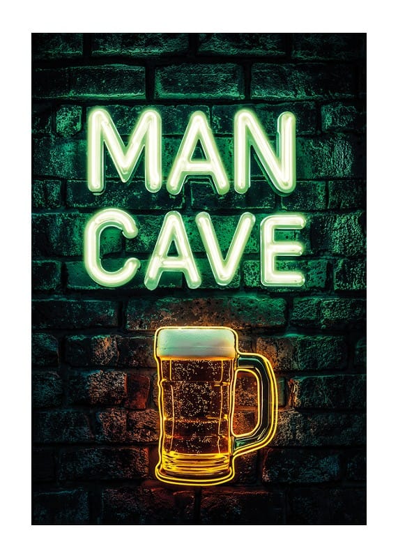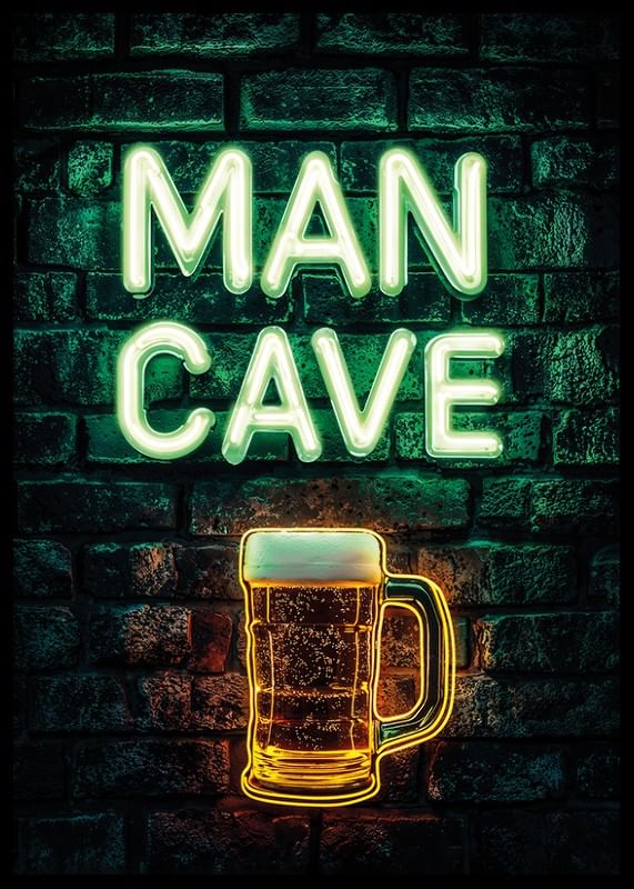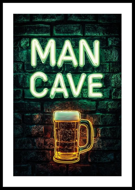 Skapa den ultimata stämningen i ditt hem med vår exklusiva "Man Cave"-poster. Den lysande neontexten och ölglaset i retrodesign på en rustik tegelvägg ger en känsla av energi och personlig stil. Perfekt för spelrummet, hemmabaren eller vardagsrummet – en statement-poster för den som vill skapa en plats för gemenskap och njutning. Låt denna ikoniska design lysa upp din favoritplats.