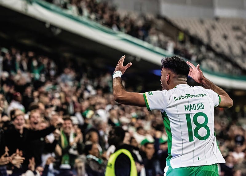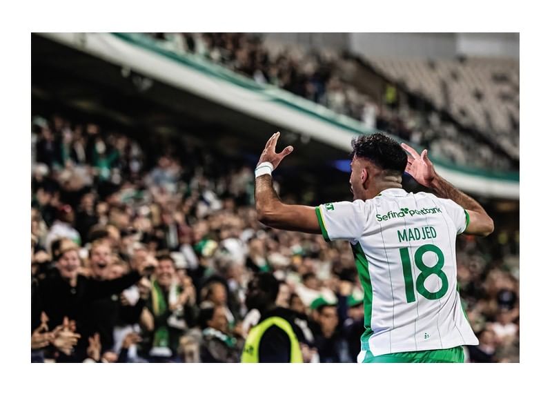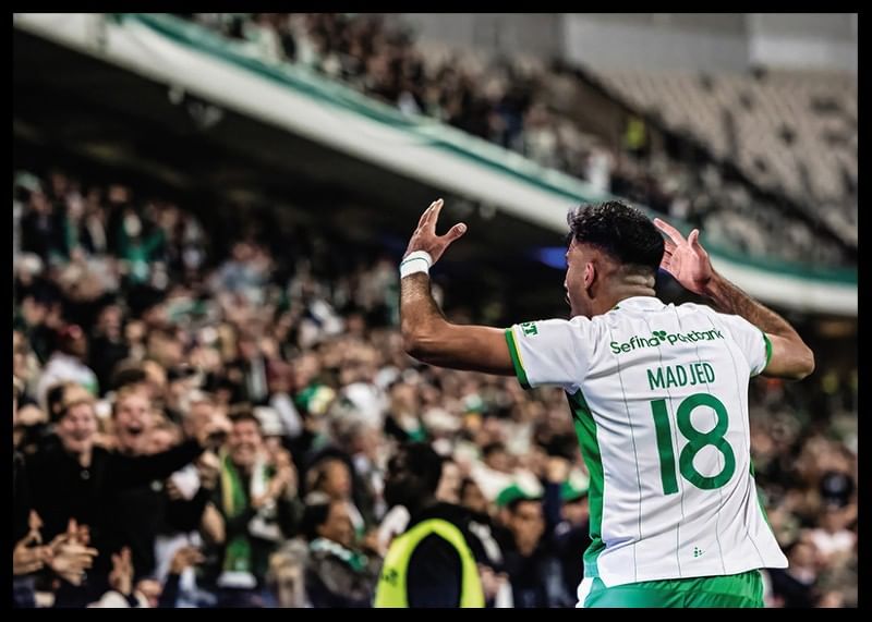 Hammarbys Montader Madjed jublar efter 1-0 av Jusef Erabi (ej i bild) under fotbollsmatchen i Allsvenskan mellan Hammarby och IFK Norrköping den 16 september 2024 i Stockholm.
