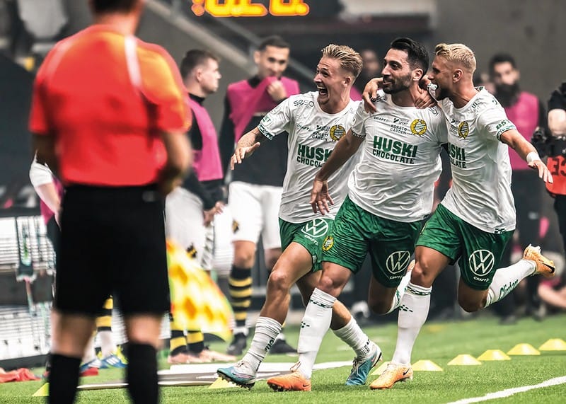 Hammarbys Nahir Besara jublar med lagkamrater efter 2-1 under fotbollsmatchen i Allsvenskan mellan Hammarby och AIK den 3 september 2023 i Stockholm.