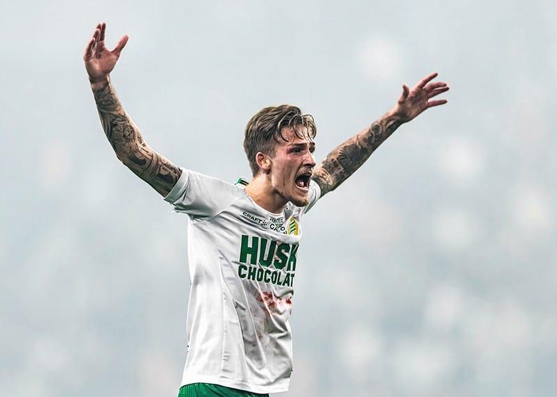Hammarbys Fredrik Hammar jublar under kvartsfinalen i Svenska Cupen i fotboll mellan Hammarby och AIK den 13 mars 2023 i Stockholm.
