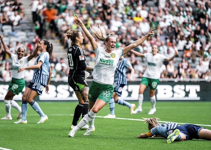 Hammarbys Ellen Wangerheim jublar efter 1-0 samtidigt som Djurgårdens Matilda Plan deppar under fotbollsmatchen i Damallsvenskan mellan Hammarby och Djurgården den 10 september 2023 i Stockholm.