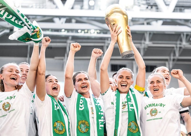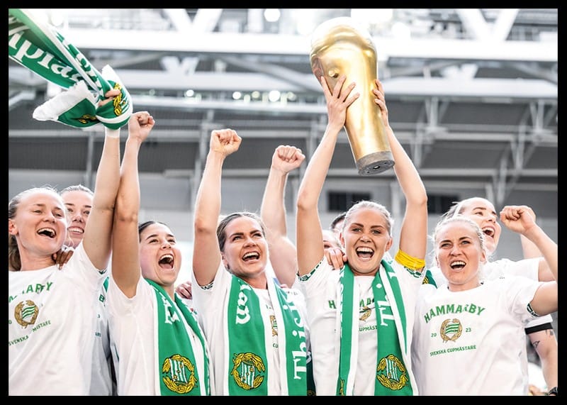 Hammarbys Matilda Vinberg, Kyra Cooney-Cross, Hanna Folkesson, Alice Carlsson och Ellen Gibson jublar efter finalen i Svenska Cupen mellan Hammarby och Häcken den 6 juni 2023 i Stockholm.