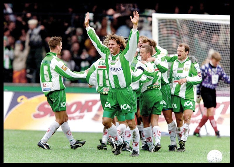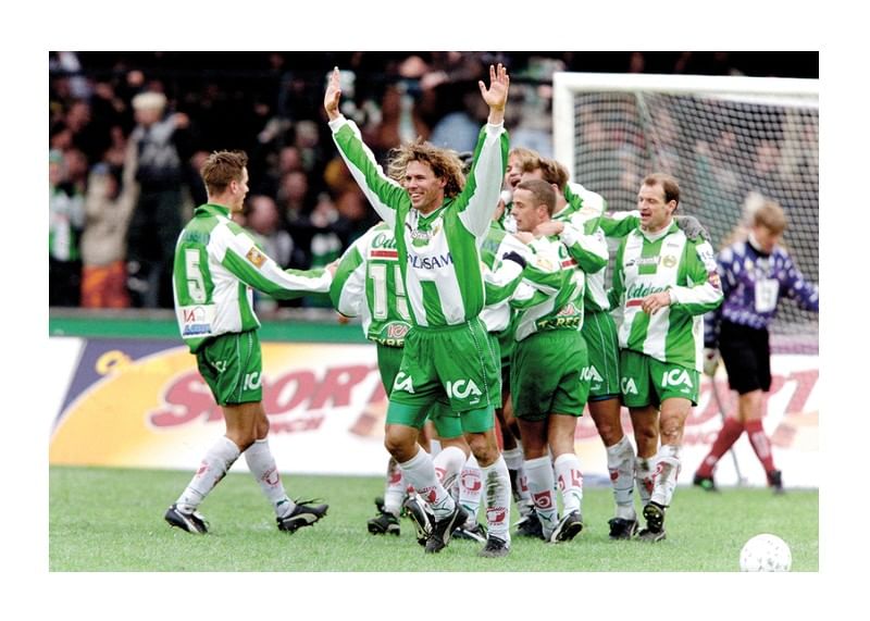 4 april 1998, Fotboll, Allsvenskan, Hammarby - Örebro, 3-1: Hans Eskilsson, Hammarby jublar efter mål.