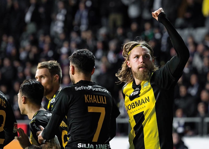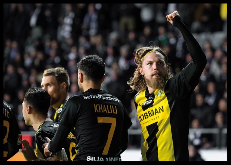 Hammarbys Bjørn Paulsen jublar efter 1-1-kvitteringen under fotbollsmatchen i Allsvenskan mellan IFK Göteborg och Hammarby den 10 april 2018 i Göteborg.