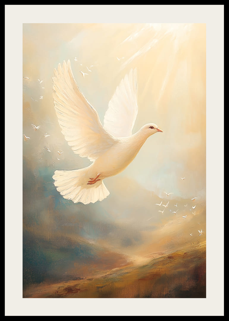 Denna poster fångar en vit duva som svävar mot himlen i ett mjukt, gyllene ljus, en symbol för fred, hopp och frihet. Med sin harmoniska komposition och eteriska atmosfär skapar konstverket en känsla av lugn och inspiration. Perfekt för att förvandla ditt hem till en fridfull plats och förmedla ett kraftfullt budskap om harmoni och hopp