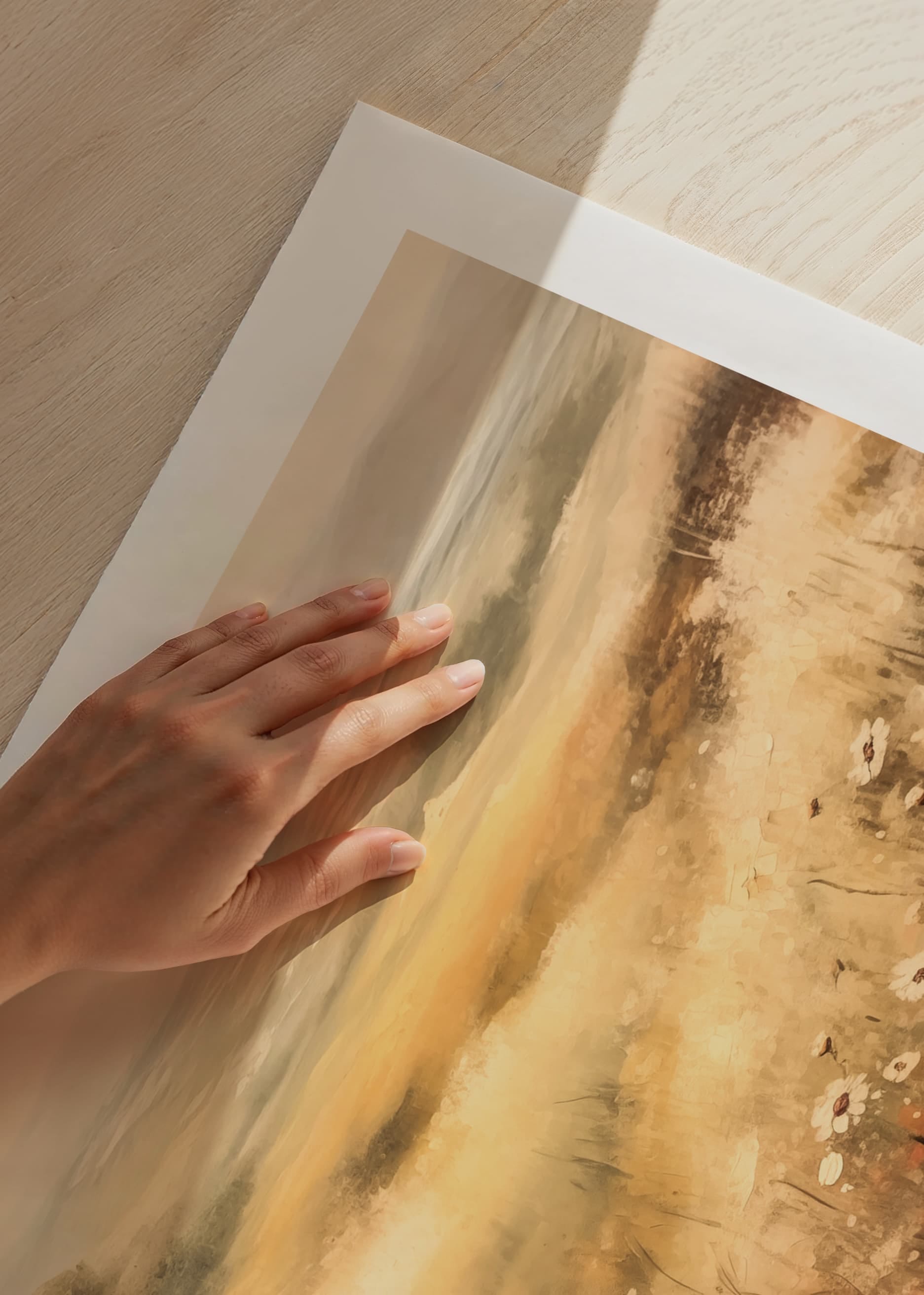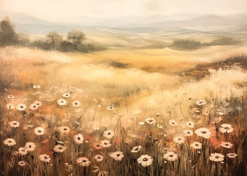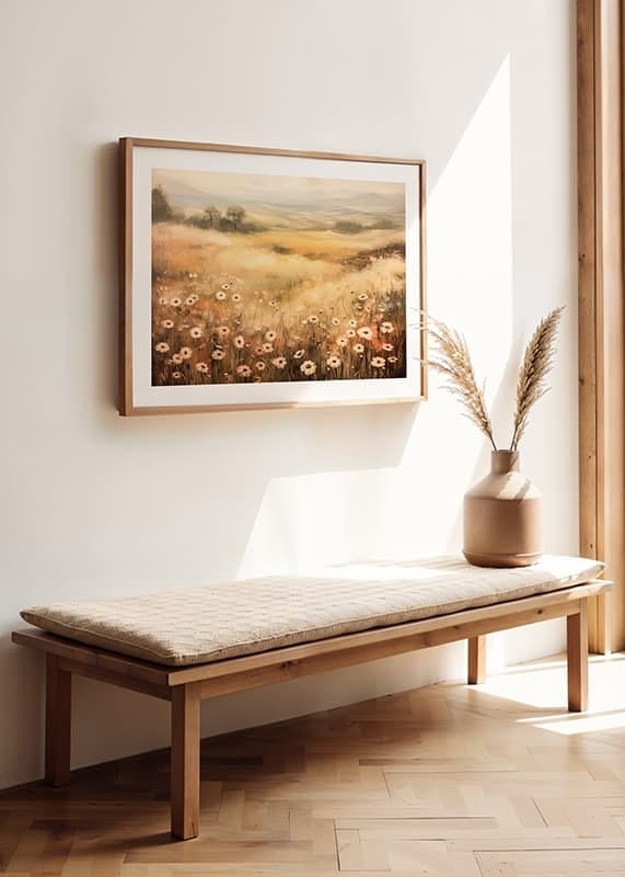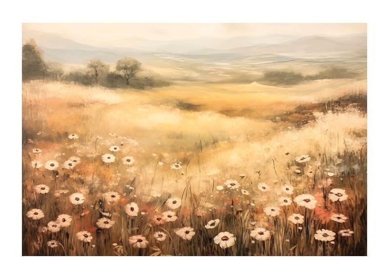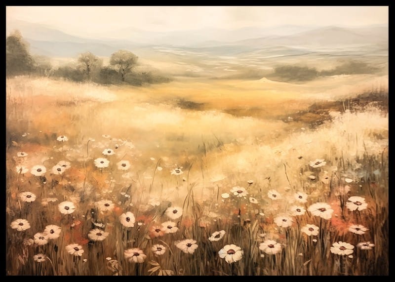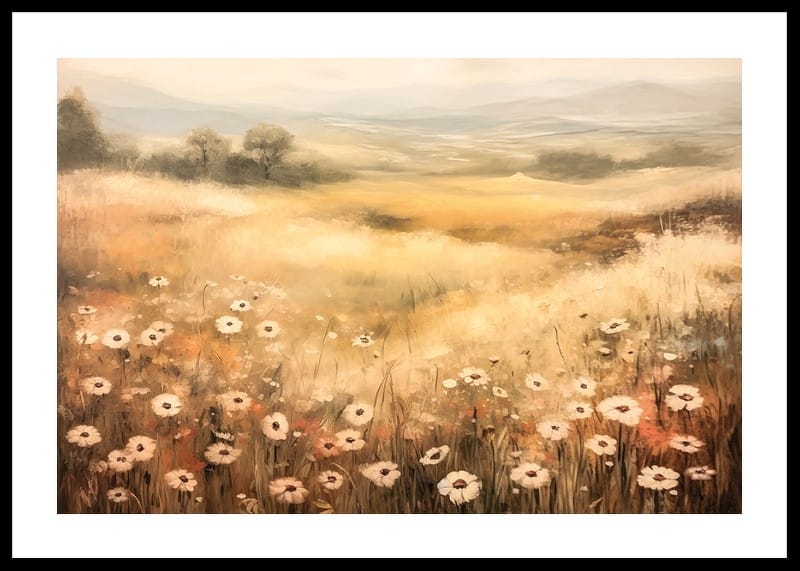 Denna poster fångar en drömlik sommaräng med blommor i mjuka toner som sträcker sig mot en gyllene horisont. Med sin harmoniska färgpalett och lugnande atmosfär är detta konstverk perfekt för att skapa en känsla av stillhet och frihet i ditt hem. Perfekt för naturälskare som vill bjuda in landsbygdens charm och en tidlös skönhet till sin inredning