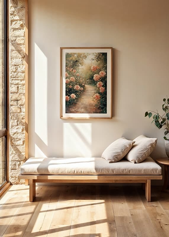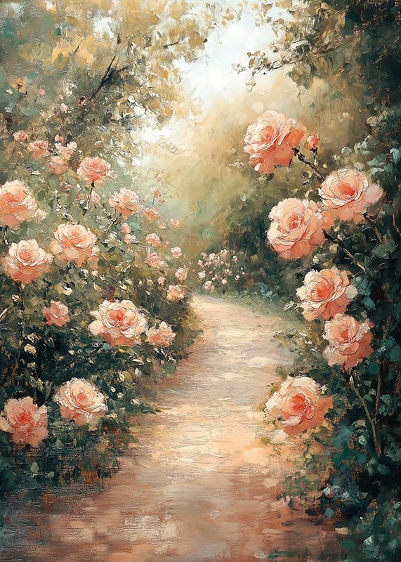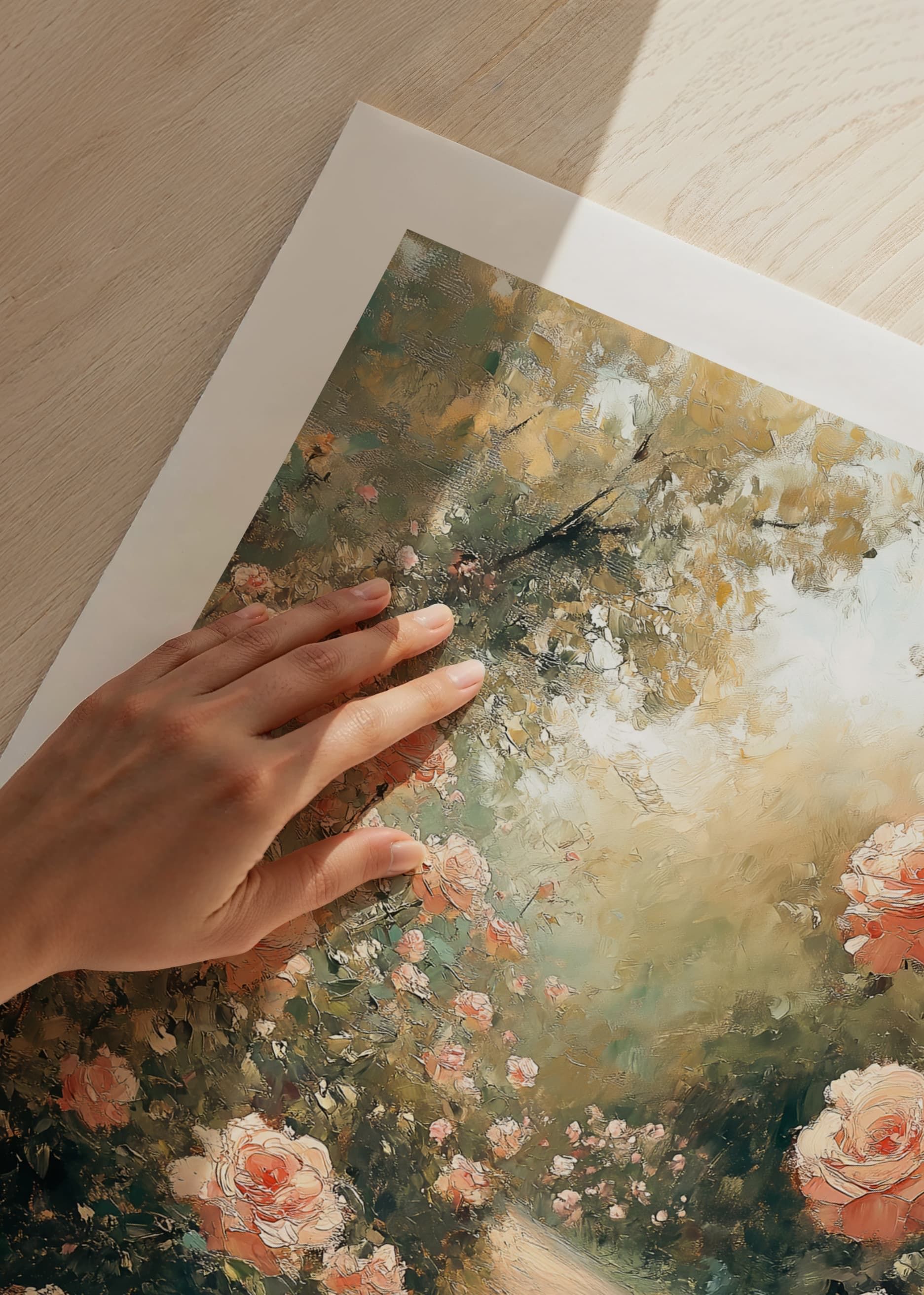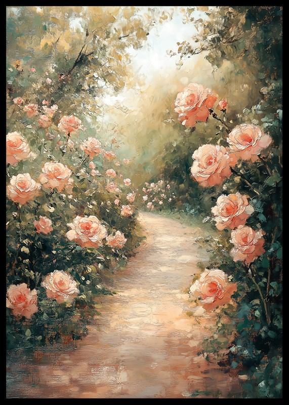 Föreställ dig en magisk promenad genom en rosträdgård badande i gyllene solljus. Den här romantiska postern fångar skönheten i naturens stillhet med mjuka pastellfärger och en ljuvlig känsla av lugn. Perfekt för att skapa en harmonisk och drömlik atmosfär i ditt hem. Låt 'Rosenstigen' bli en symbol för elegans och evig blomning i din inredning