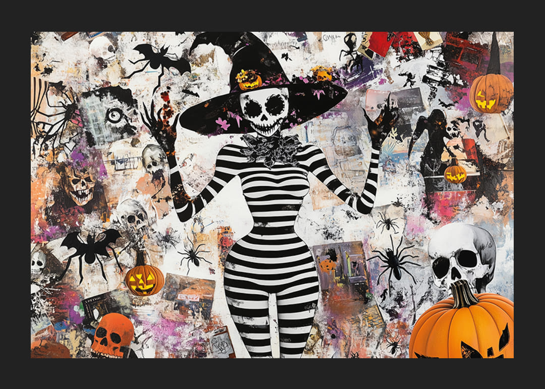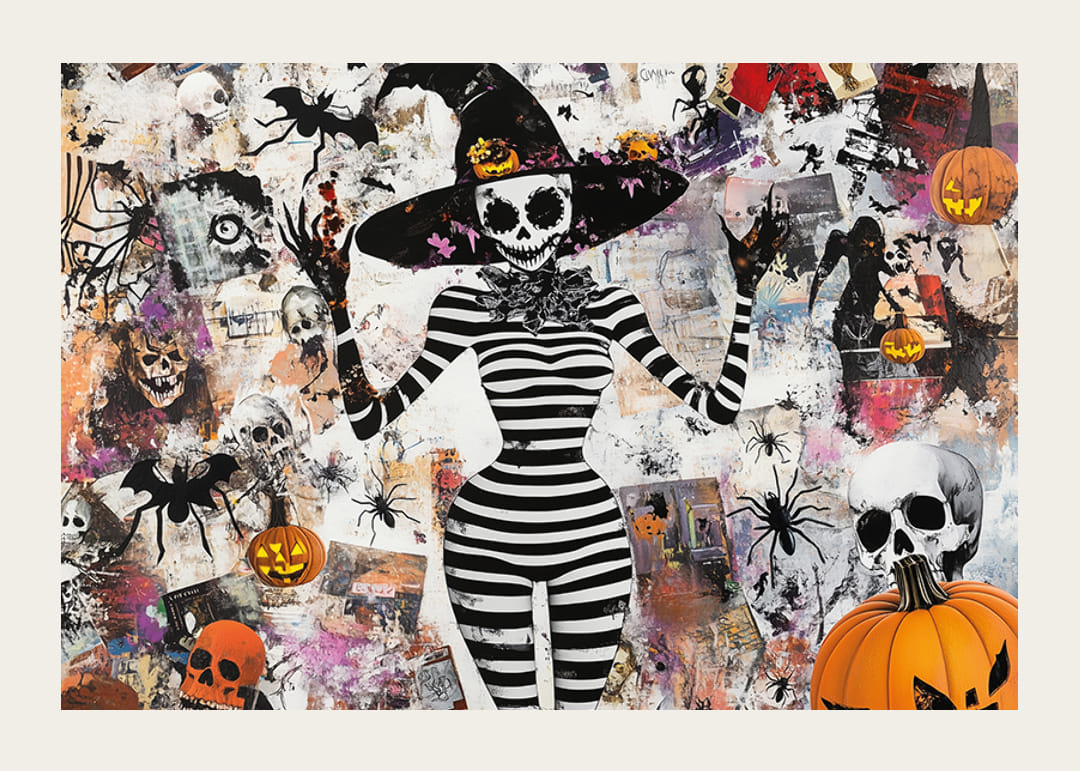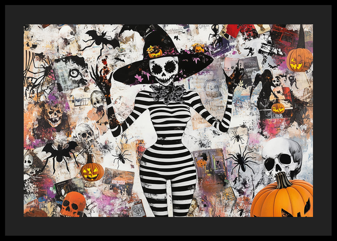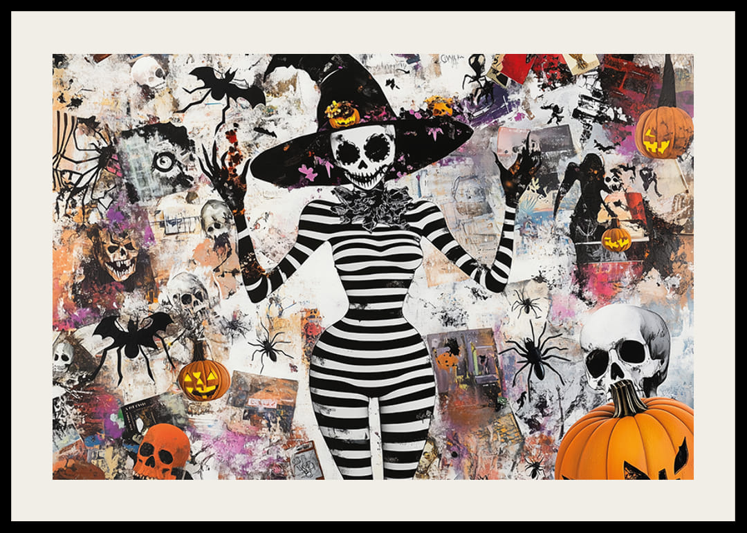 Denna poster fångar Halloweenens magi med sin lekfulla och mystiska design. Den svartvita skelettfiguren, omgiven av pumpor och spindlar, skapar en fängslande atmosfär fylld av fantasi och lite skräck.