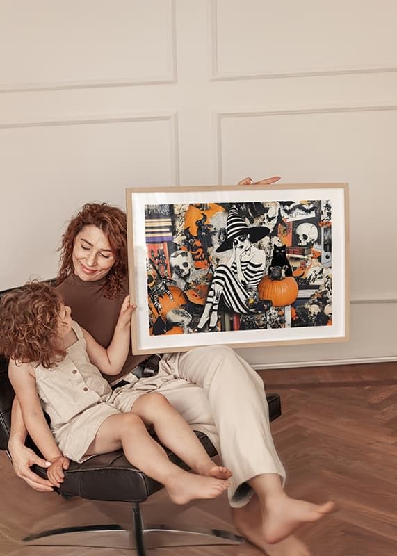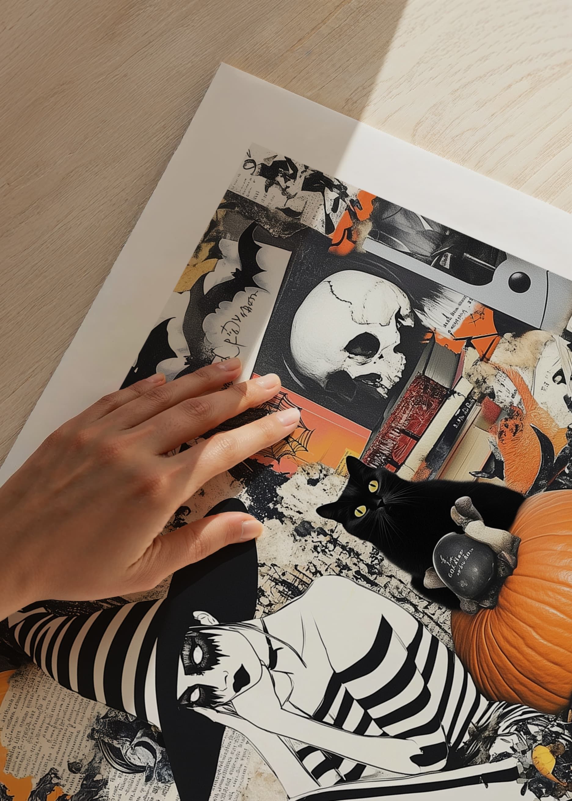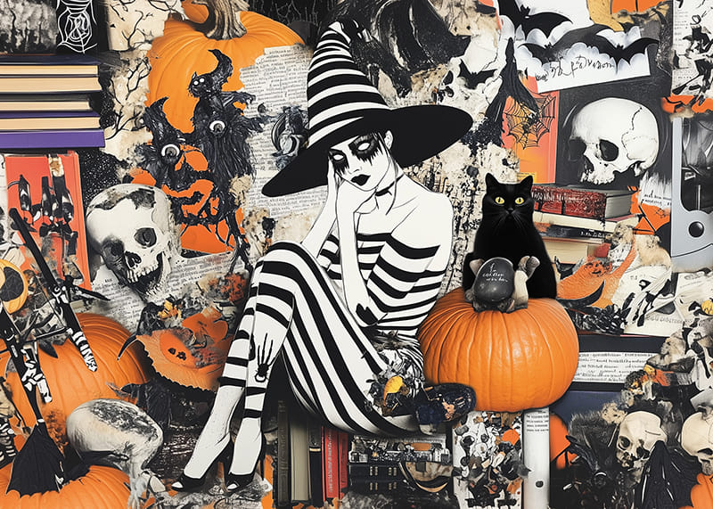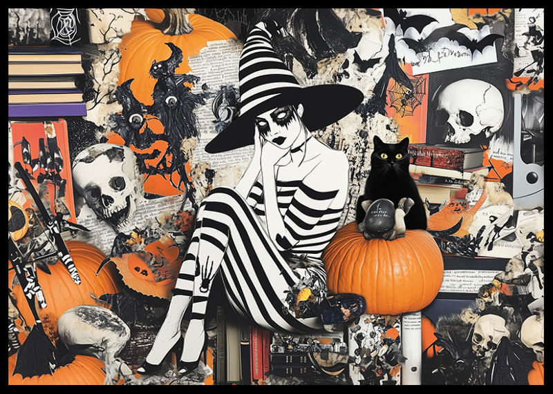 Denna poster förmedlar en magisk och mystisk känsla med en svartvit häxa klädd i randigt, sittande bland pumpor och böcker. Omgiven av fladdermöss och dödskallar skapar den en dramatisk atmosfär som fångar essensen av Halloween