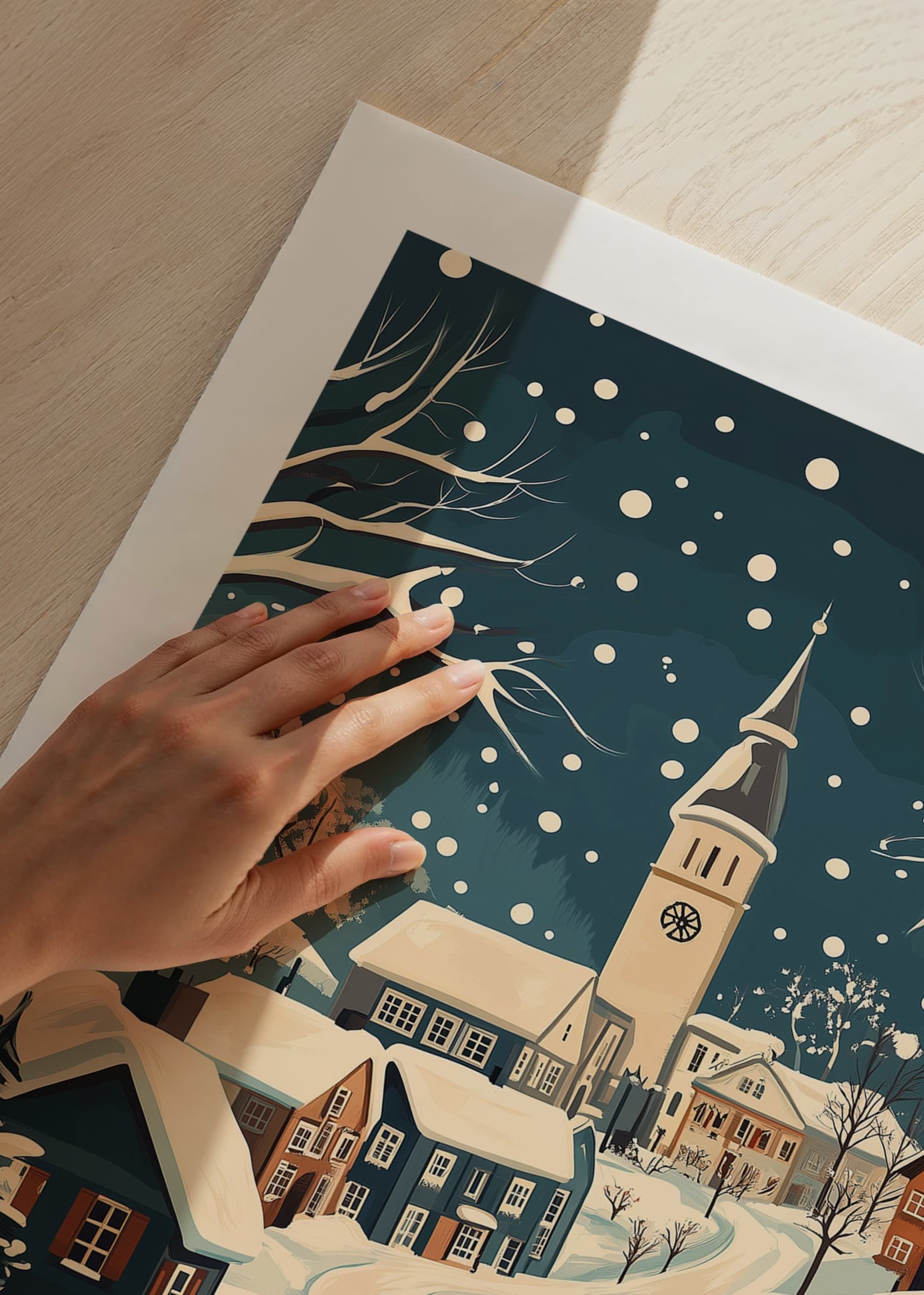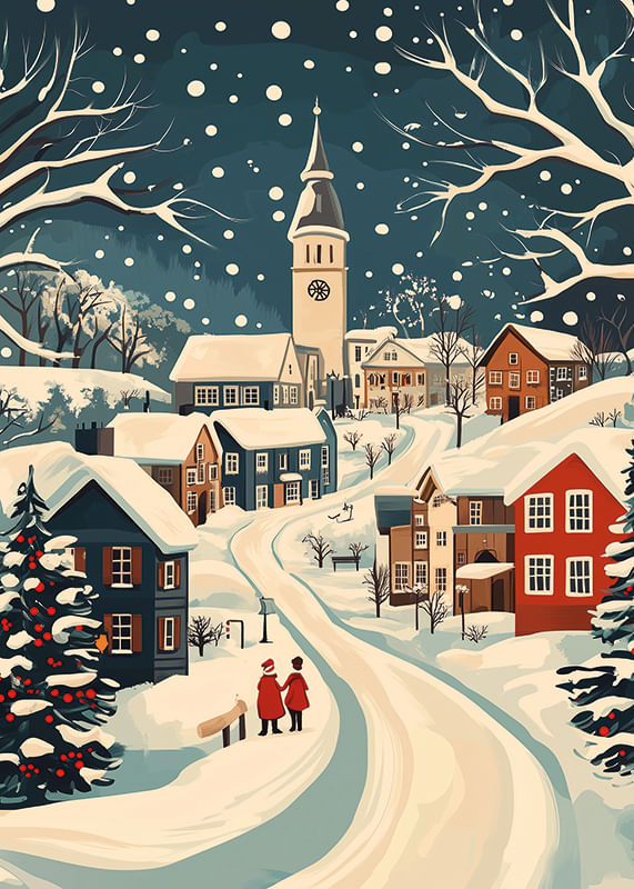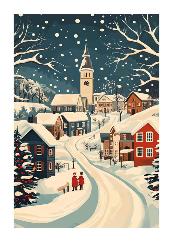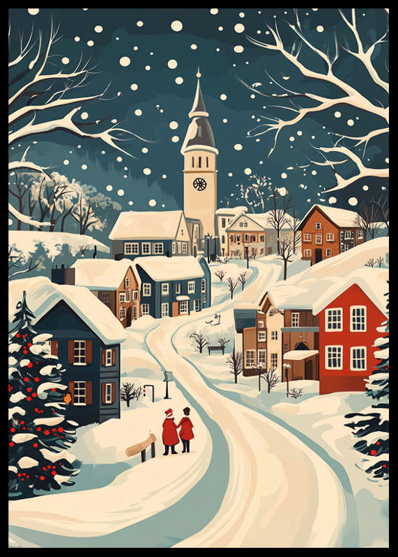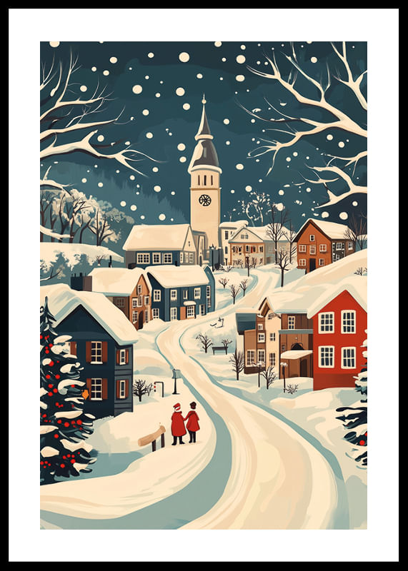 Förförs av denna posters charmiga vinterlandskap med en pittoresk by inbäddad i snö. De snötäckta taken och den slingrande vägen skapar en stämning av lugn och fred. De mjukt fallande snöflingorna förtrollar ögat och fördjupar atmosfären av vintermagi.