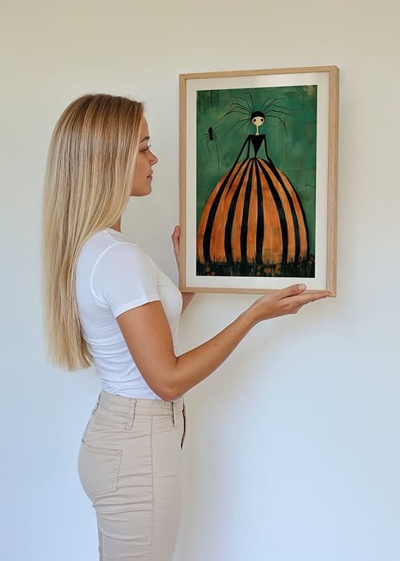 Denna poster fångar en mystisk värld där en smal figur klädd i en randig orange och svart klänning möter en spindel på en grön bakgrund. Den tunna elegansen och de spretiga linjerna ger en surrealistisk känsla som väcker nyfikenhet.