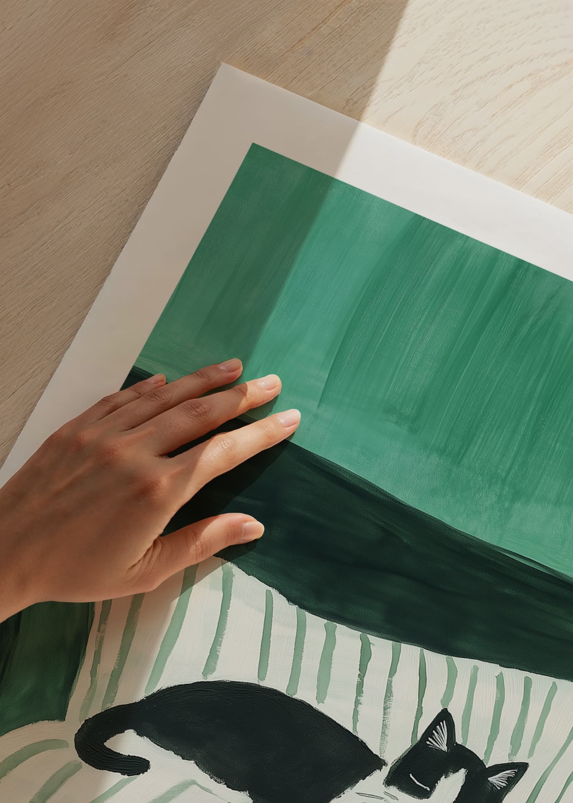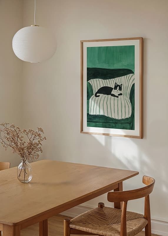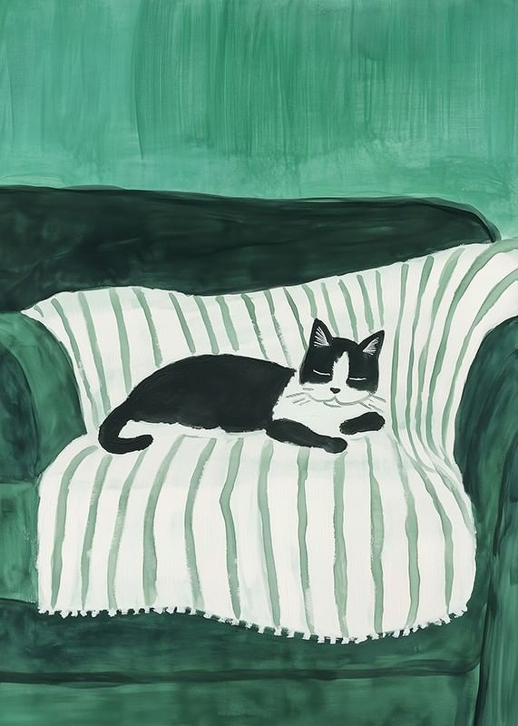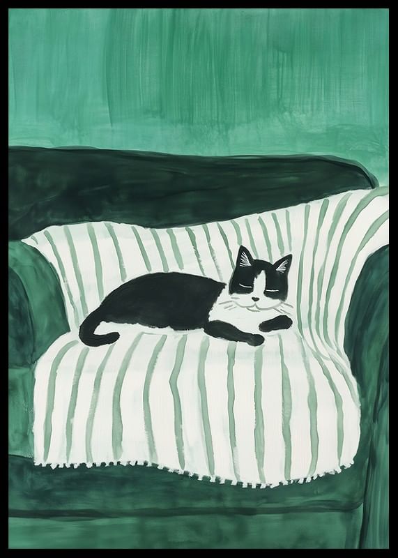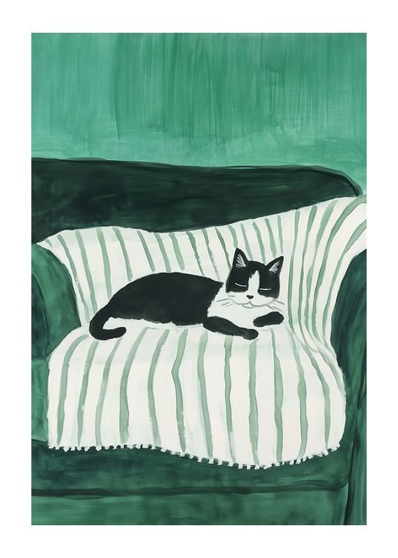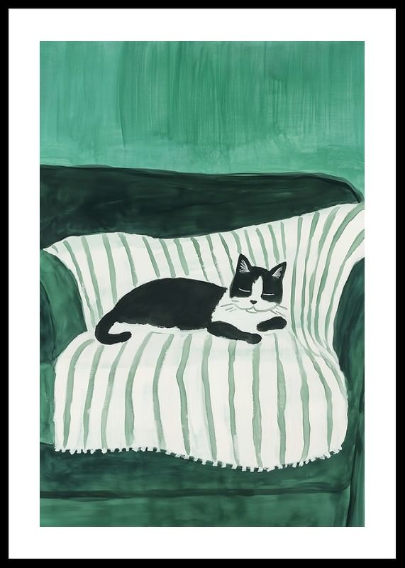 Denna stilrena poster visar en svartvit katt som sover fridfullt på en randig filt i en djupgrön fåtölj. De mjuka kontrasterna och harmoniska färgtonerna skapar en lugn och elegant atmosfär, perfekt för att ge ditt hem en modern och hemtrevlig känsla.