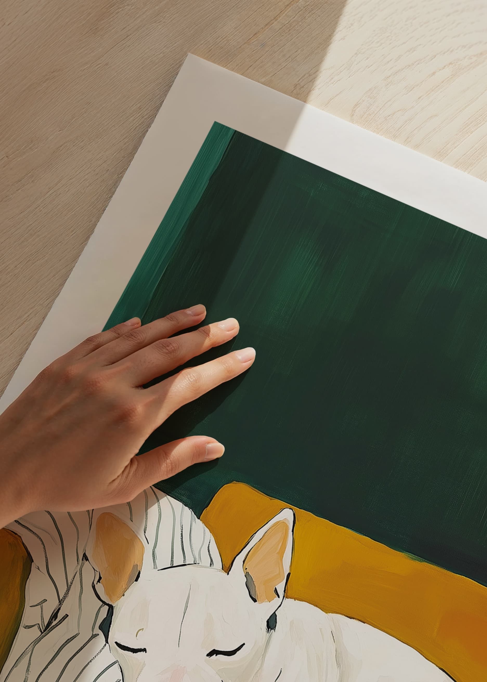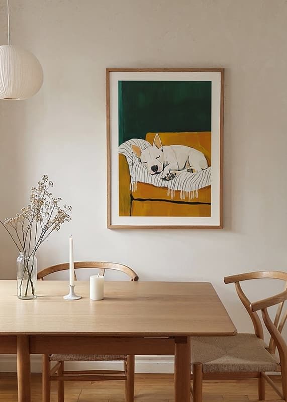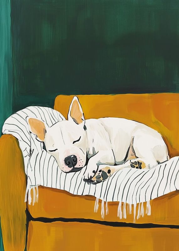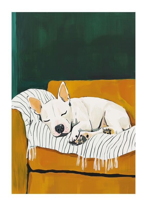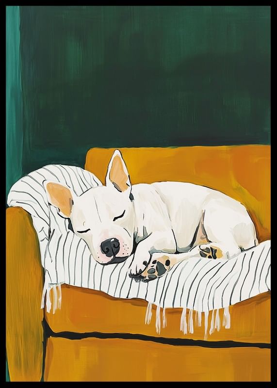 Denna charmiga poster föreställer en sovande vit hund som vilar fridfullt på en randig filt i en senapsgul fåtölj. De varma färgtonerna och mjuka penseldragen skapar en inbjudande och rogivande atmosfär.