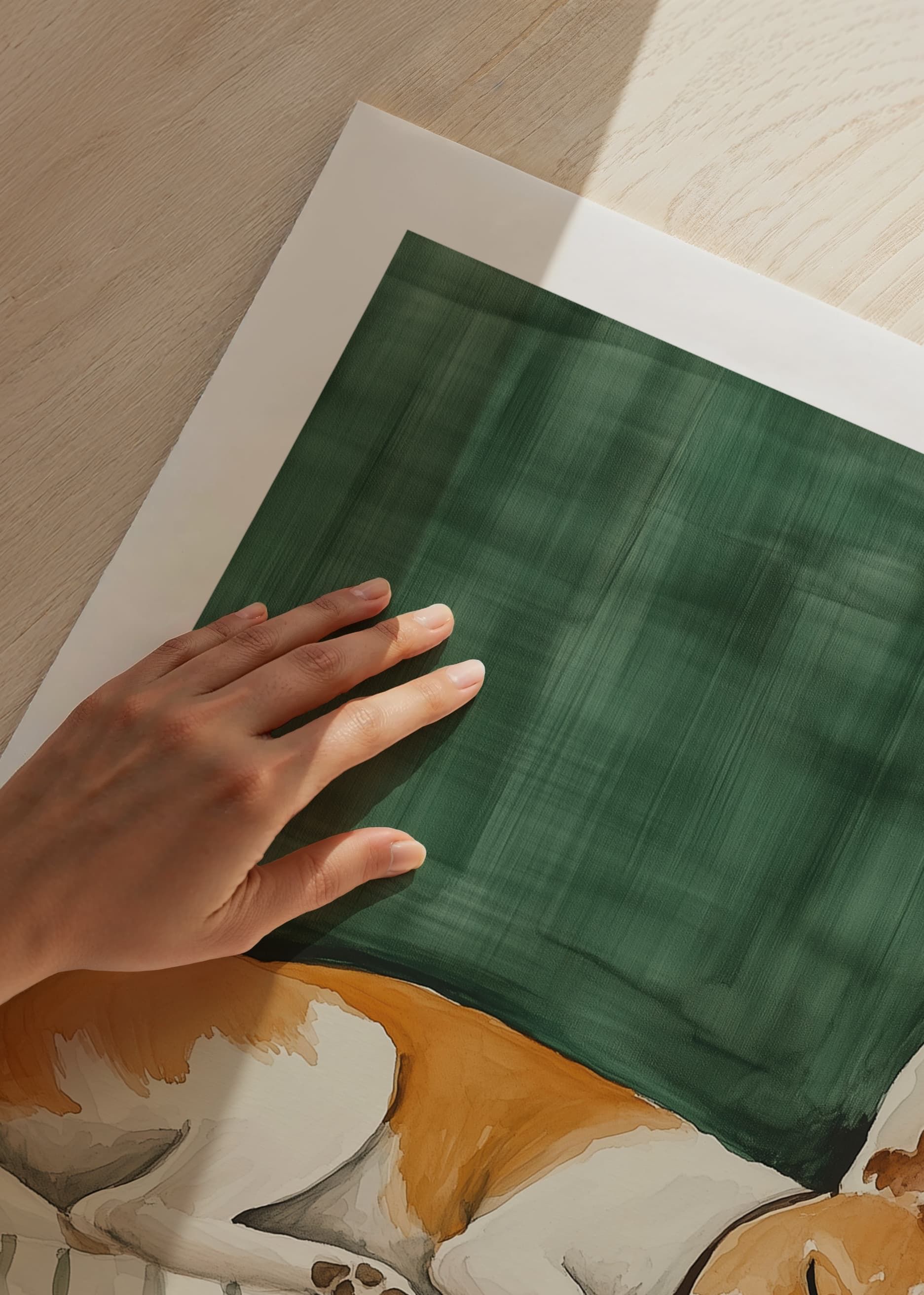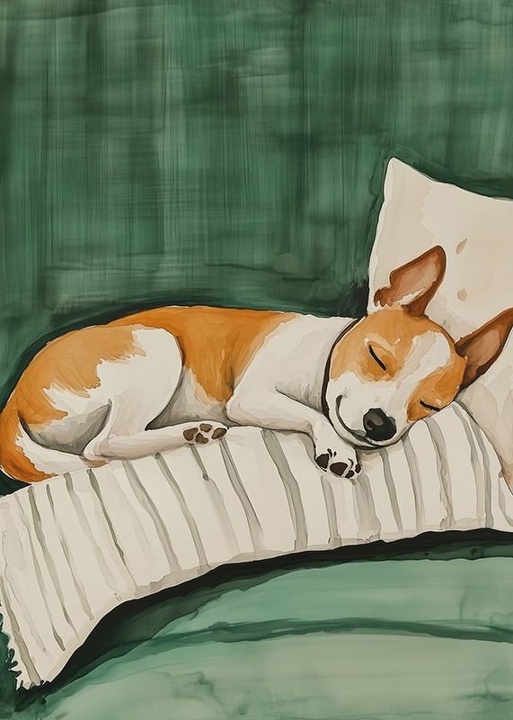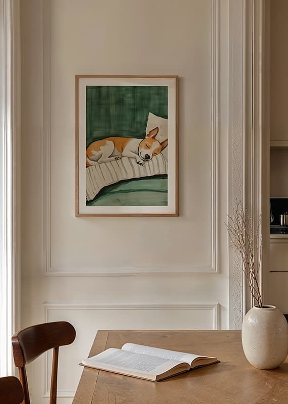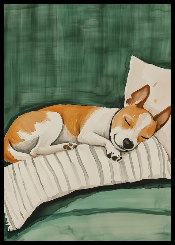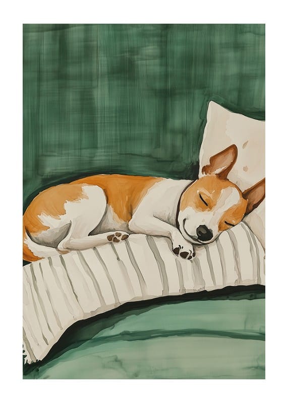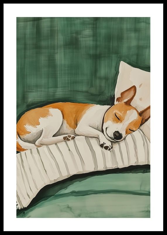 Denna charmiga poster visar en liten hund som sover fridfullt på en randig kudde i en grön soffa. De mjuka färgerna och den avslappnade stämningen skapar en varm och inbjudande känsla, perfekt för att ge ditt hem en lugn och hemtrevlig atmosfär.