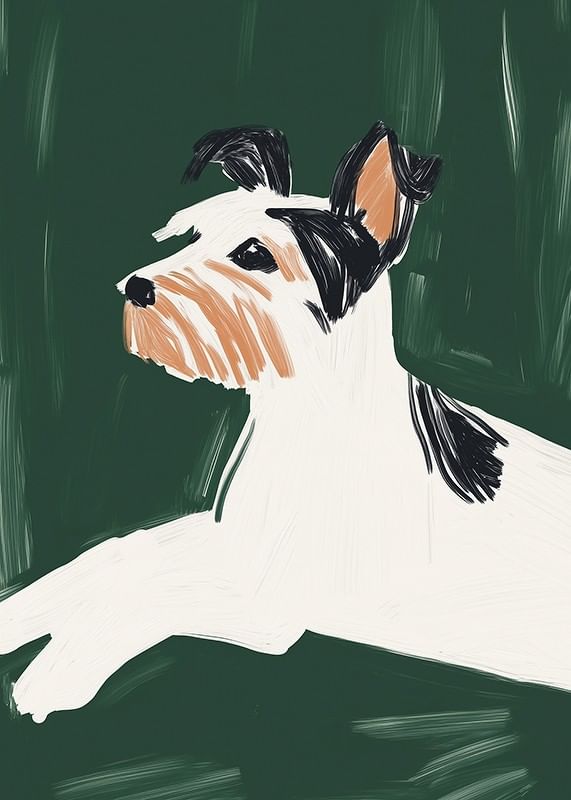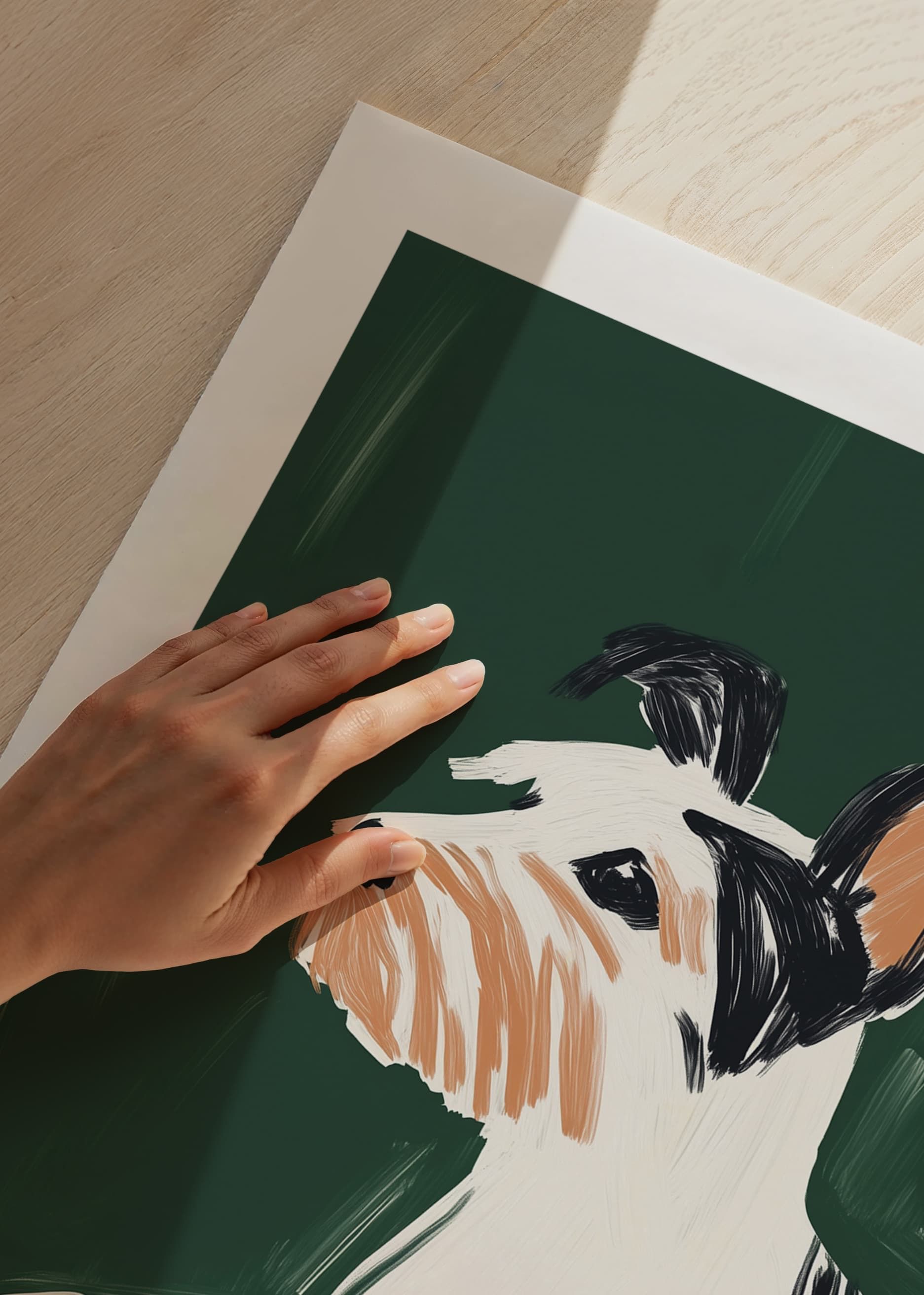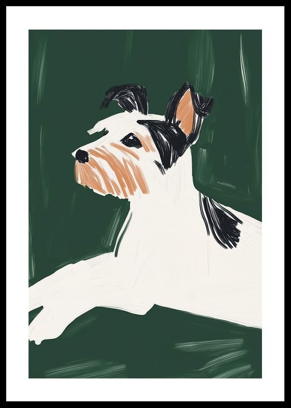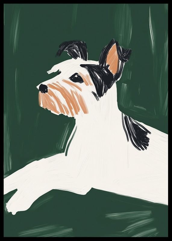 Denna stilrena poster föreställer en hund i ett minimalistiskt, abstrakt uttryck med djärva penseldrag och jordnära färger. Den gröna bakgrunden skapar en vacker kontrast som framhäver hundens detaljer, vilket gör postern till en perfekt inredningsdetalj för moderna hem.