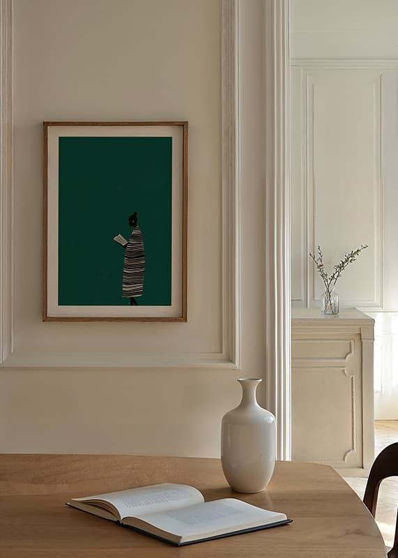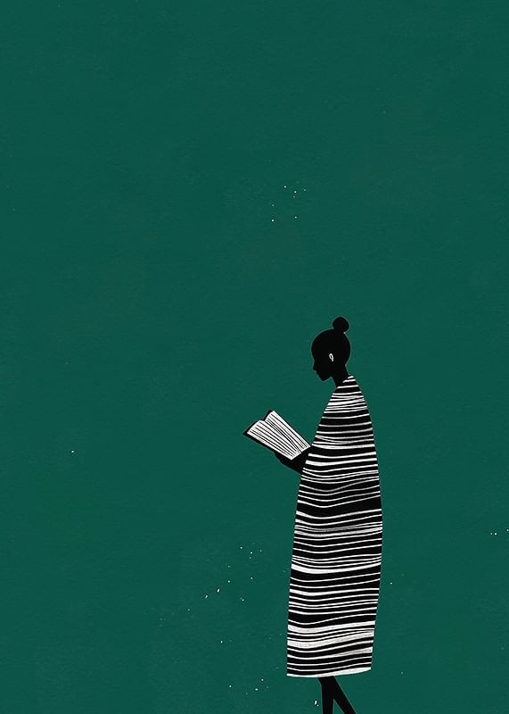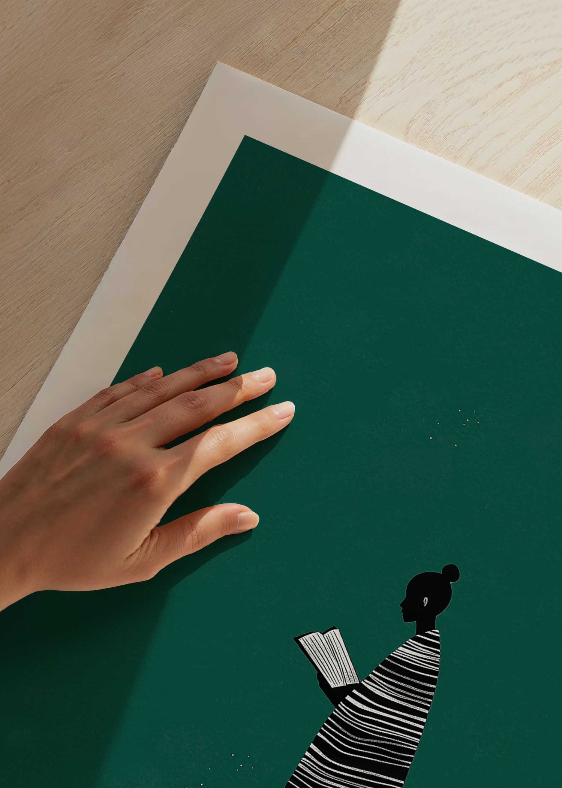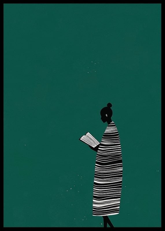 Denna eleganta poster föreställer en stiliserad figur som står försjunken i en bok, klädd i en svartvit randig klädsel mot en djupgrön bakgrund. Den minimalistiska designen och lugna färgpaletten skapar en harmonisk och modern känsla.
