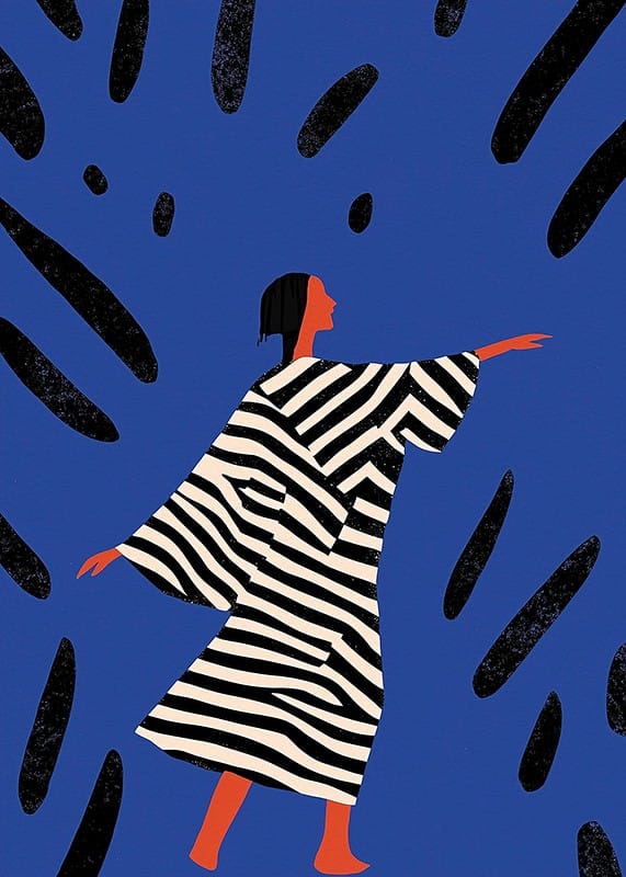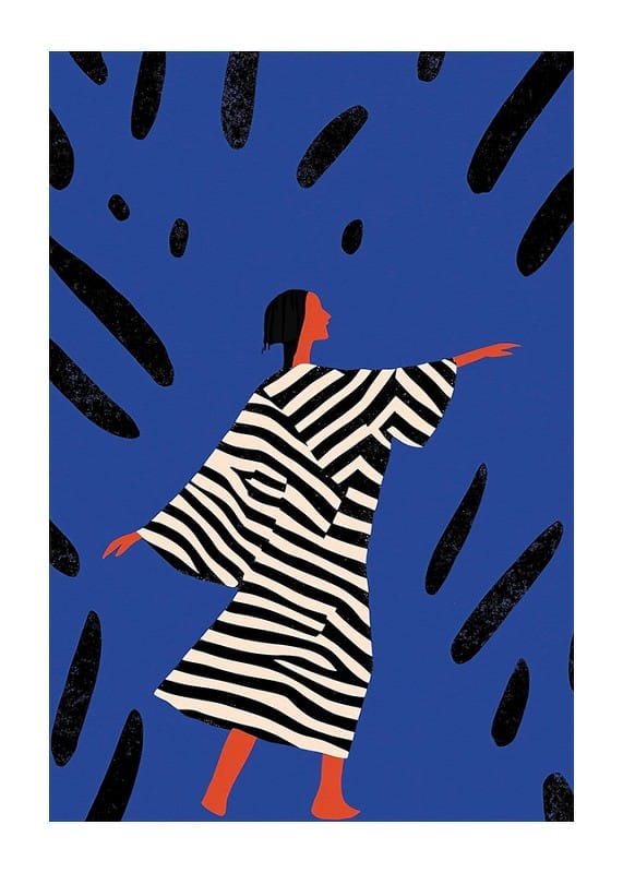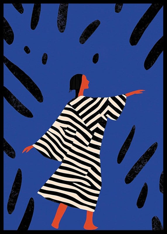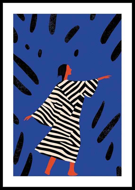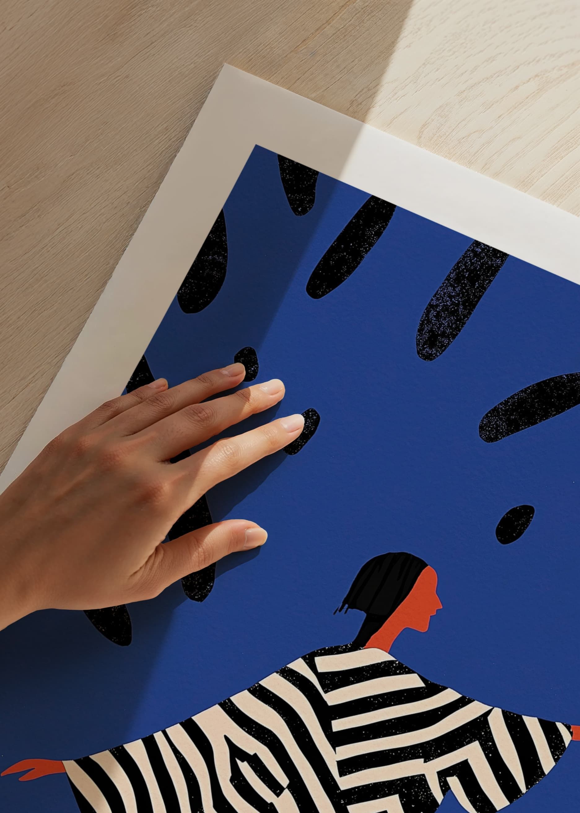 Denna färgstarka poster föreställer en stiliserad figur i en svartvit randig dräkt mot en livfull blå bakgrund med abstrakta svarta former. Kombinationen av starka kontraster och lekfulla mönster skapar en modern och energisk känsla.