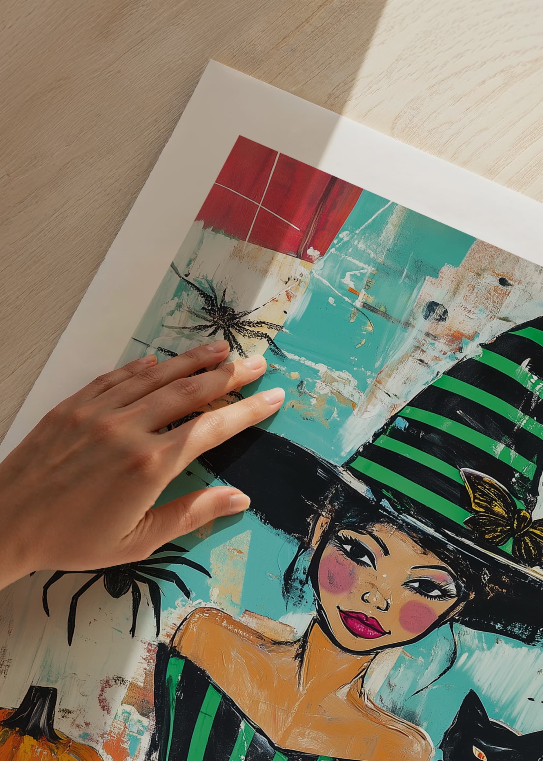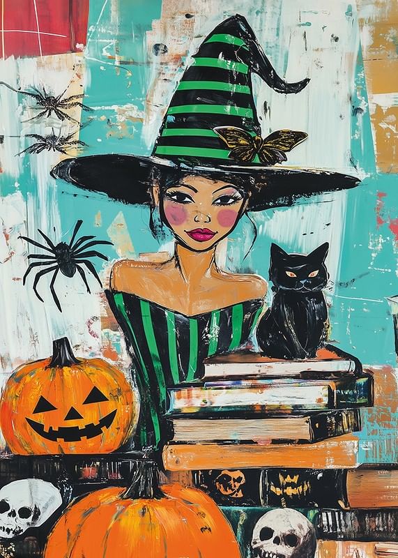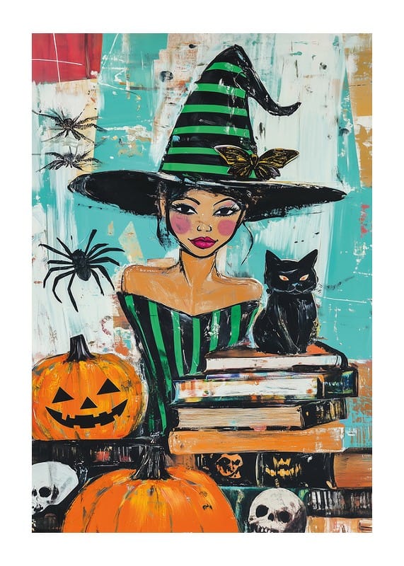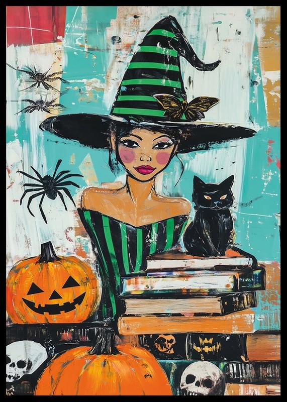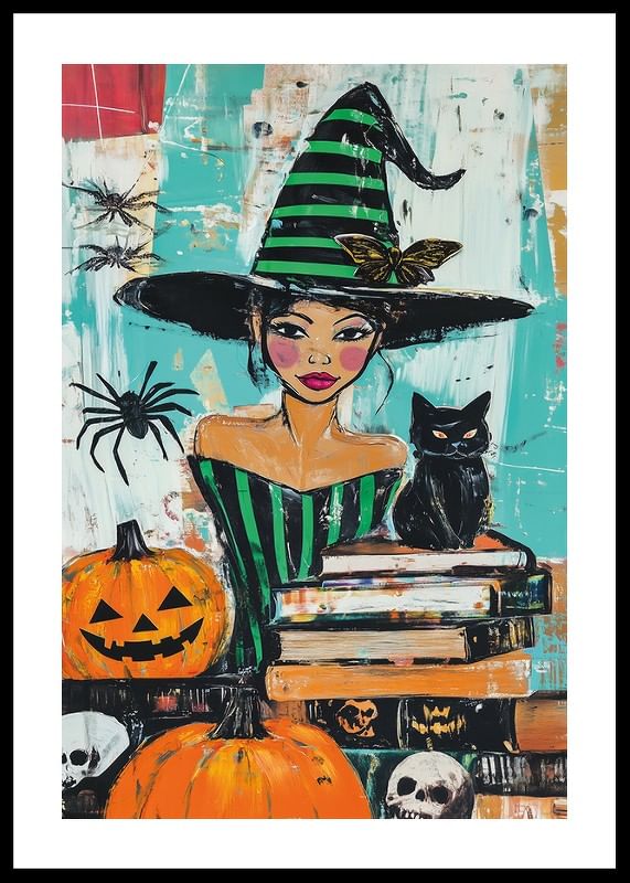 Skapa en magisk Halloween-stämning med denna färgstarka och lekfulla poster! En charmig häxa i grönrandig hatt omgiven av pumpor, böcker, en svart katt och kusliga detaljer som spindlar och dödskallar.