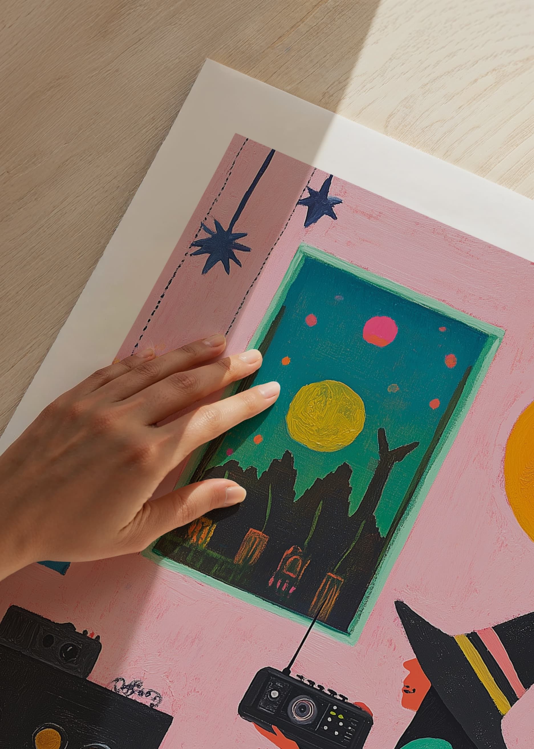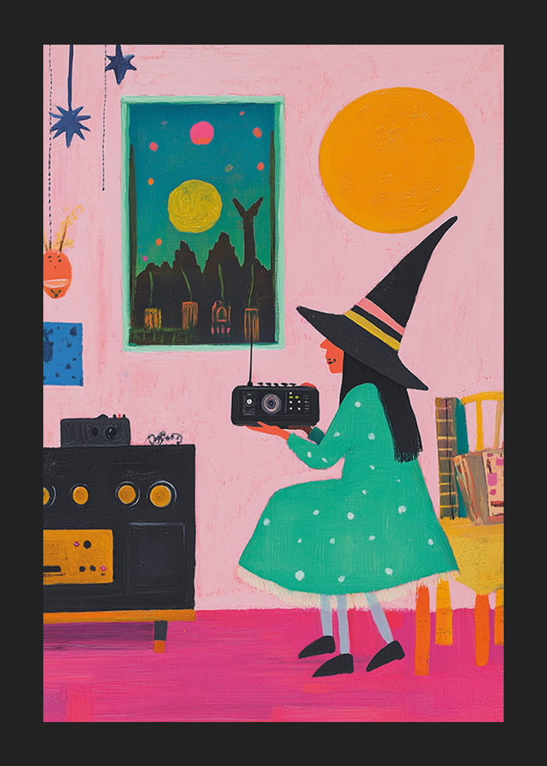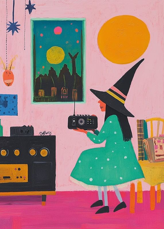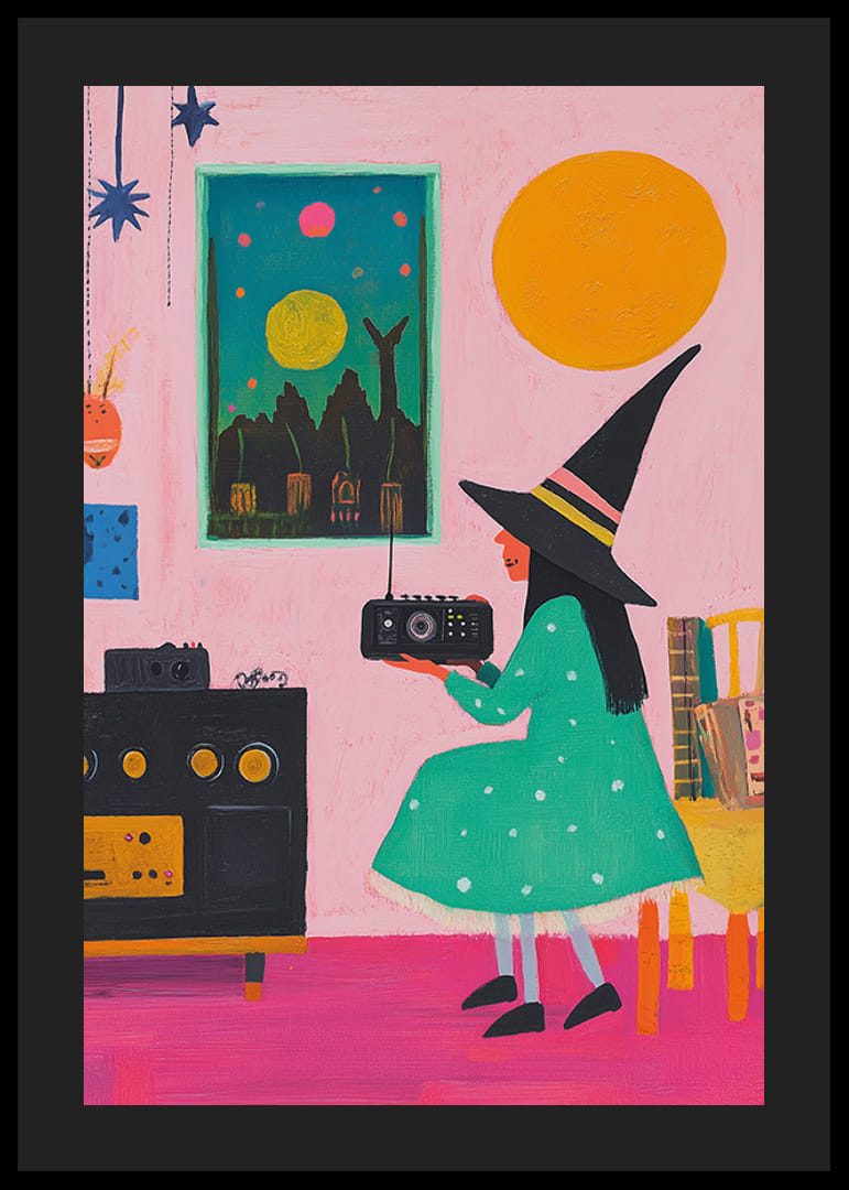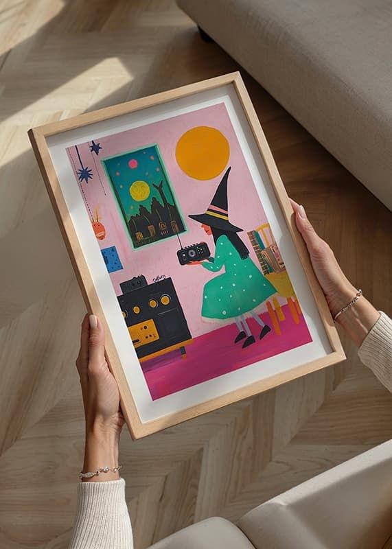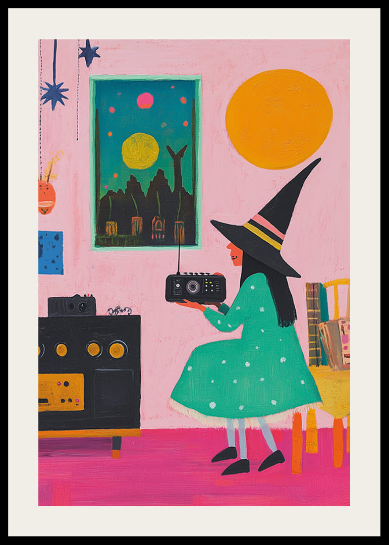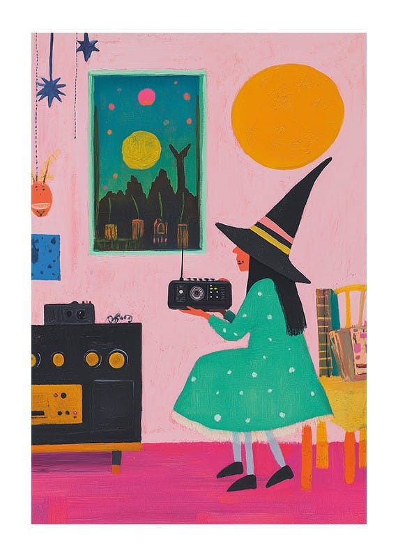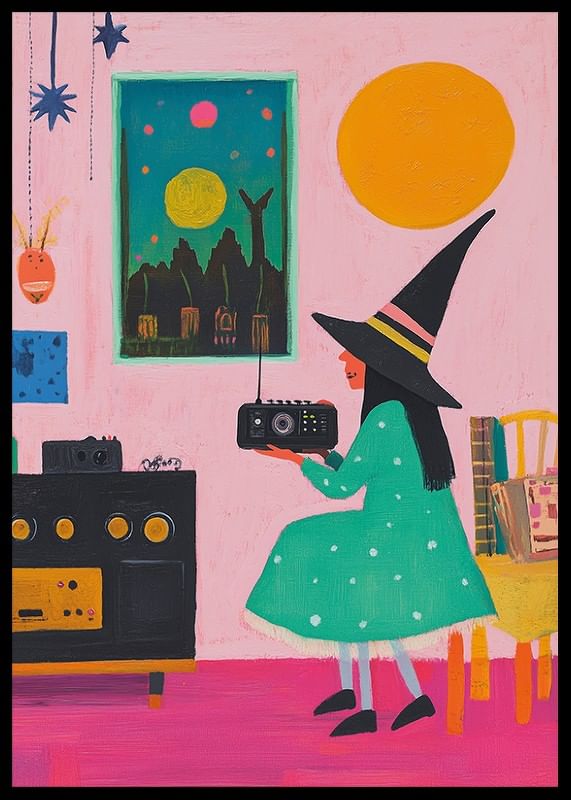 Denna lekfulla och färgstarka poster visar en ung häxa i grön prickig klänning och spetsig hatt som lyssnar på radio i ett charmigt, magiskt rum. Med starka färger, fantasifulla detaljer och en retro känsla blir postern ett unikt tillskott till ditt hem.