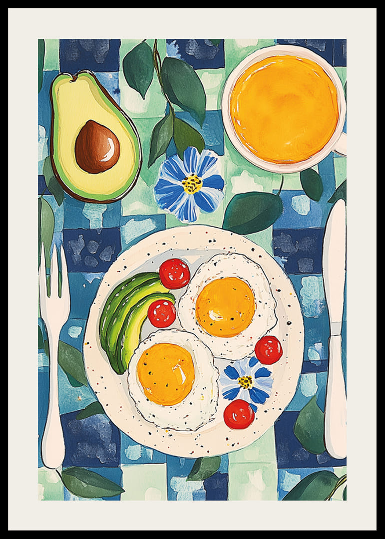 Denna livliga och färgglada poster fångar en perfekt frukoststund med stekta ägg, avokado, körsbärstomater och ett glas apelsinjuice, allt vackert arrangerat på en blågrön rutmönstrad duk. De fräscha färgerna och charmiga detaljerna skapar en inbjudande och energigivande känsla.
