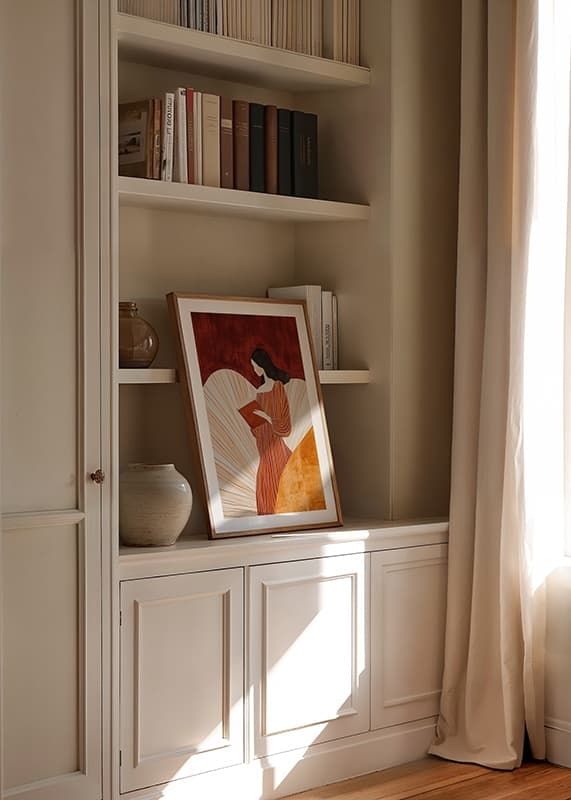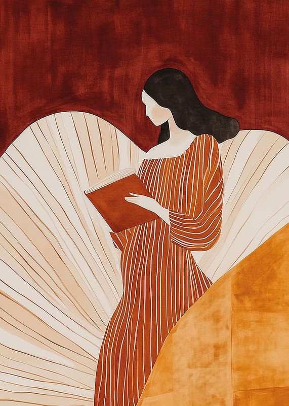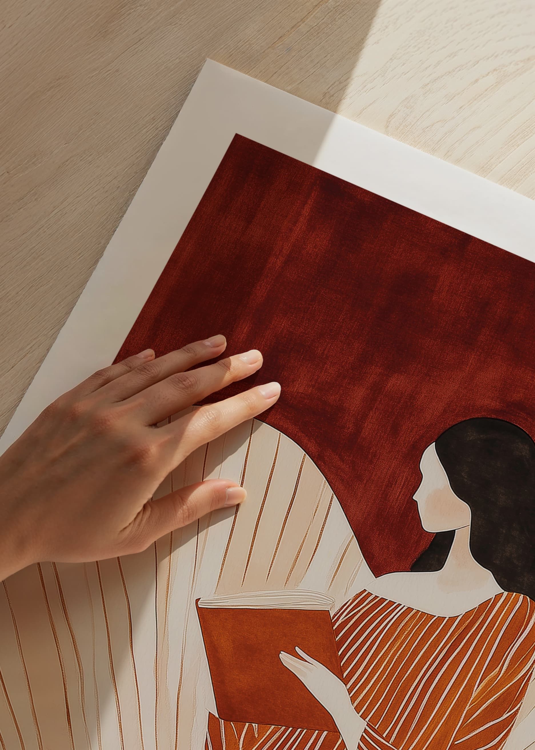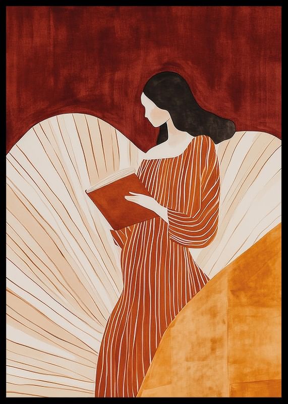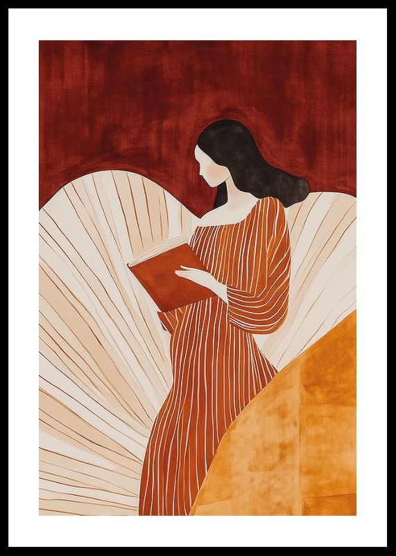 Denna eleganta poster fångar en stillsam stund av försjunken läsning. Mot en varm, djupröd bakgrund står en kvinna i en röd- och vitrandig klänning, med en bok i händerna. De mjuka linjerna och jordnära tonerna skapar en harmonisk och lugn atmosfär.