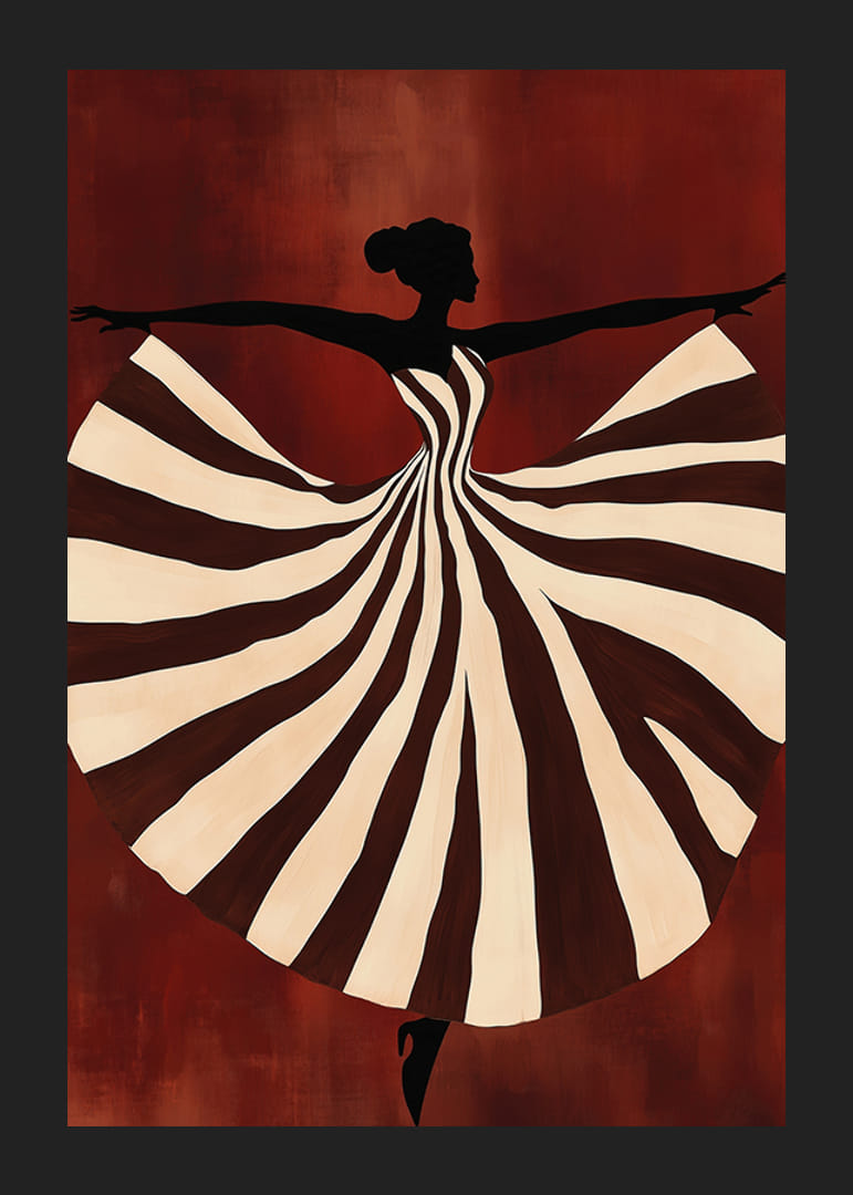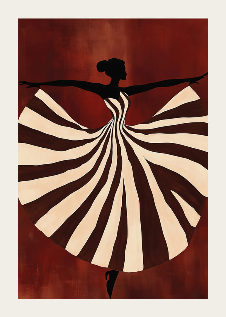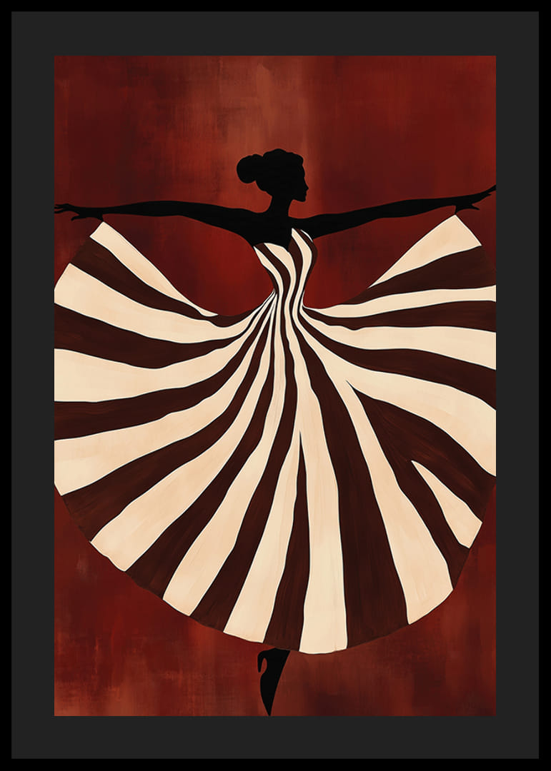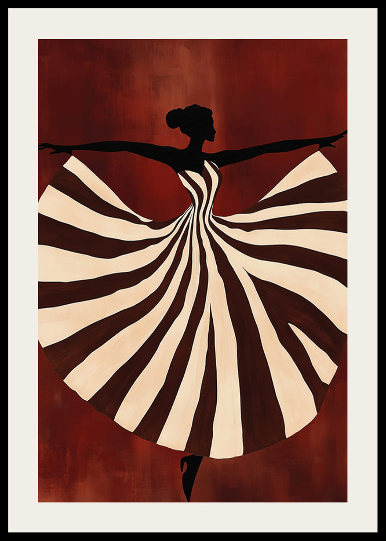 Denna eleganta poster fångar rörelsens skönhet i en silhuett av en dansande kvinna, klädd i en svepande klänning med choklad- och vaniljfärgade ränder. Den djupa, röda bakgrunden framhäver hennes graciösa pose och skapar en känsla av energi och sofistikerad charm.