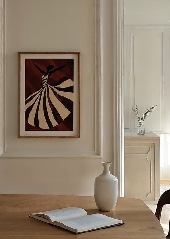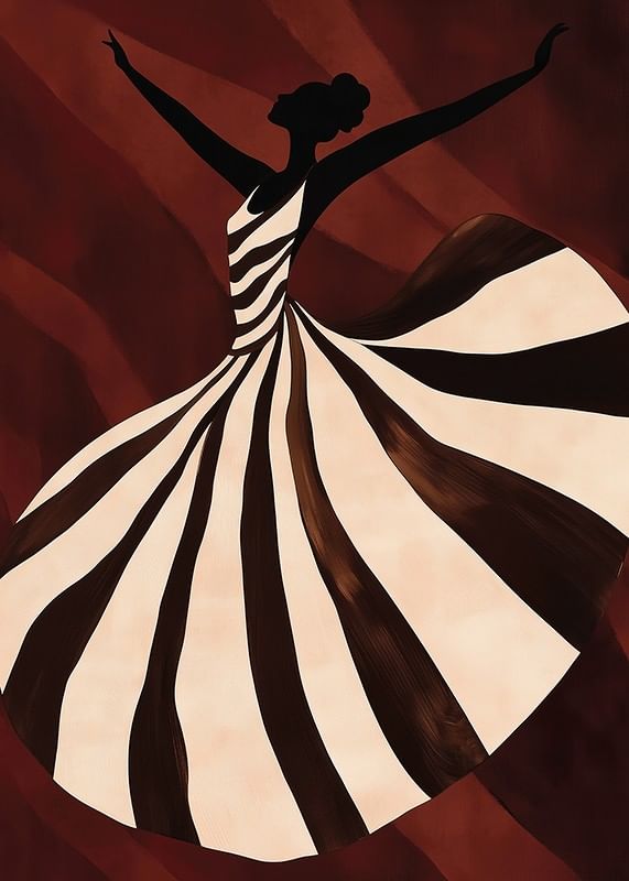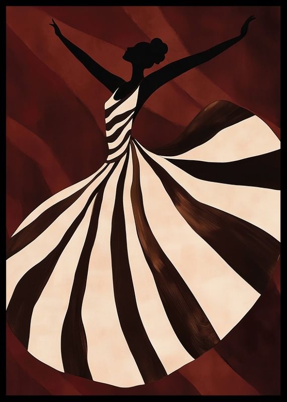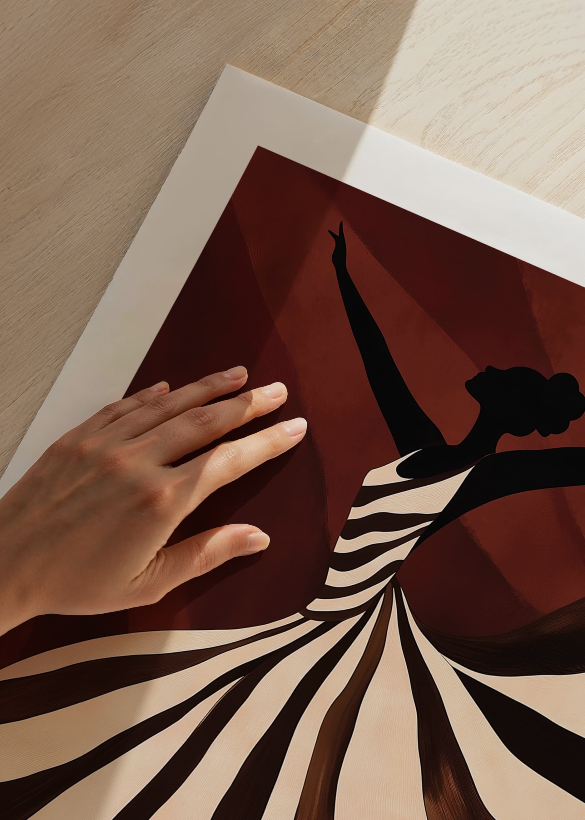 Denna fängslande poster visar en dansande kvinna i en svepande klänning med choklad- och vaniljfärgade ränder. Hennes eleganta rörelser fångas perfekt mot en varm, röd bakgrund som utstrålar energi och passion.