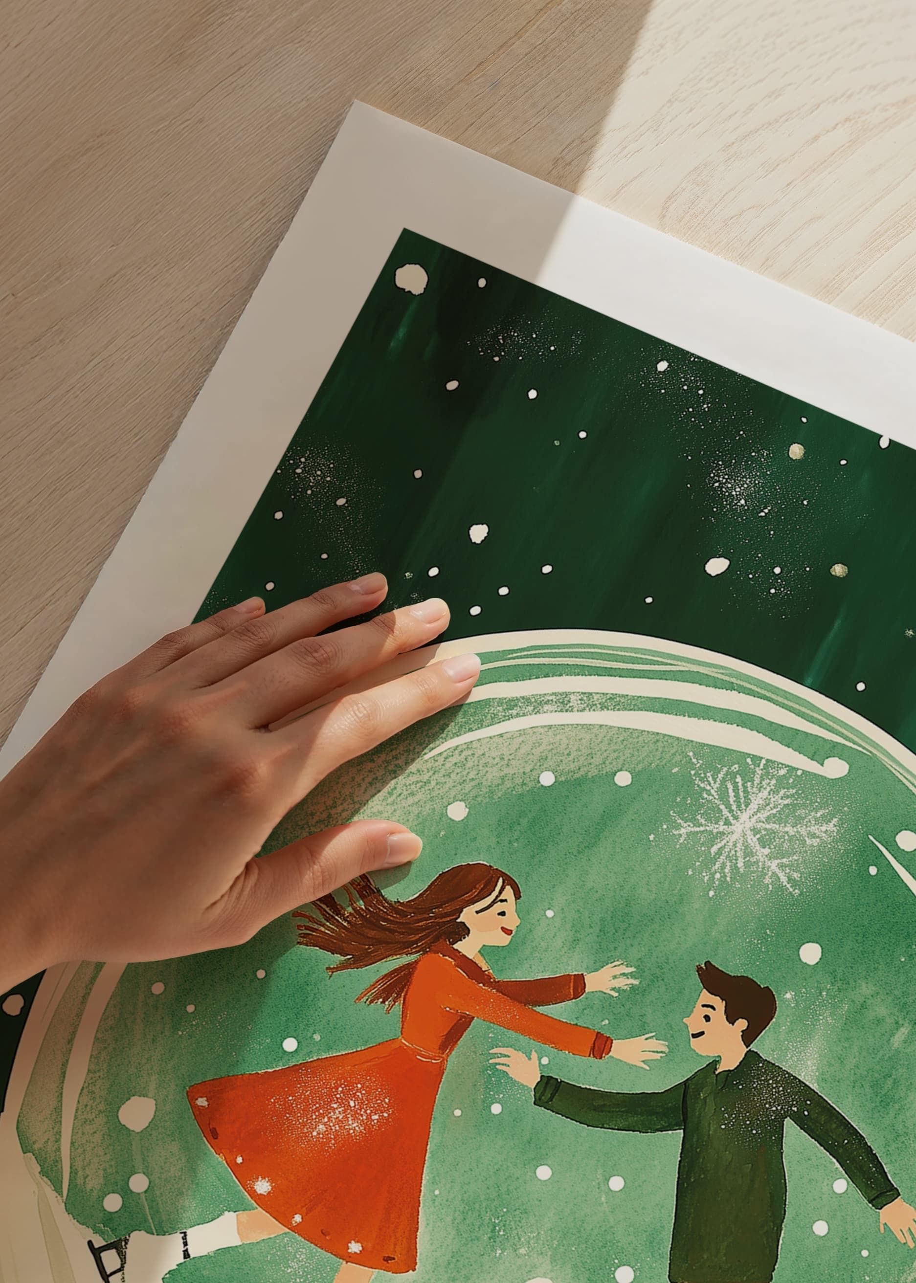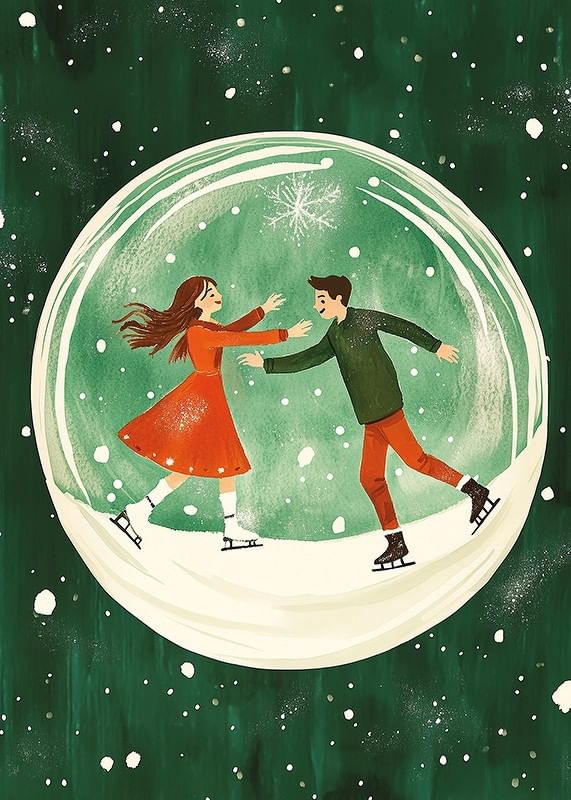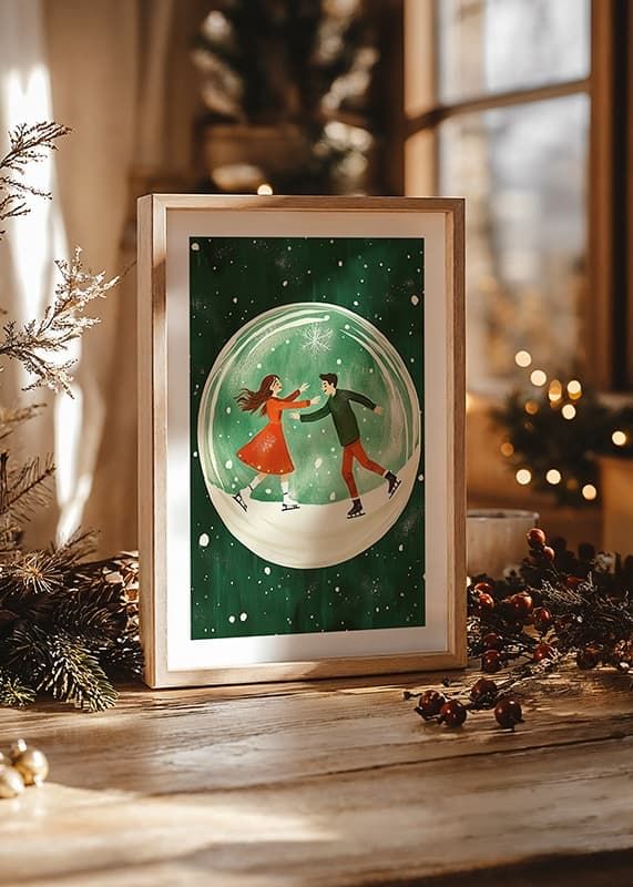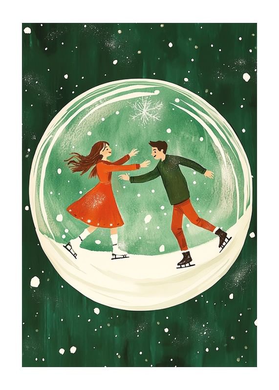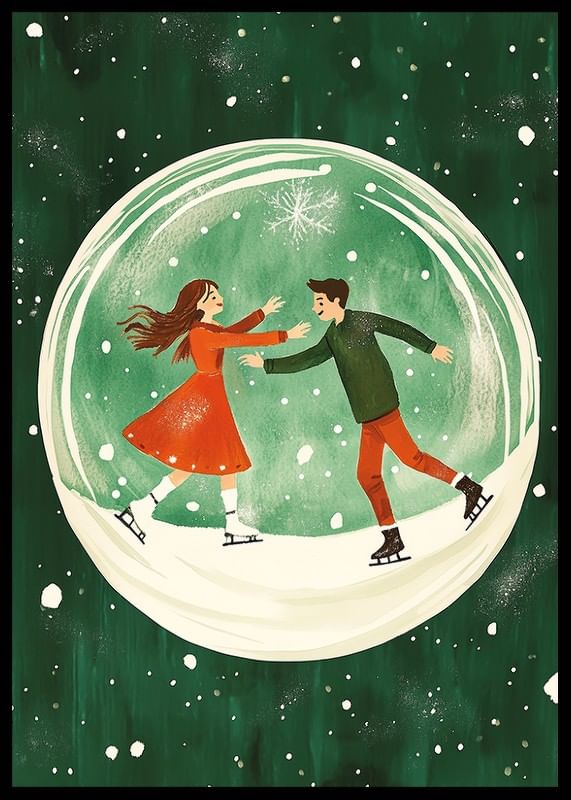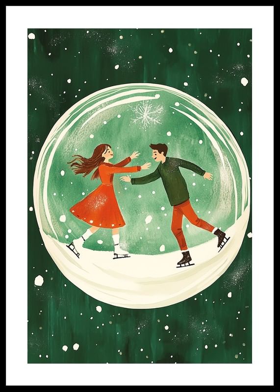 Denna charmiga poster visar ett glatt par som åker skridskor inne i en snöglob, omgivna av snöflingor och en djupgrön vinterbakgrund. Den lekfulla och nostalgiska designen sprider värme och vinterglädje, perfekt för att skapa en mysig och festlig stämning i ditt hem under vintern och julen.