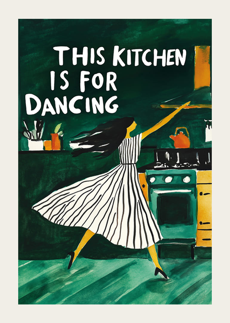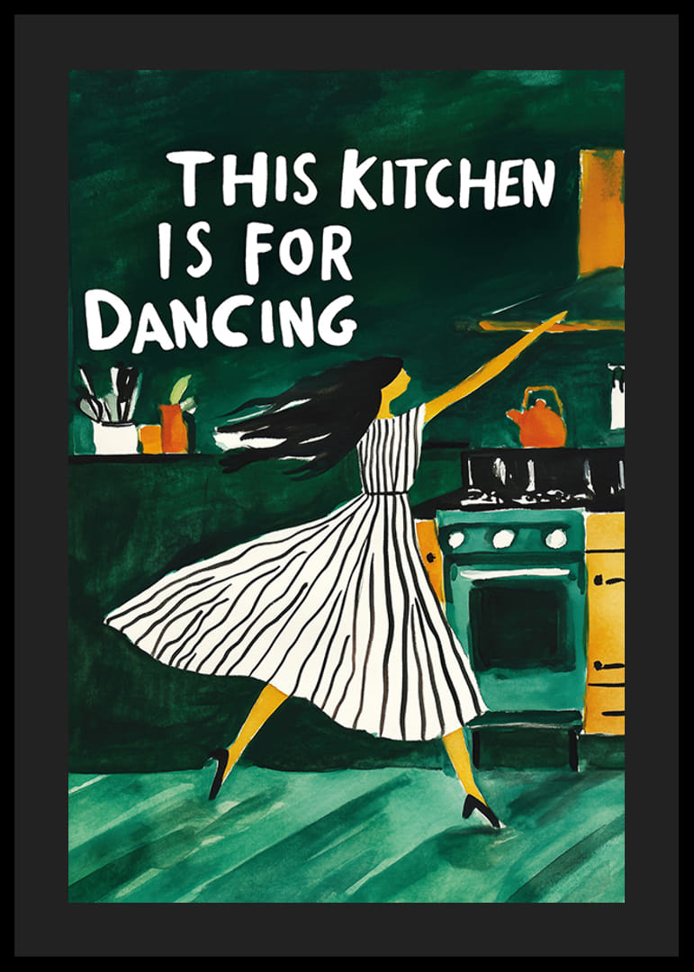 Denna lekfulla poster visar en kvinna som dansar fritt i köket, med texten "This Kitchen is for Dancing" i bakgrunden. De djupa gröna tonerna och de livliga penseldragen skapar en energifylld atmosfär som förvandlar varje kök till en plats för glädje och rörelse.