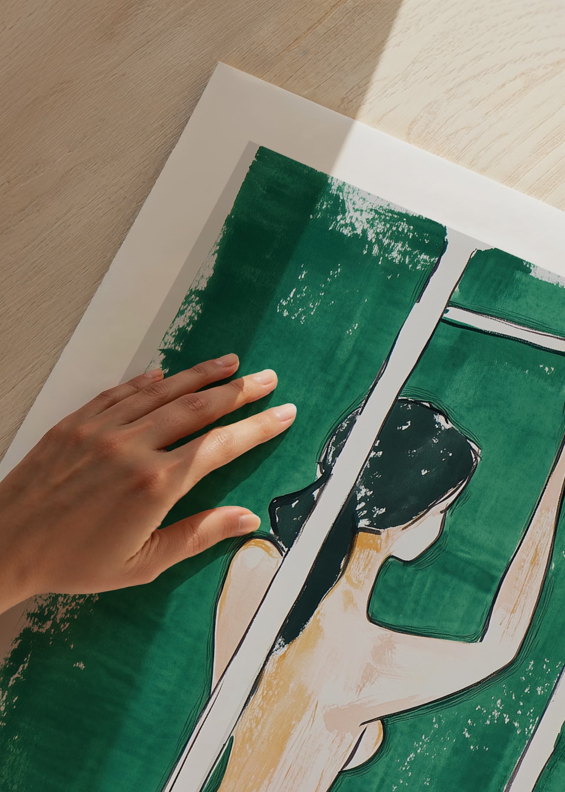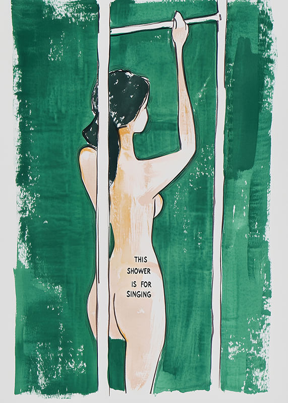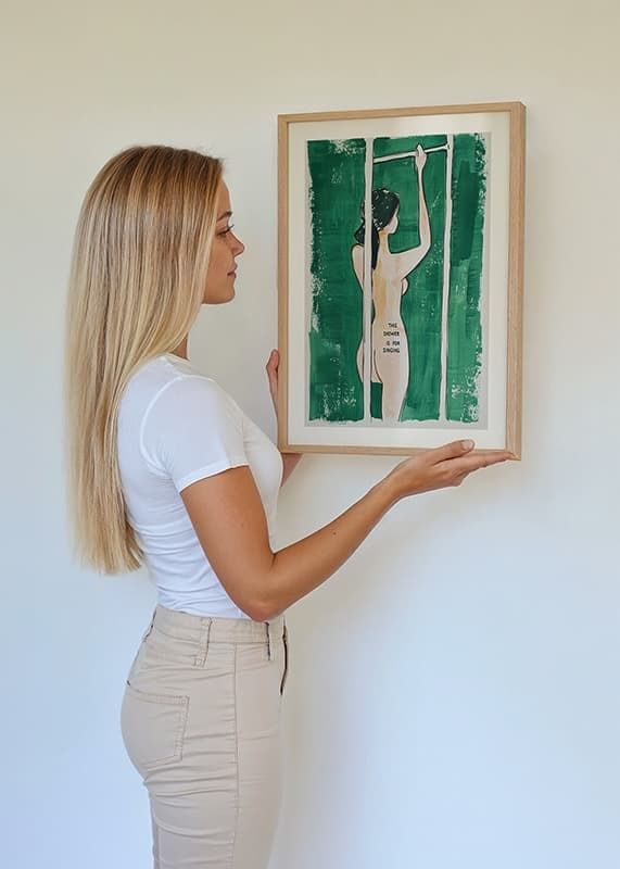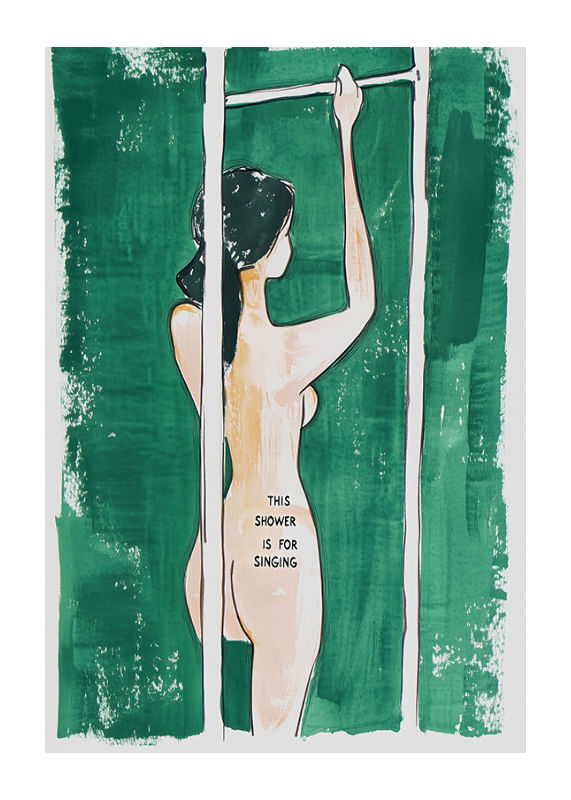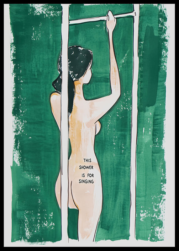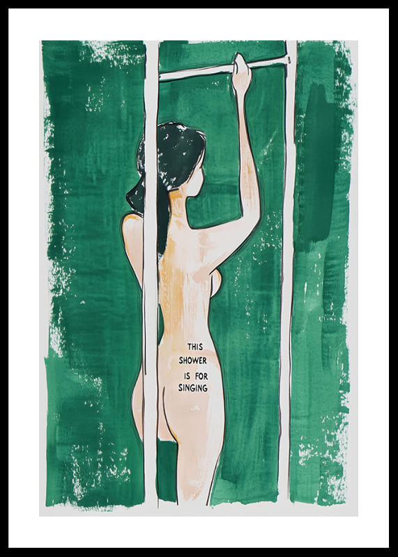 Denna stilrena och lekfulla poster visar en kvinna i duschen med texten "This Shower is for Singing" diskret placerad på ryggen. De djupa gröna tonerna och enkla penseldragen skapar en modern och avslappnad känsla.