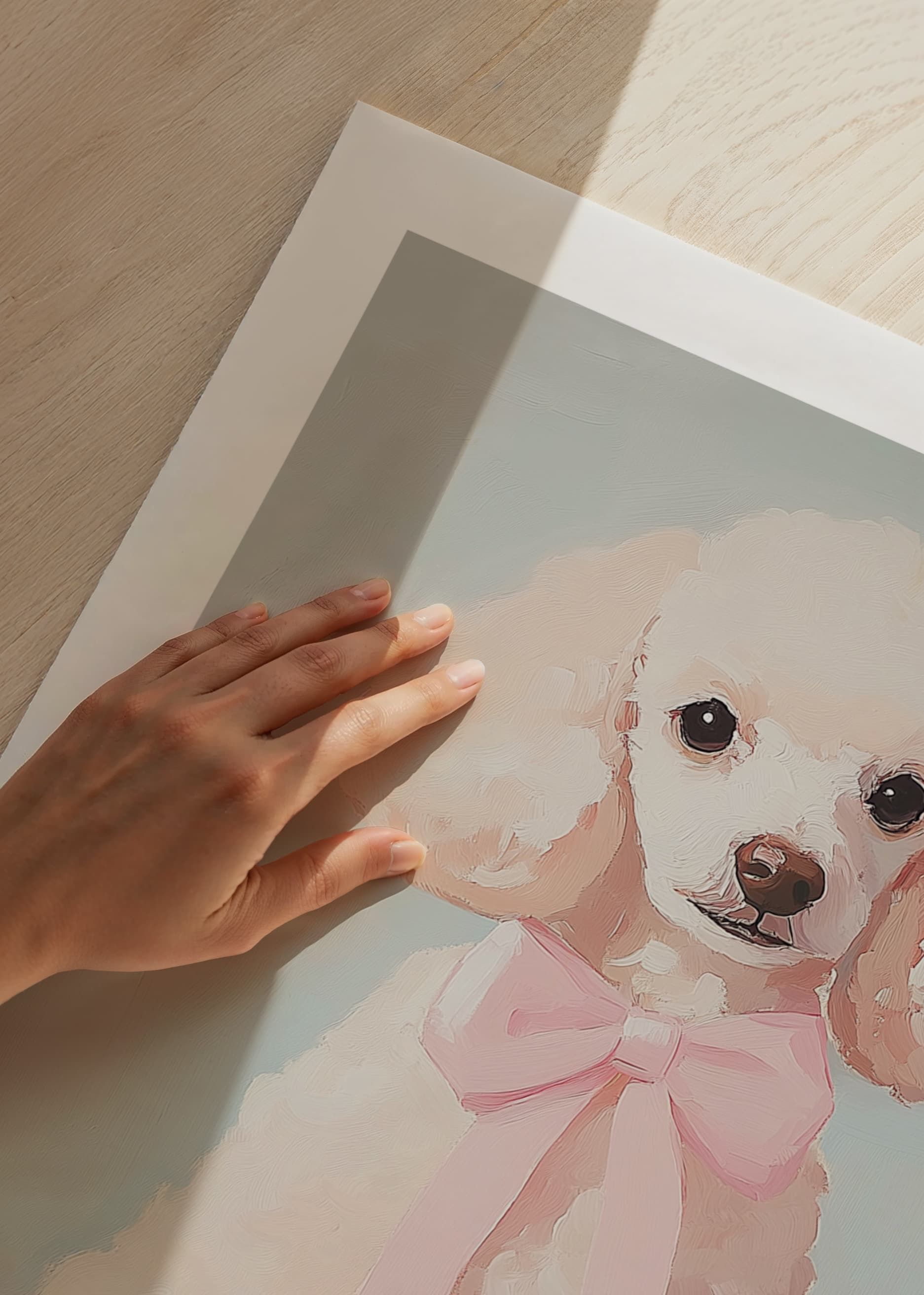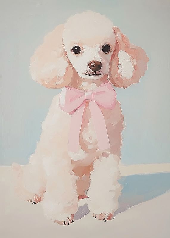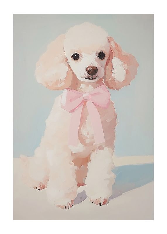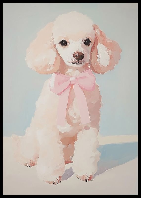 Denna bedårande poster föreställer en söt pudel med fluffig päls och en stor rosa rosett runt halsen. Den mjuka, pastellfärgade målningen sprider värme och charm, perfekt för att lysa upp vilket rum som helst.