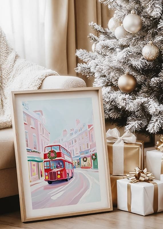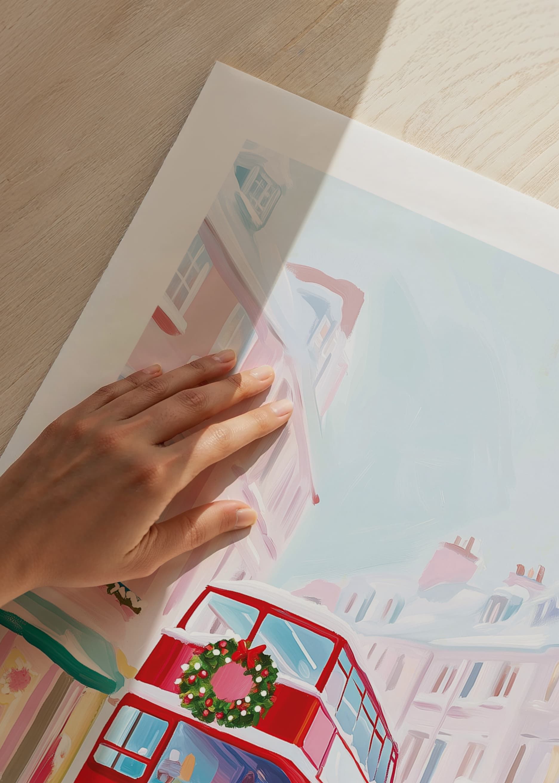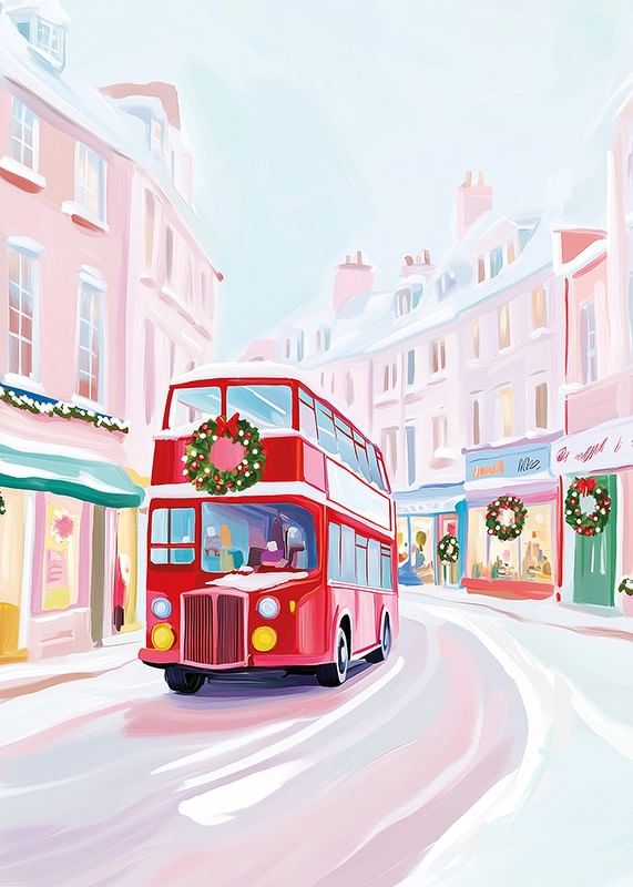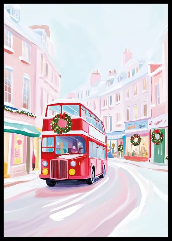 Denna stämningsfulla poster visar en klassisk röd dubbeldäckare som kör genom en snöklädd stadsgata, dekorerad med julkransar och festliga skyltfönster.