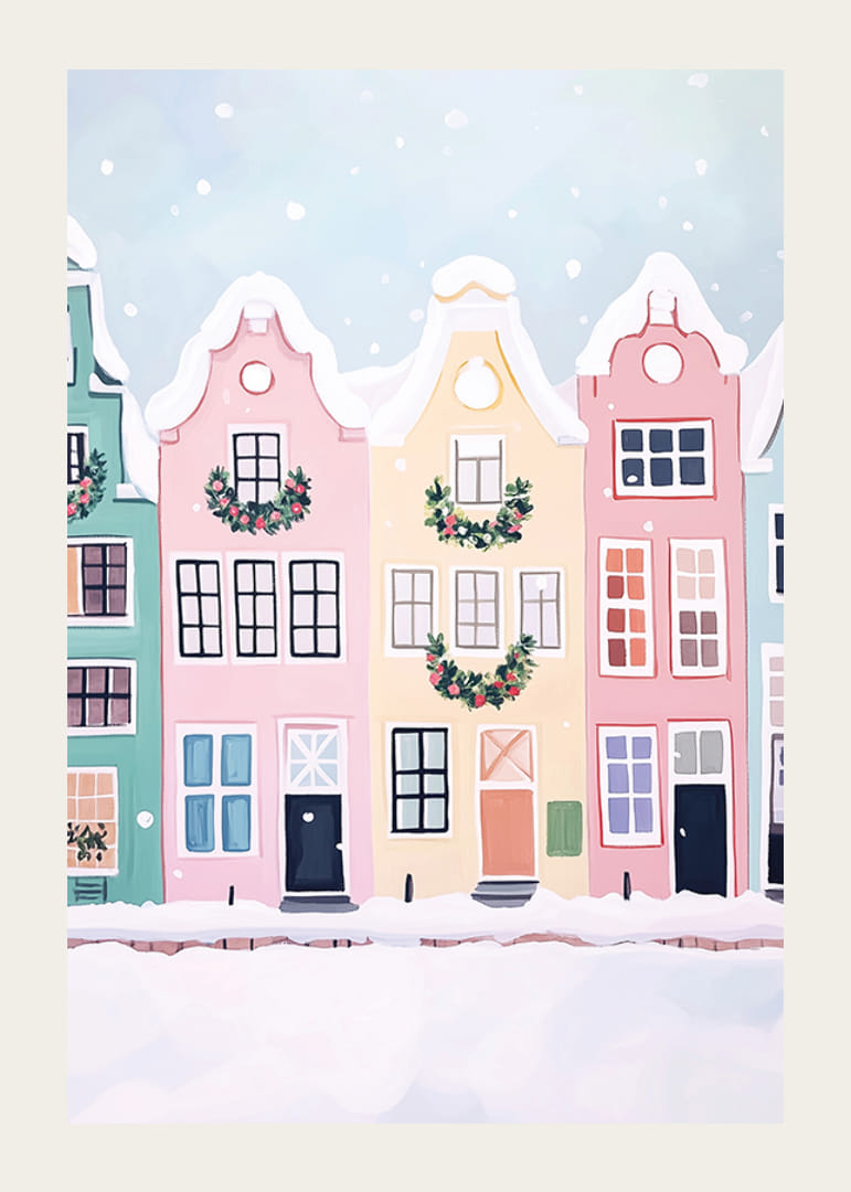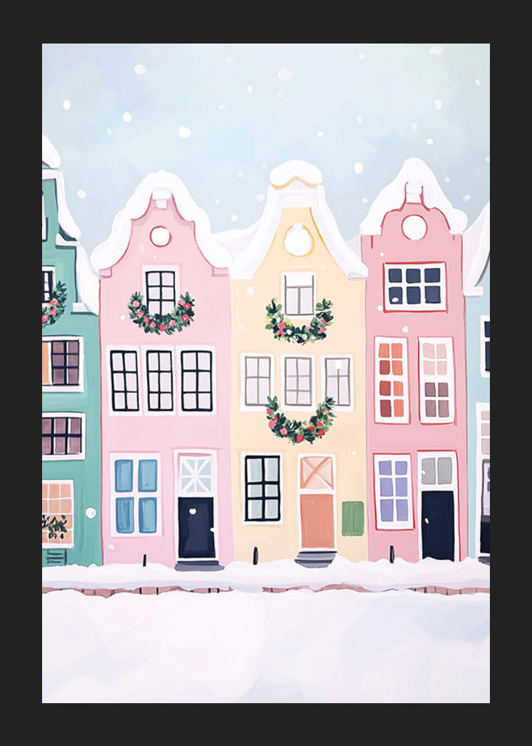 Denna charmiga poster visar en rad färgglada hus dekorerade med julkransar, täckta av mjuk, vit snö. De pastellfärgade fasaderna och de fallande snöflingorna skapar en mysig och festlig vinterkänsla.