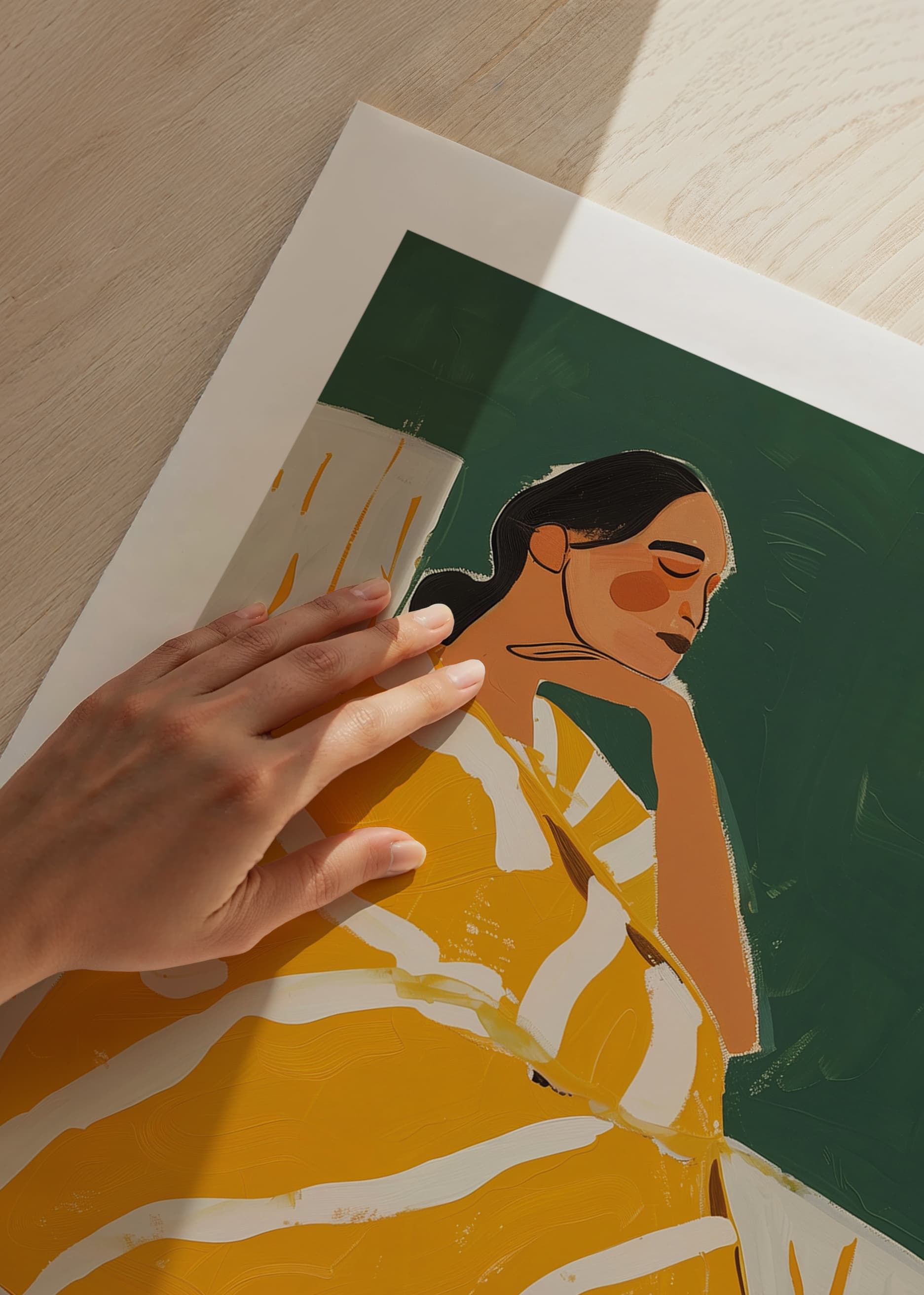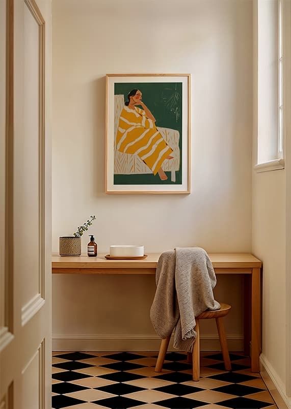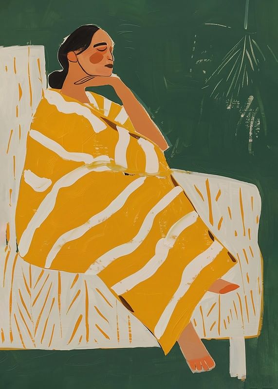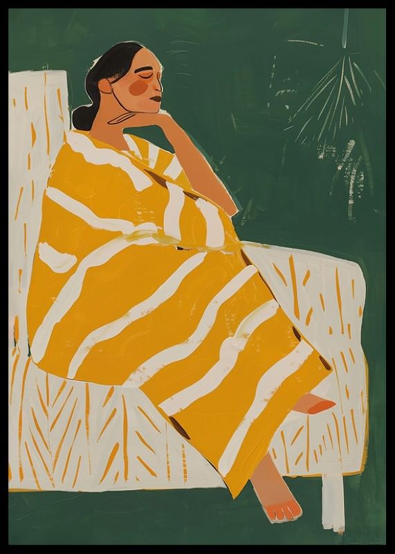 Denna stilrena poster visar en kvinna insvept i en gulrandig filt, sittandes i lugn eftertanke mot en djupgrön bakgrund. De varma färgtonerna och enkla formerna skapar en harmonisk och avslappnad känsla.