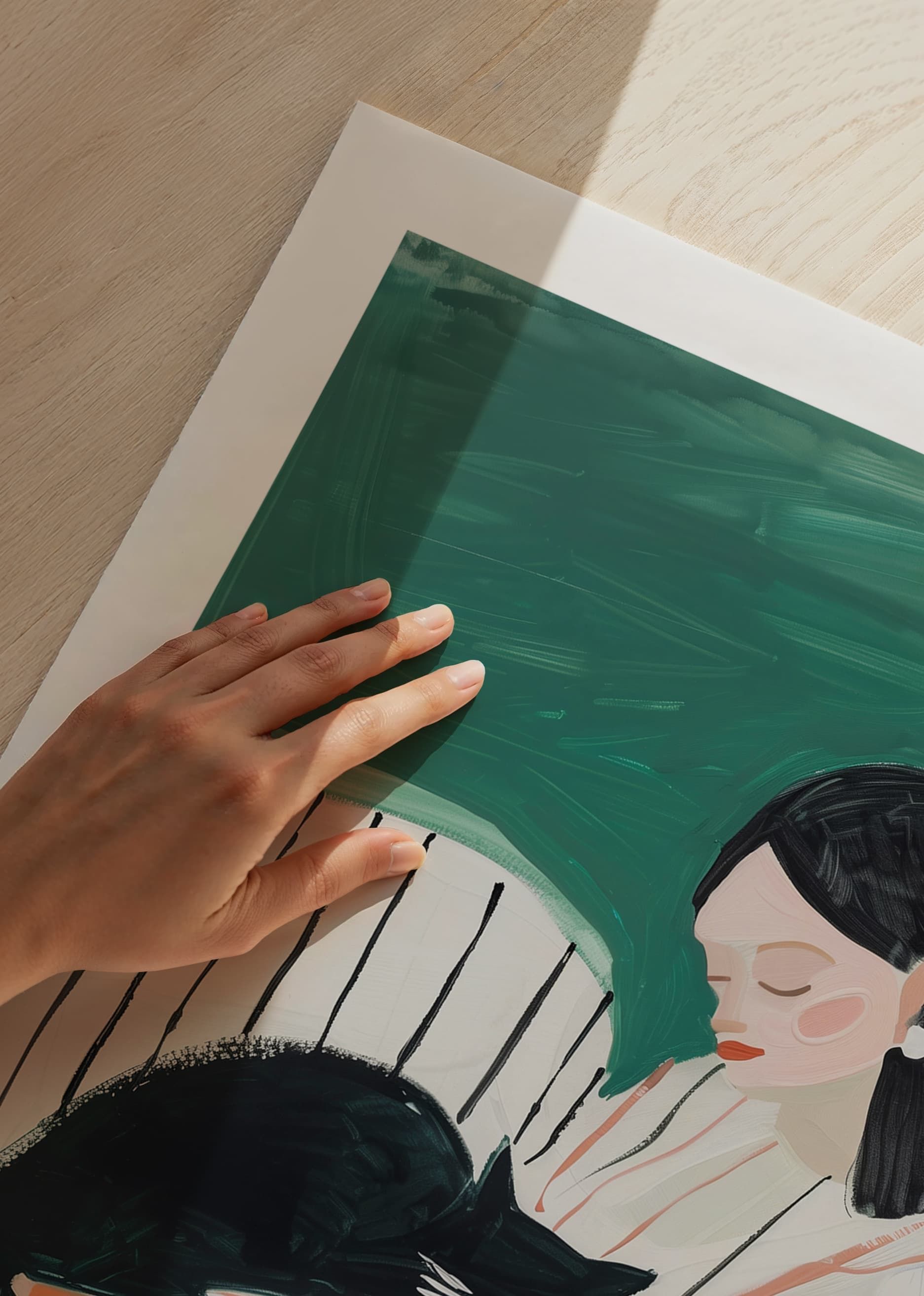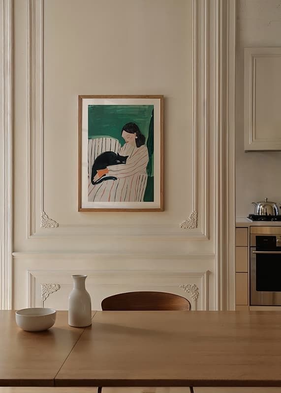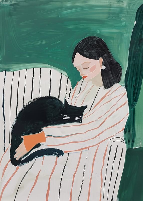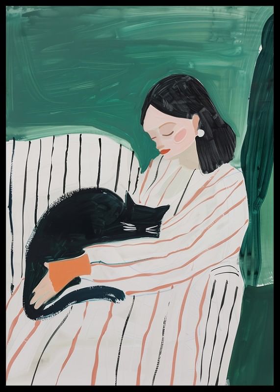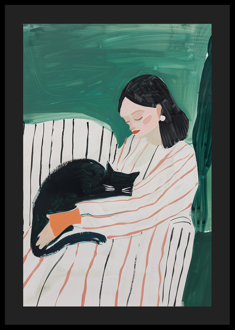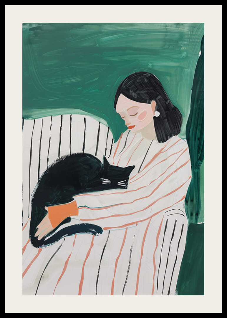 Denna vackra illustration fångar en stillsam stund av närhet mellan en kvinna och hennes svarta katt. Med mjuka färger, stilrena linjer och en rofylld atmosfär ger postern en känsla av trygghet och harmoni.