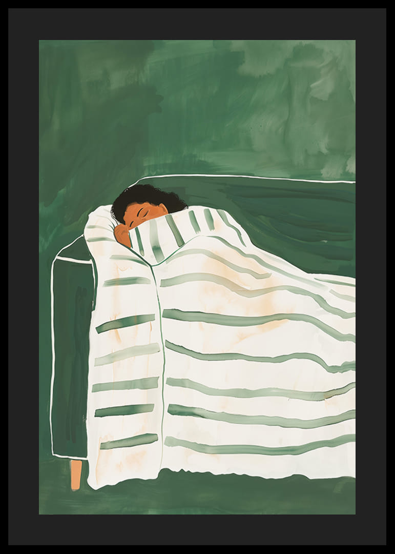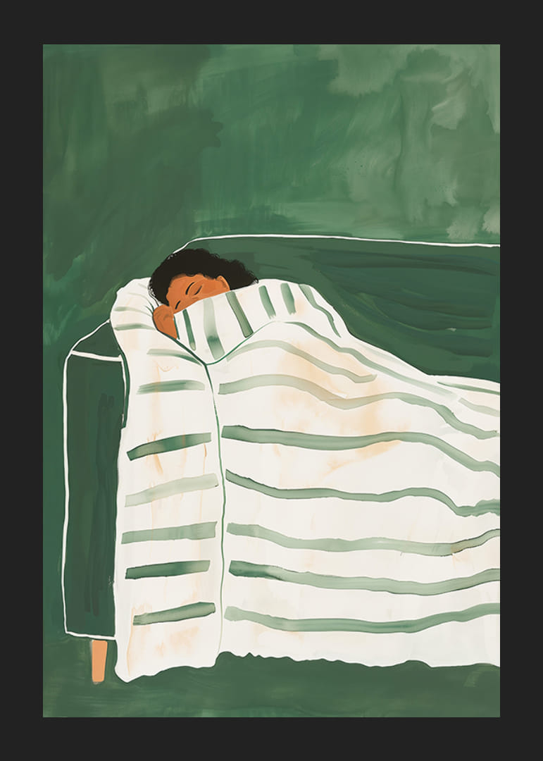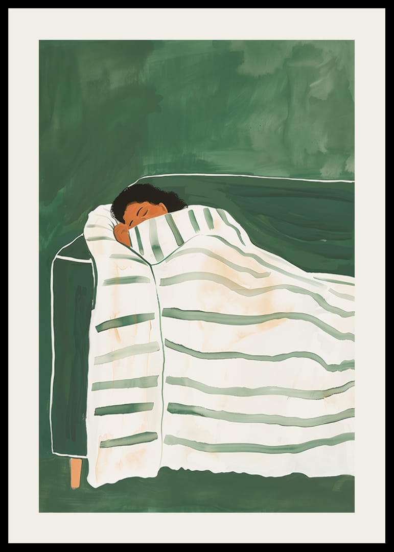 Denna vackra illustration fångar en känsla av trygghet och avkoppling. En person ligger djupt insvept i en mjuk randig filt, vilandes på en grön soffa i en harmonisk omgivning. De mjuka färgtonerna och det minimalistiska uttrycket skapar en känsla av lugn och värme.